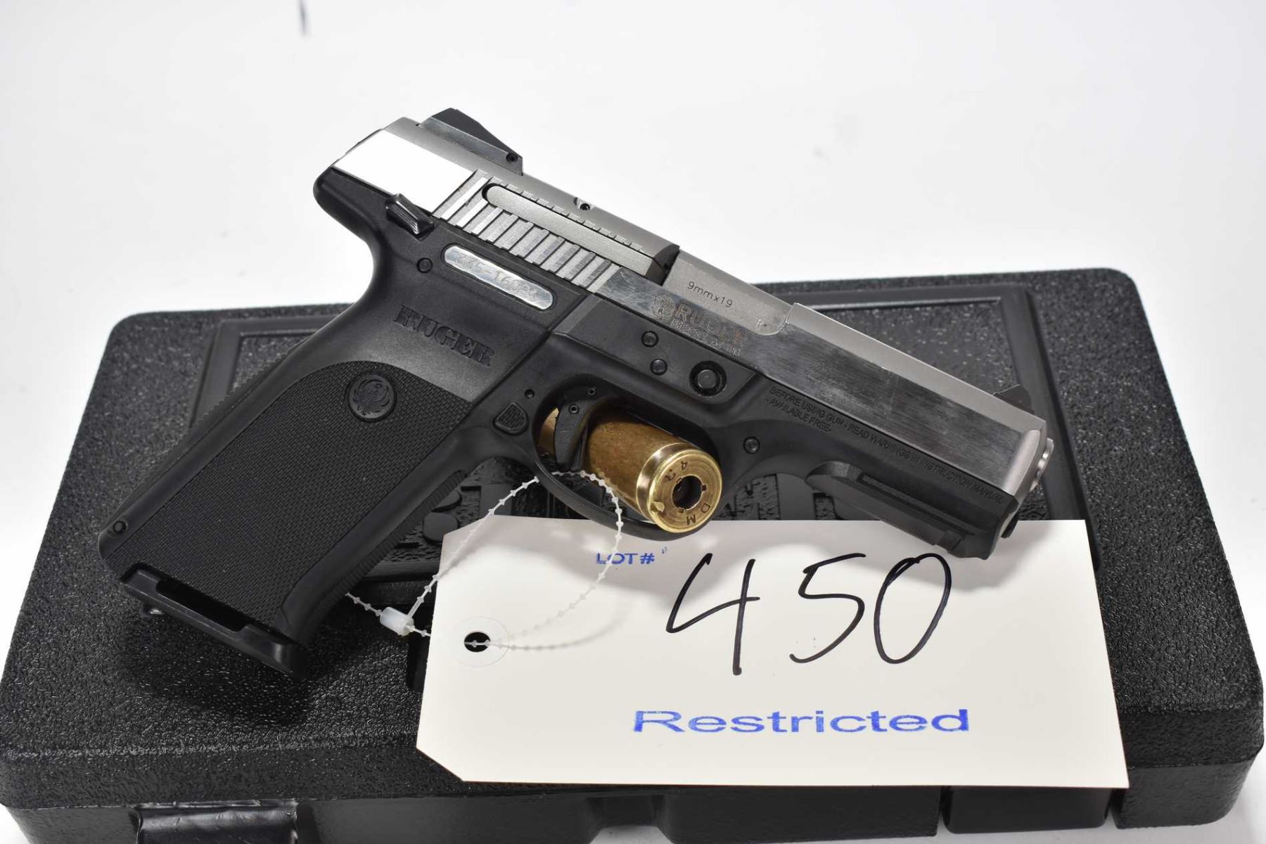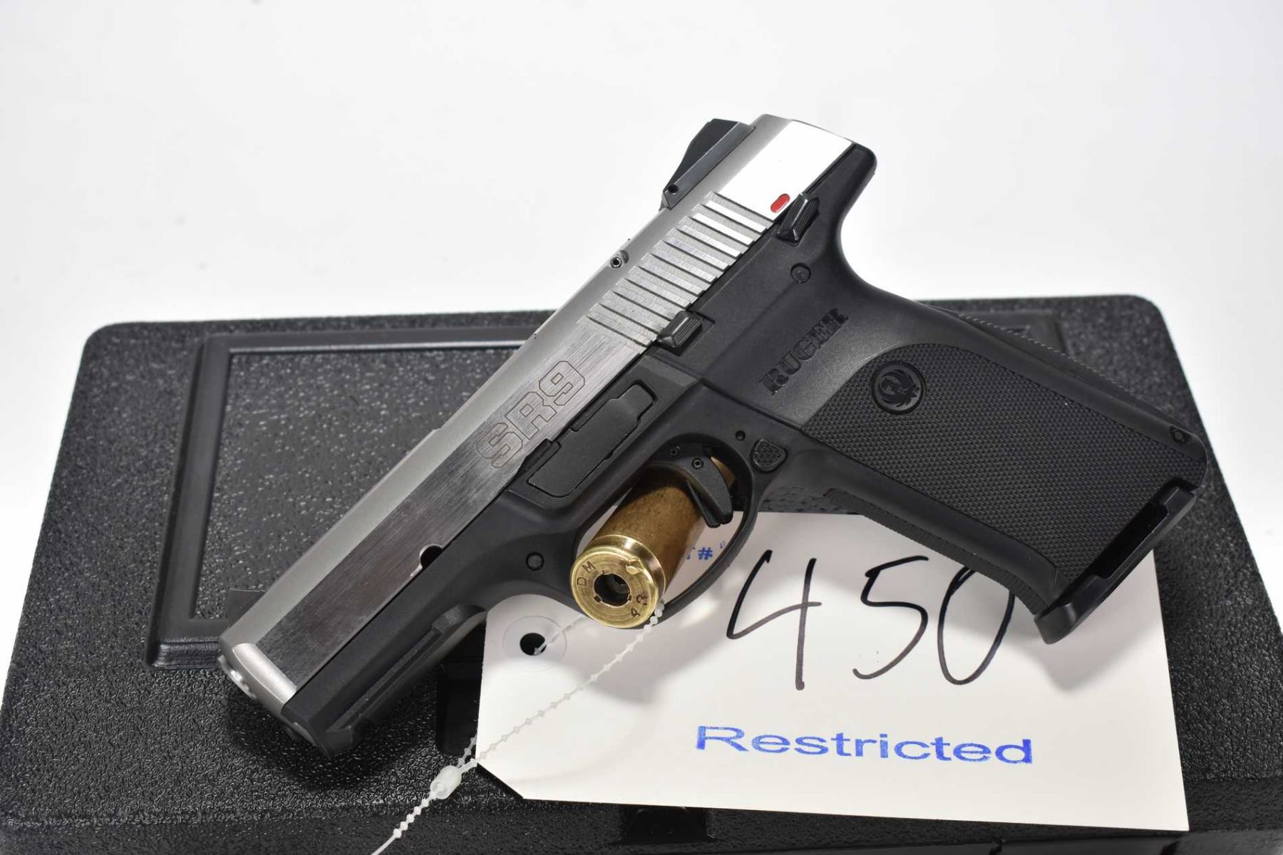 Restricted handgun Ruger model SR9, 9mm Mag fed. 10 shot semi automatic, w/ bbl length 106mm [Stainless steel slide, synthetic receiver, fixed front and adjustable rear sights. Minor handling marks, appears to have had very little use. Includes two 10 shot magazines, thumb loader and original packaging and documentation.] serial # 33516084, certificate # 17677858, FRT # 127545-2 PAL required