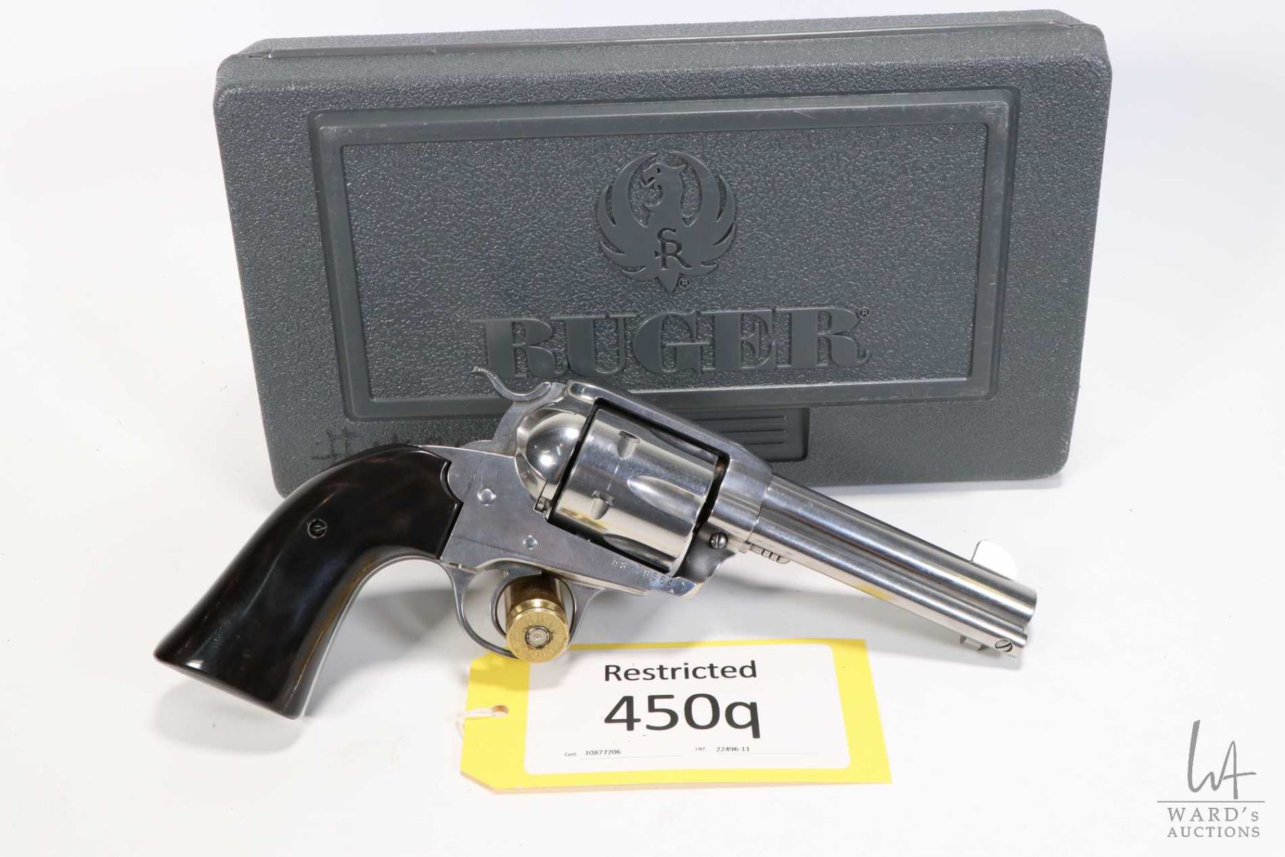 Restricted handgun Ruger model Vaquero, .45 Colt six shot single action revolver, w/ bbl length 117mm [Polished stainless steel. Fixed sights. High polish smooth grips. Slight cylinder ring and minor use, handling and storage marks. Mechanical operation including indexing appears excellent. Includes original manual, box and lock.] serial # 5878564, certificate # 10877206, FRT # 22496-11 PAL required