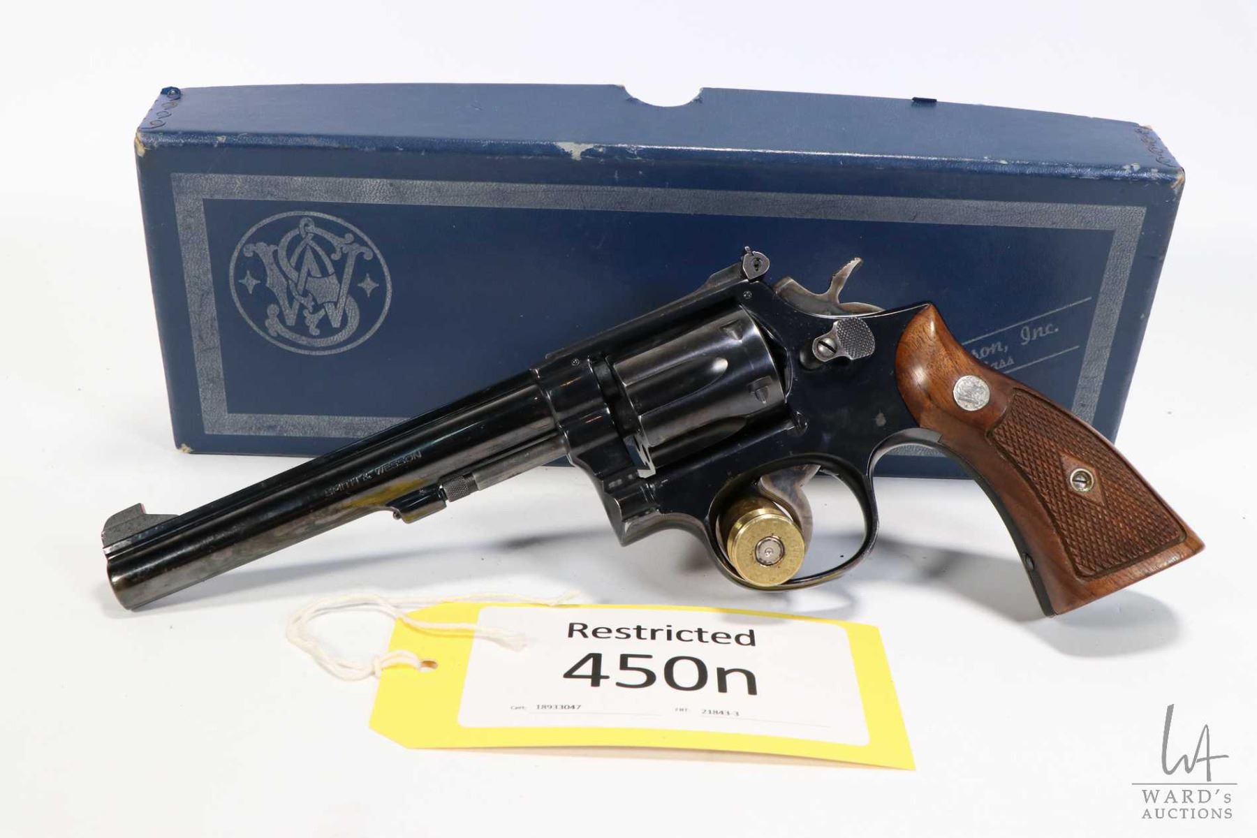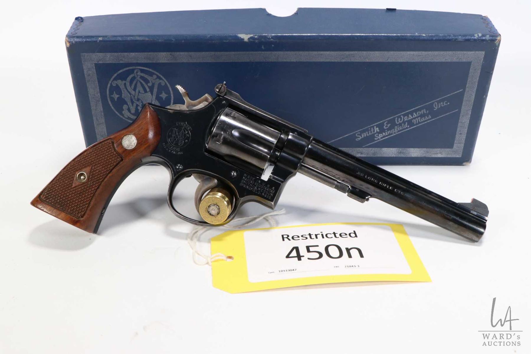 Restricted handgun Smith & Wesson model 17-2, .22 LR six shot double action revolver, w/ bbl length 152mm [Blued finish. Fixed front and adjustable rear sights. Branded checkered walnut grips. Slight cylinder ring. Minor use, storage and handling marks. Includes original box with screwdriver.] serial # K631906, certificate # 18933047, FRT # 21843-3 PAL required