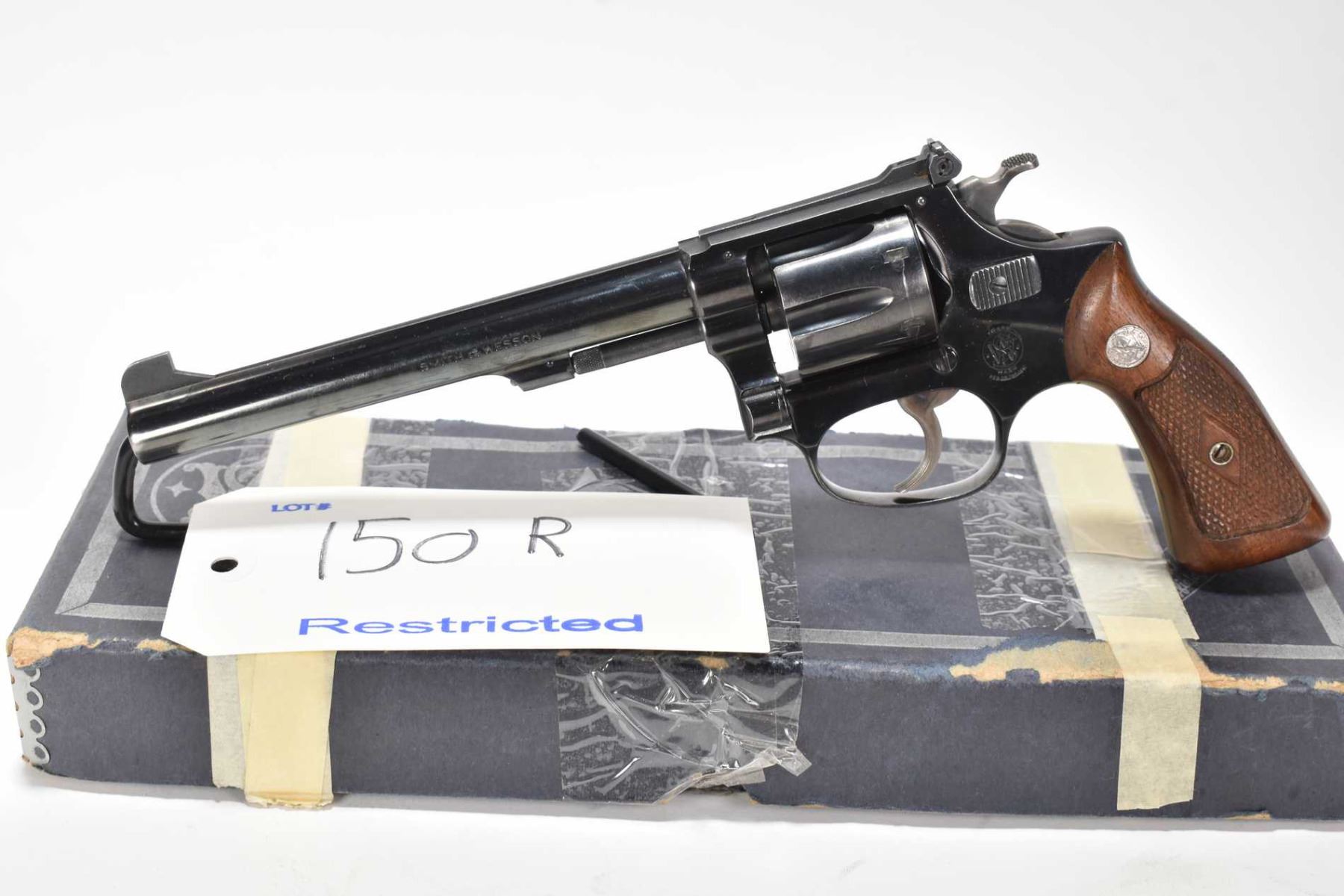 Restricted handgun Smith & Wesson model 35 Target, .22 LR 6 shot double action revolver, w/ bbl length 151mm [Blued finish. Fixed front and adjustable rear sight. Wear in holster, handling and use areas. One side plate screw is not original. Checkered wooden Smith & Wesson logo grips. Includes original well worn box. Marks and nicks to wood and metal.] serial # 23193, certificate # 19603604, FRT # 21854-2 PAL required