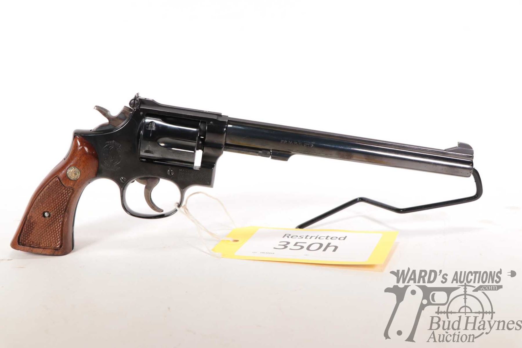Restricted handgun Smith & Wesson model 48-4, 22 MRF six shot double action revolver, w/ bbl length 213mm [Blued finish, fixed front and adjustable rear sights. Branded checkered wooden grips. Mechanically appears near excellent. Minor finish wear in use and handling areas plus a couple bluing blemishes on left of barrel. Other use, handling and storage marks.] serial # 19K5819, certificate # 18630418, PAL required