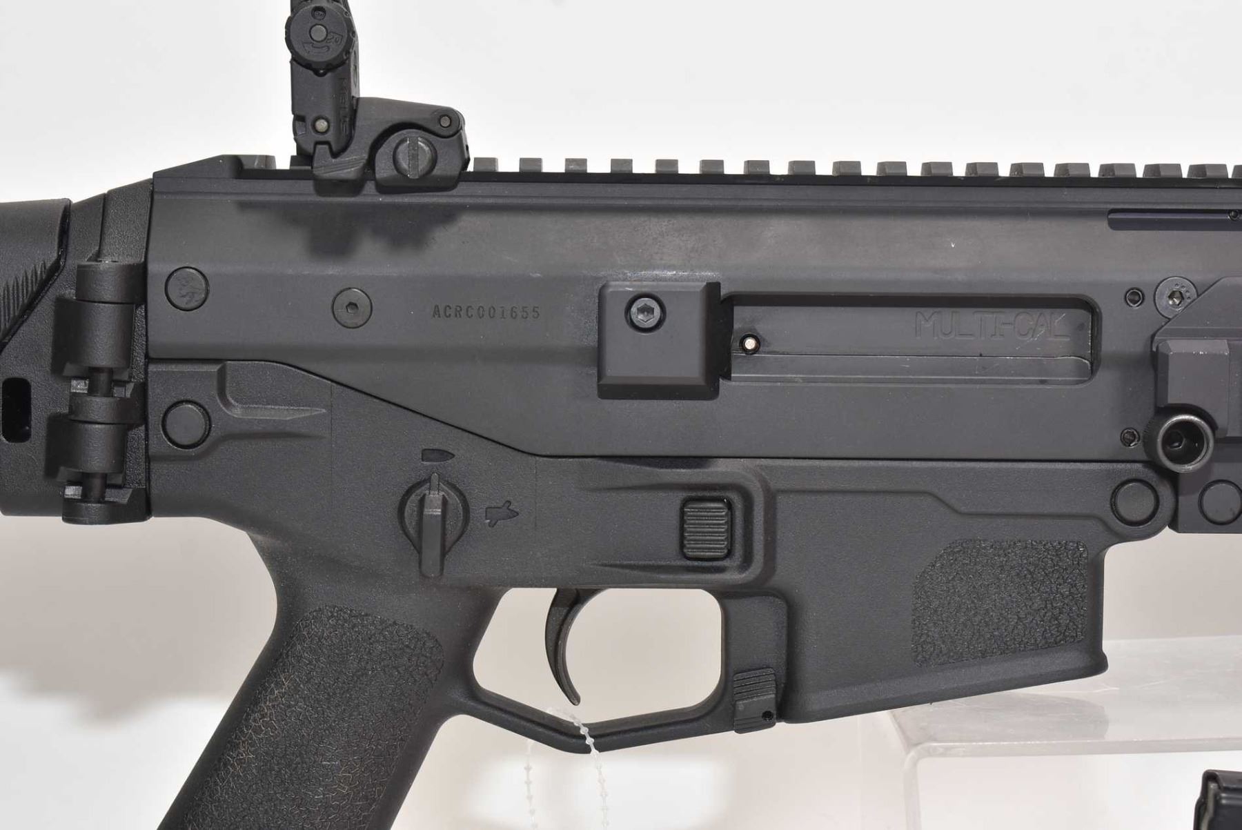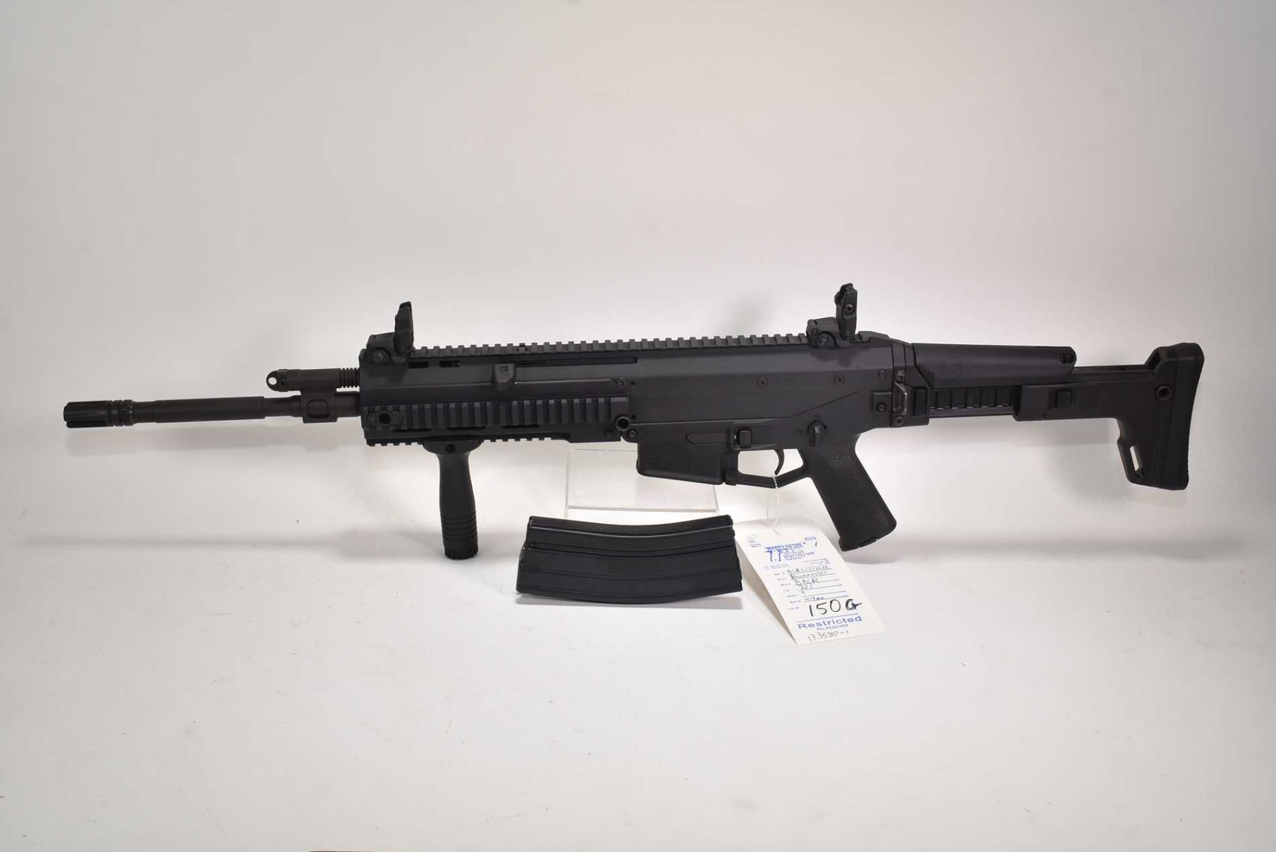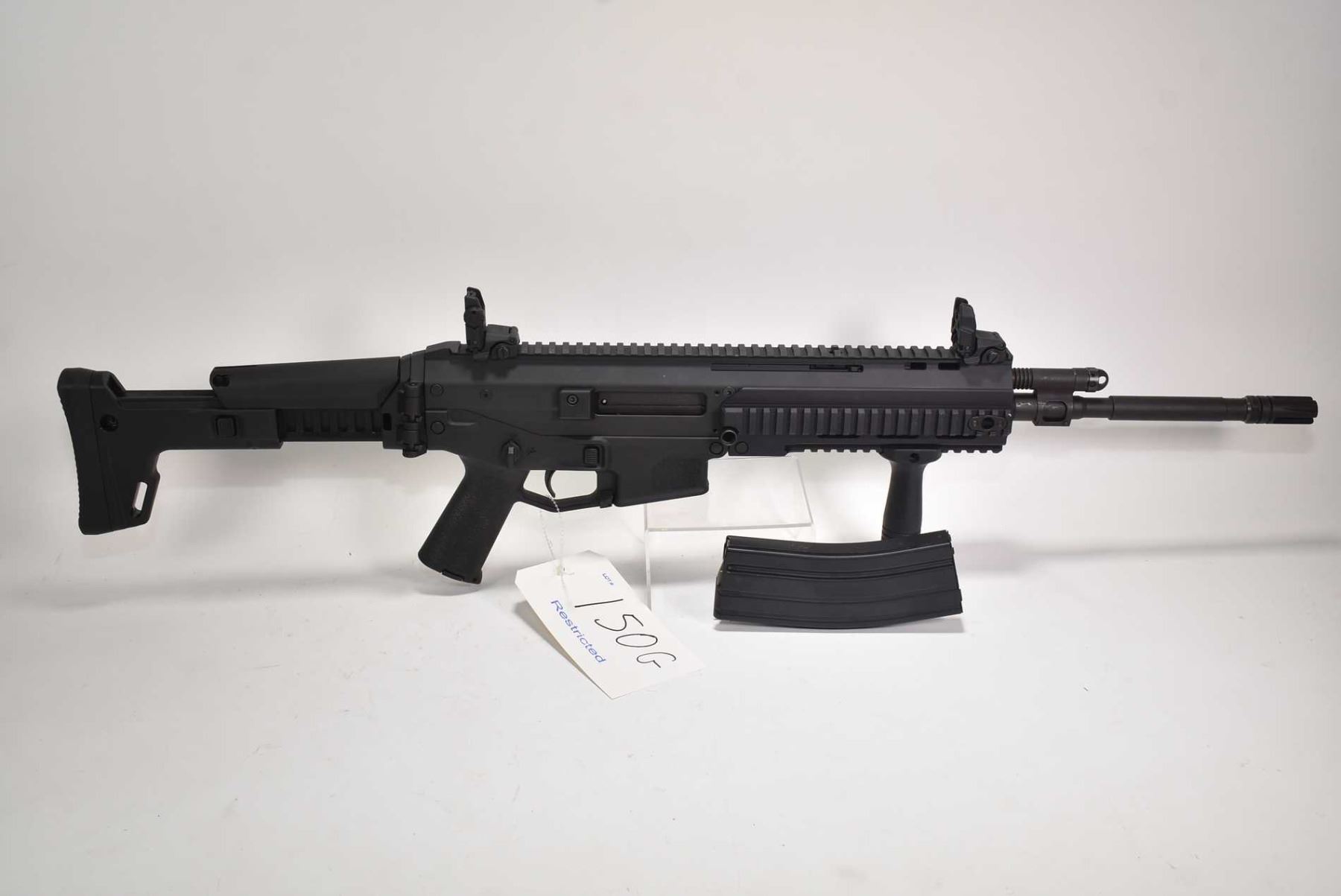 Restricted rifle Bushmaster model BACR, .223 Rem five shot semi automatic, w/ bbl length 419mm [Parkerized style finish, full flat top fitted with Magpull adjustable front and rear sights, stock is both folding and adjustable. Fitted with weakhand pistol grip, includes one 30 round pinned to 5 magazine. Appears to have had virtually no use with only minor handling marks] serial # ACRC 001655, certificate # 17279149, FRT # 133580-1 PAL required