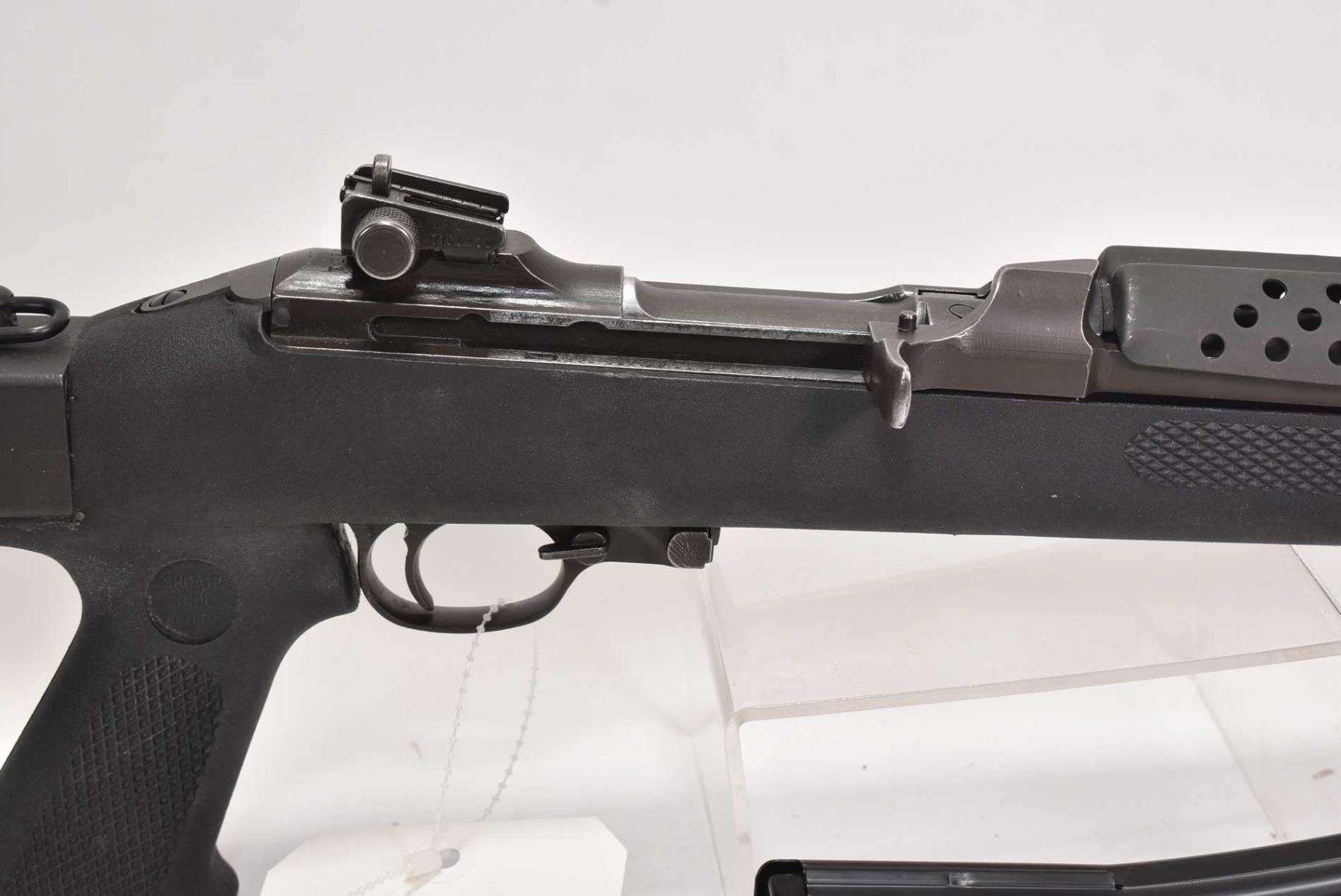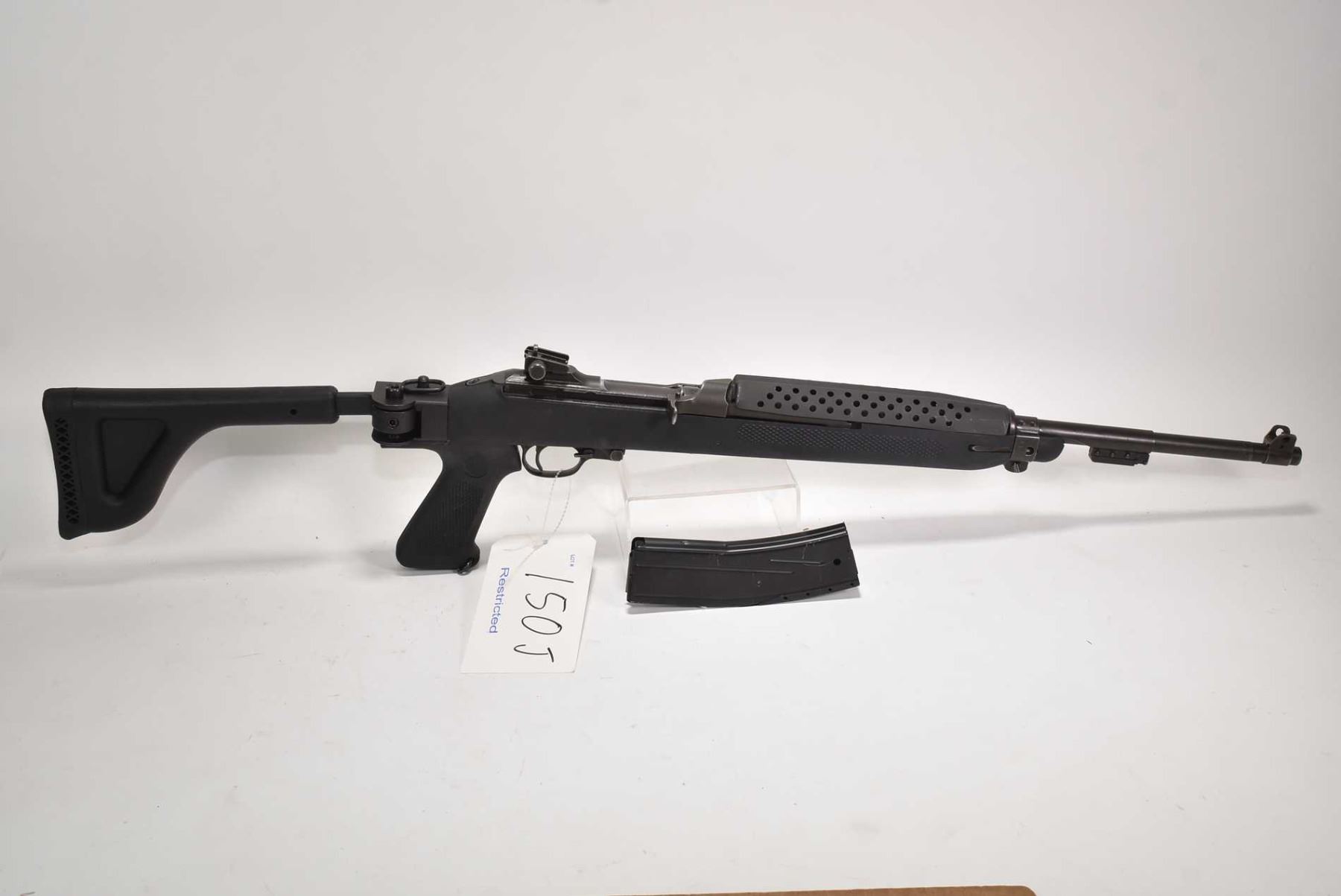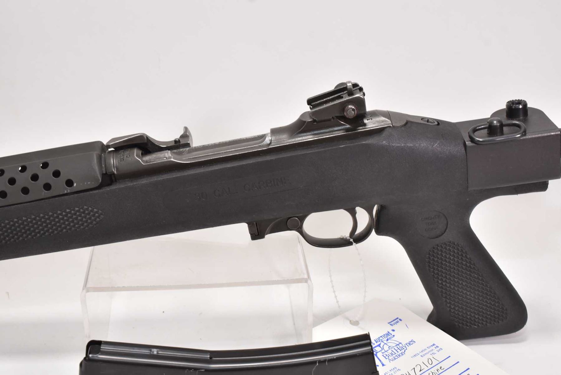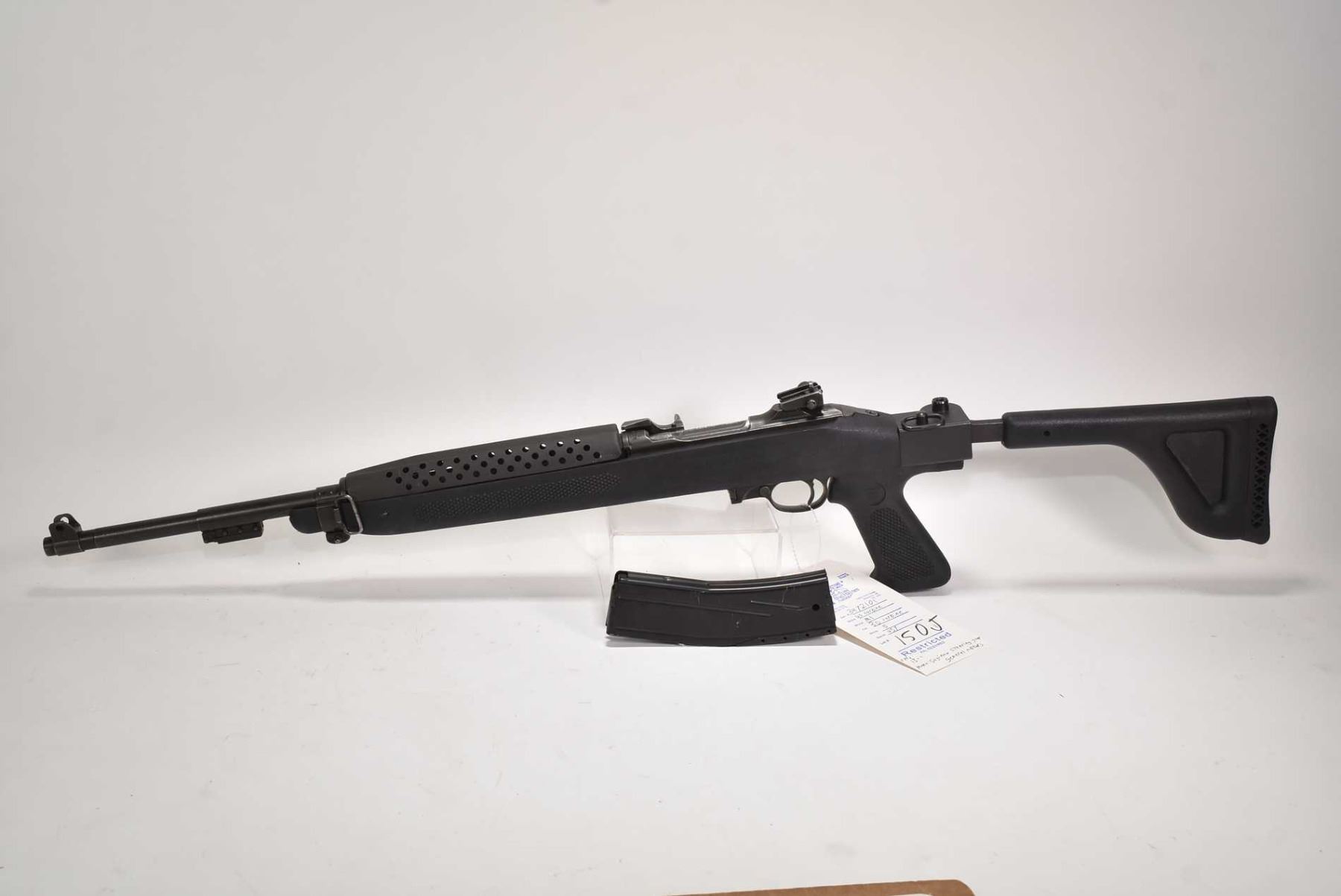 Restricted rifle US Carbine model M-1, .30 Cal five shot semi automatic, w/ bbl length 457mm [Parkerized style finish on barrel and receiver, manufactured by Saginaw Steering Gear General Motors. Folding synthetic stock made by Choate. Fixed front and adjustable rear sights. Includes one magazine pinned to five rounds, action feels smooth, use and handling marks on stock and barrel.] serial # 3472101, certificate # 19128100, FRT # 13-1 PAL required