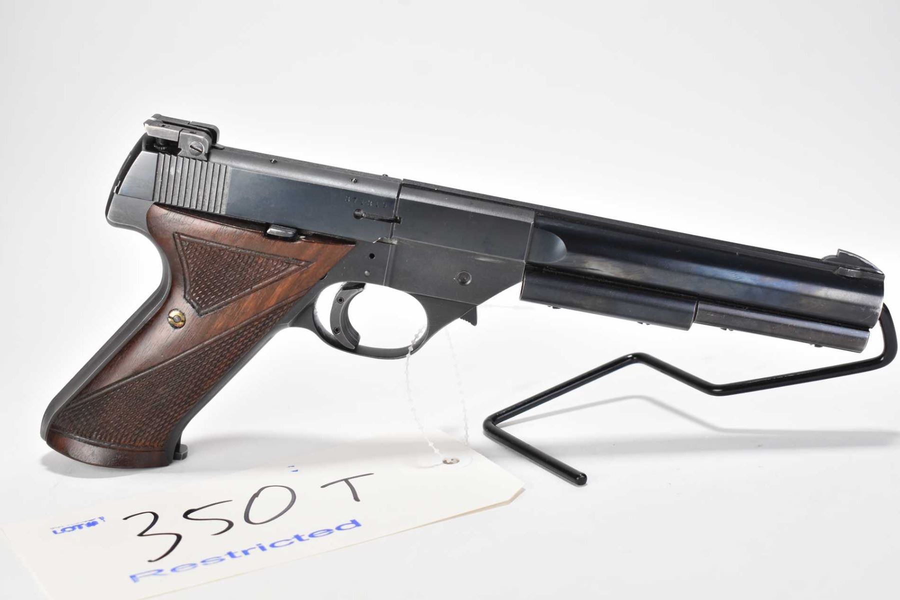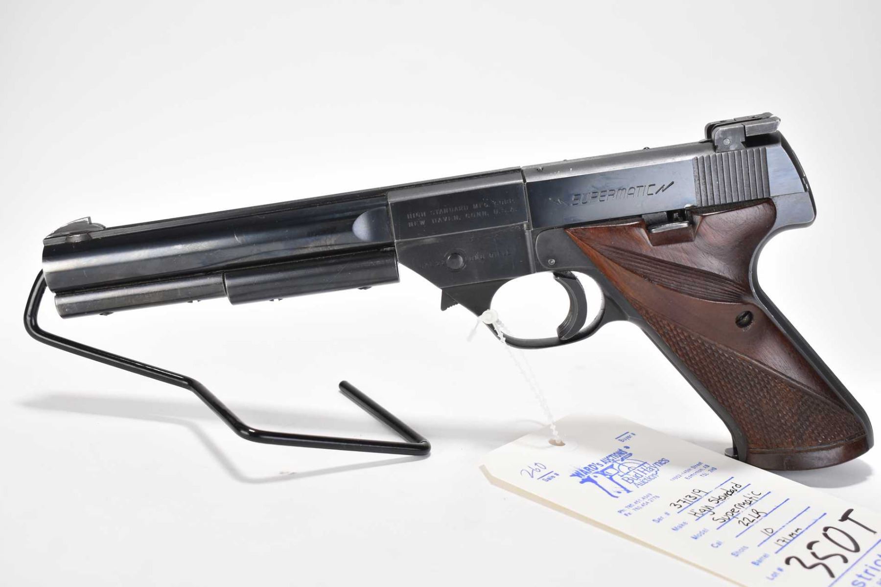 Restricted shotgun High Standard model Supermatic, .22 LR 10 shot semi automatic, w/ bbl length 171mm [Blued finish. Fixed front and adjustable rear sights. Checkered wooden grips. Includes one 10 shot magazine. Removable barrel weights. Use and handling marks. Note currently registered incorrectly, expect delays in transfer.] serial # 371319, certificate # 18641869, FRT # 31921-2 PAL required