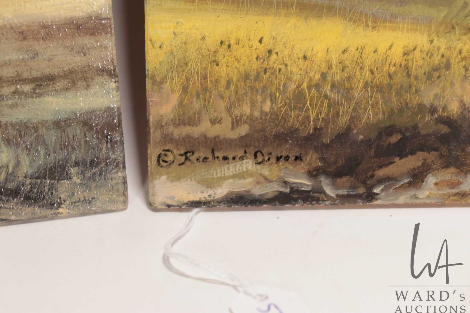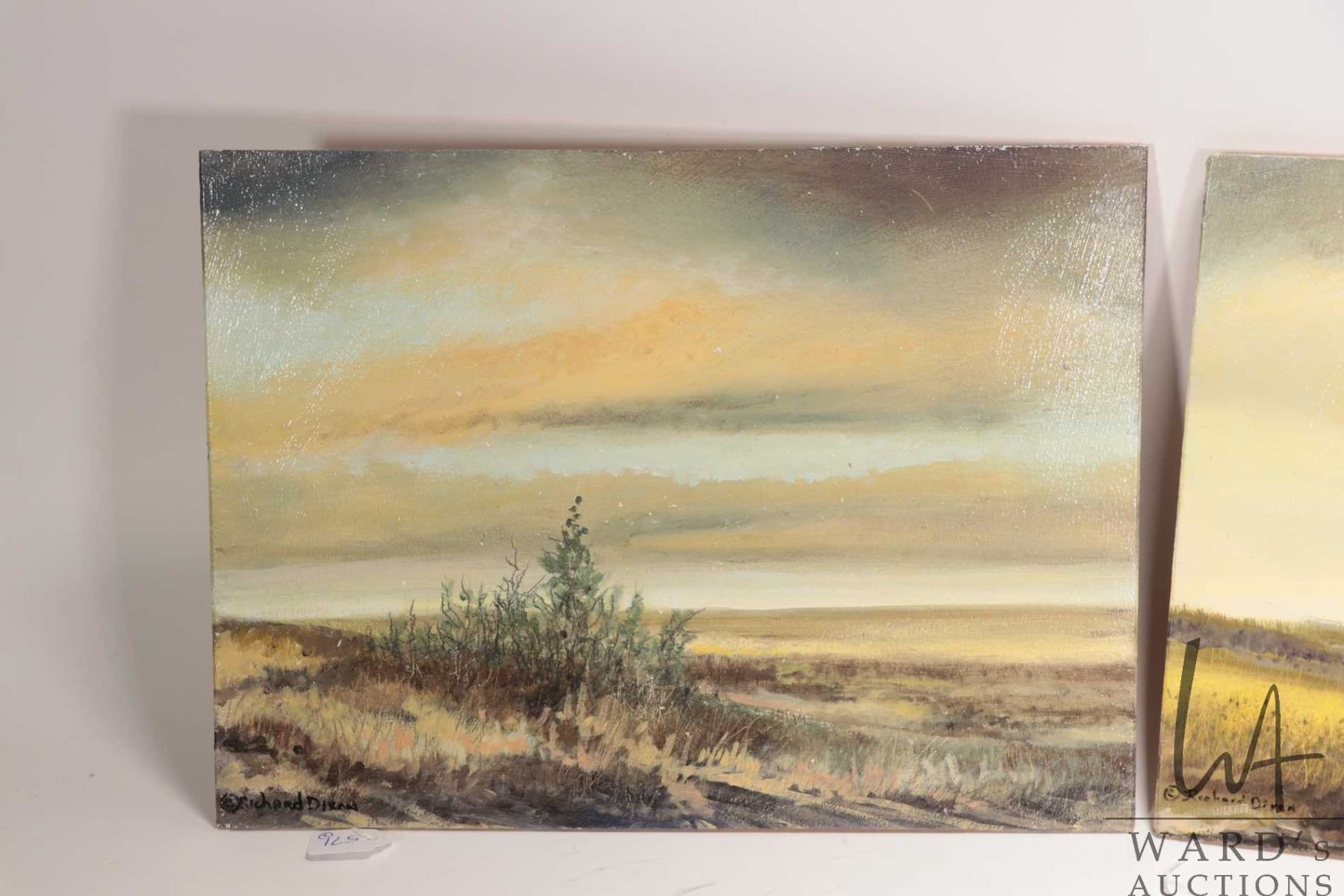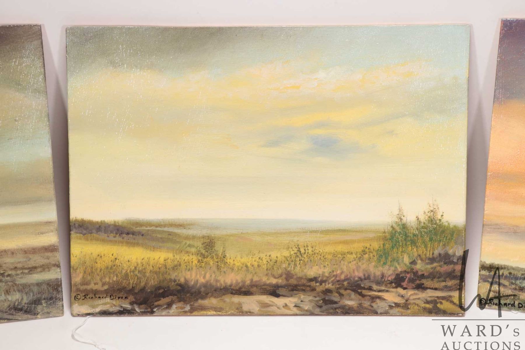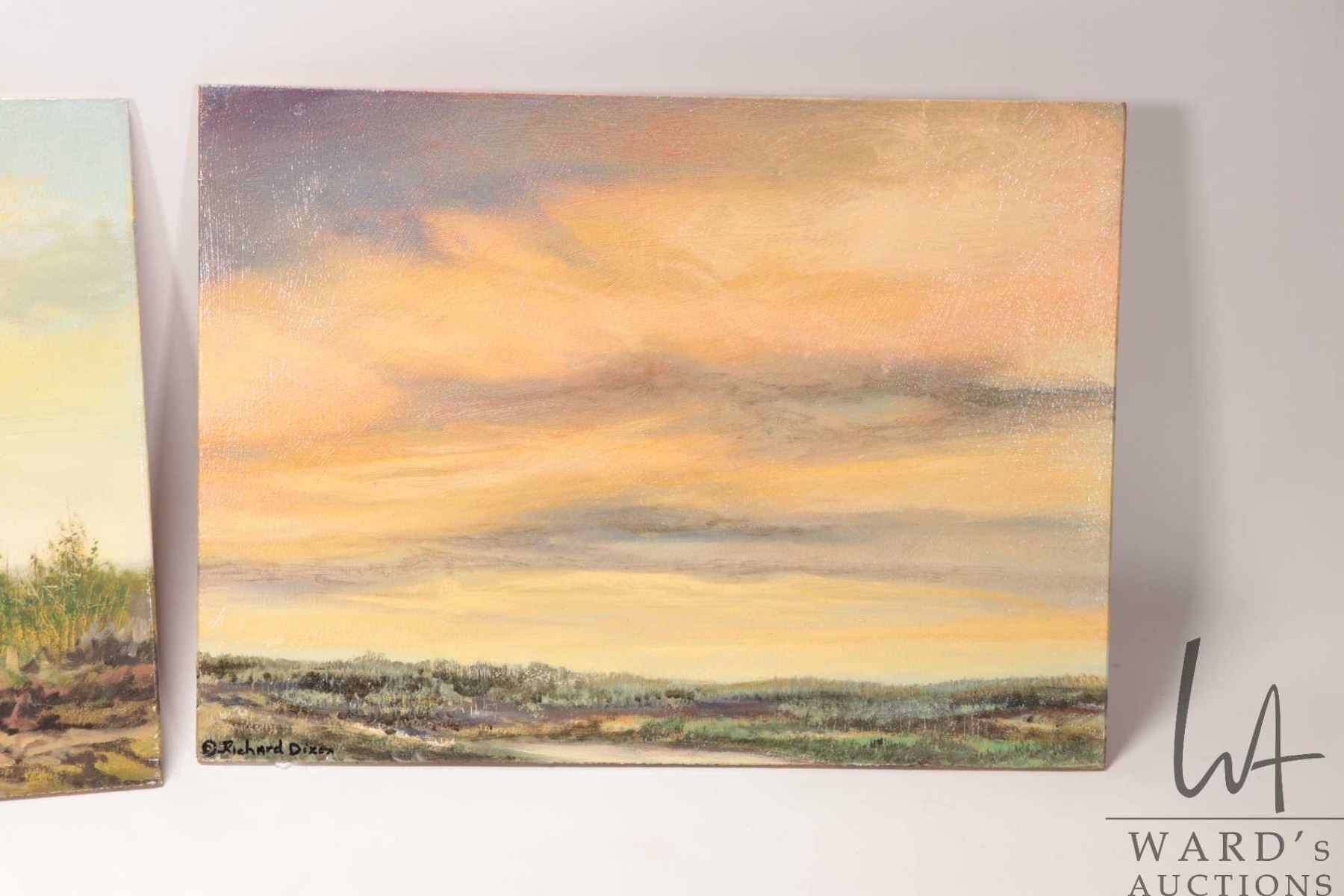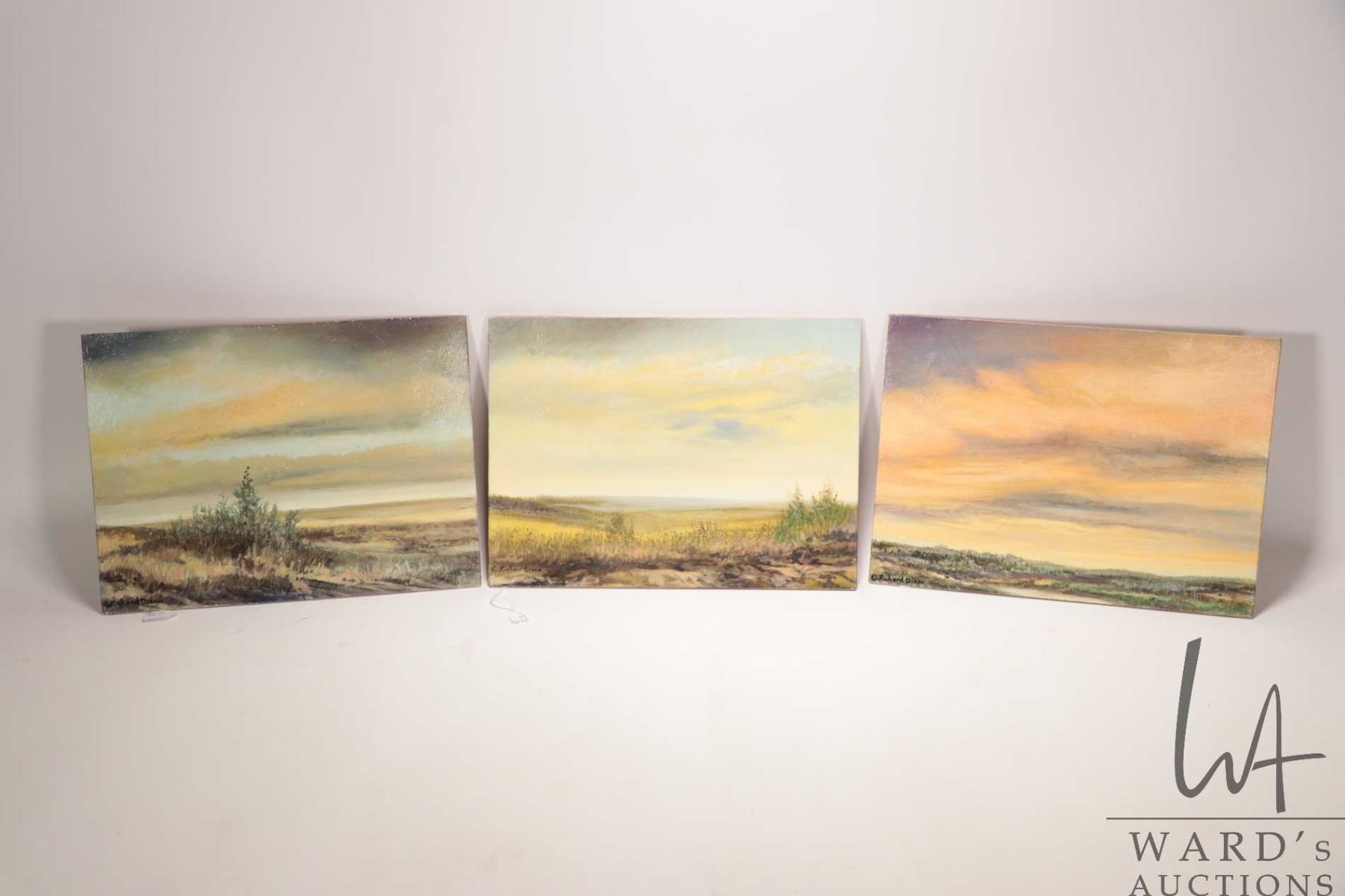Richard Dixon, three unframed acrylic on board painting of Alberta skylines, artist signed, each 9"