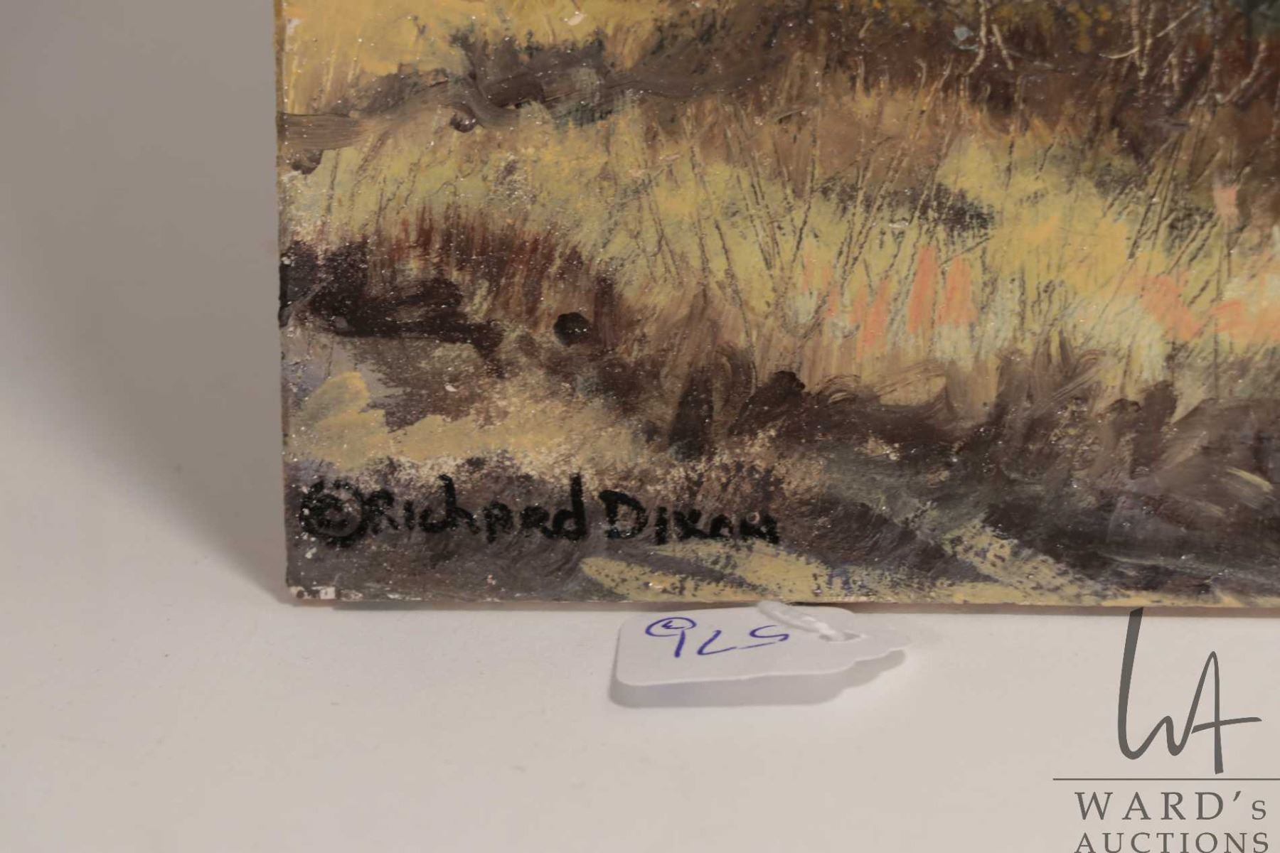 Richard Dixon, three unframed acrylic on board painting of Alberta skylines, artist signed, each 9" X 12"