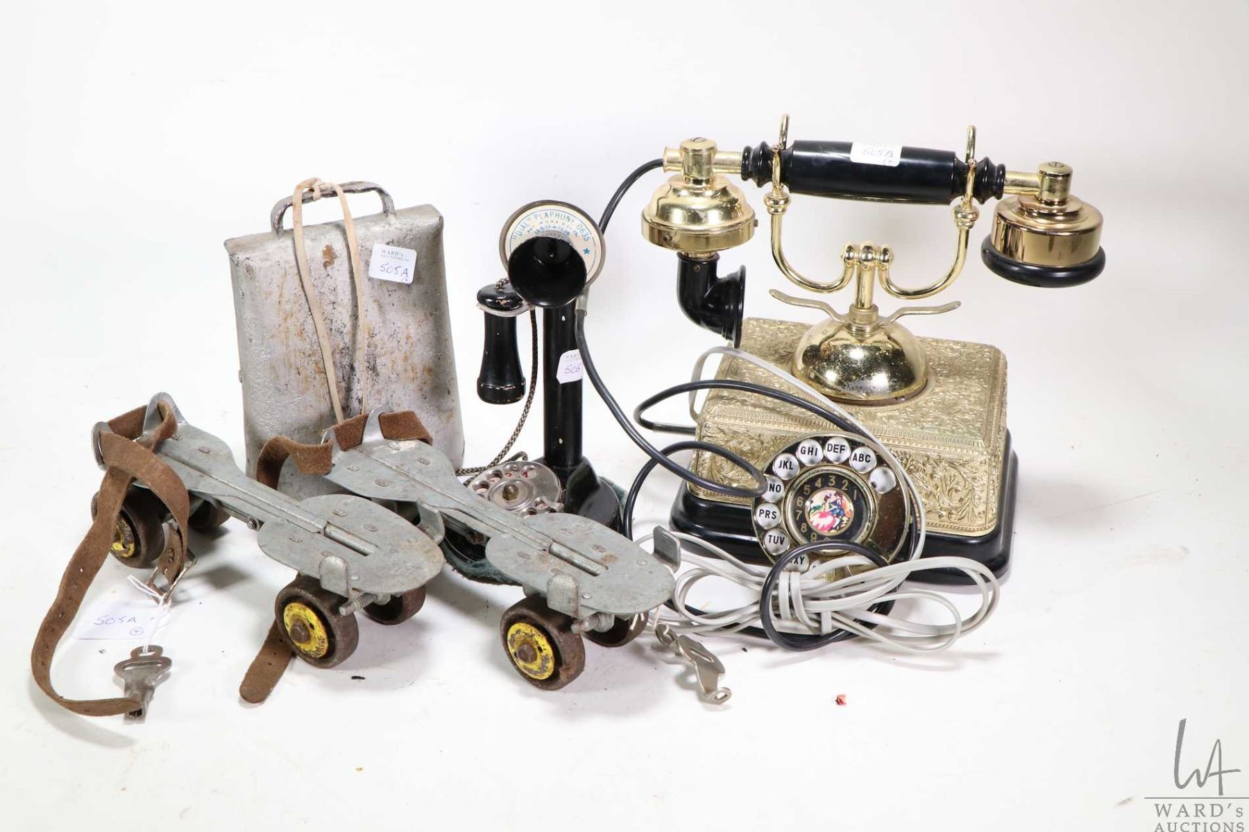 Rocco style dial phone, child's dial candlestick toy phone, cow bell and a pair of roller-skates wit