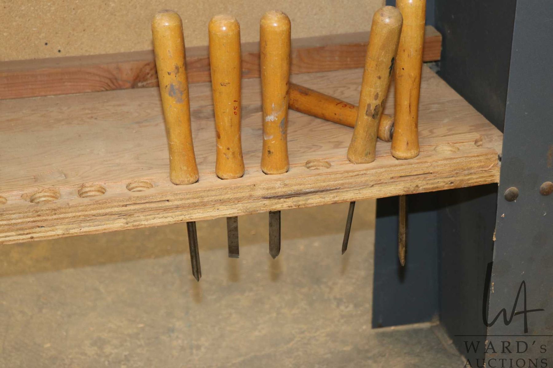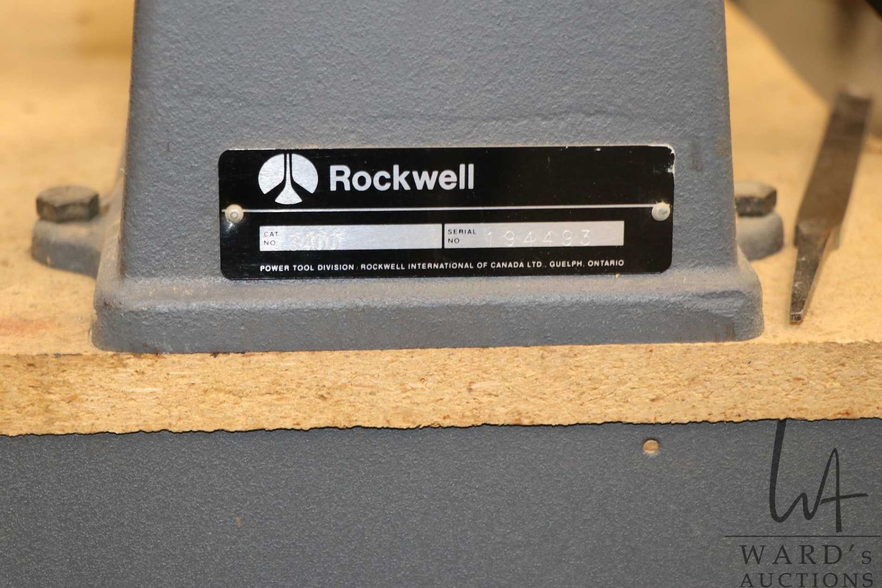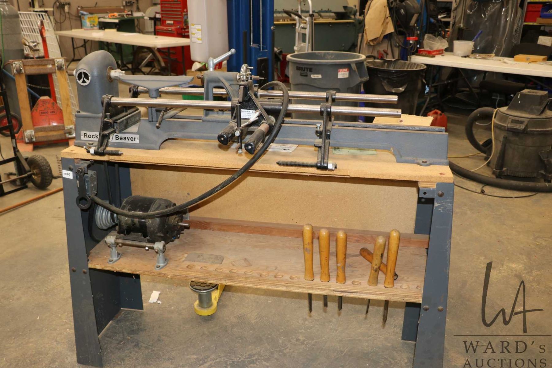 Rockwell Beaver model 3400 lathe with 36" bed gap, on metal and wood stand, includes model 3010 wood lathe duplicator and five cutting tools, working at time of cataloguing