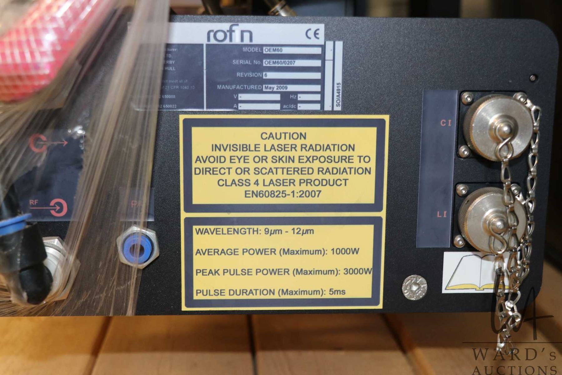 Rofin model OEM60 laser. Serial number OEM60/0207. This unit purportedly fits lot number 101 and and can fit other machines and has only been factory tested and never put into service. Research suggests replacement value to be quite high. Not test by auction business.