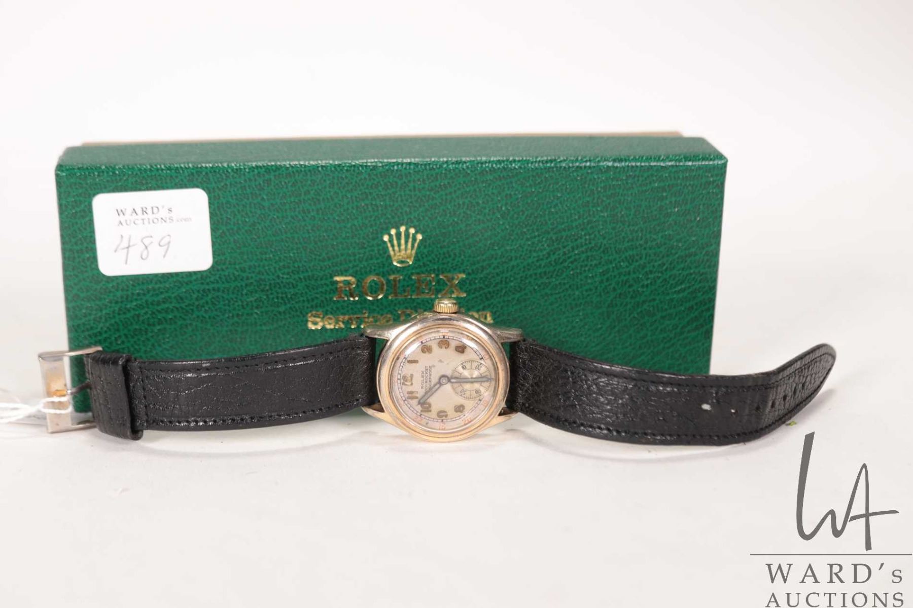 Rolex Sky-Rocket wrist watch. Circa 1940-WWII era Canadian service men gold filled with 17 jewel hand wind movement, silver Arabic 24 hour dial and non-Rolex leather strap. Retail replacement value $2,200.00