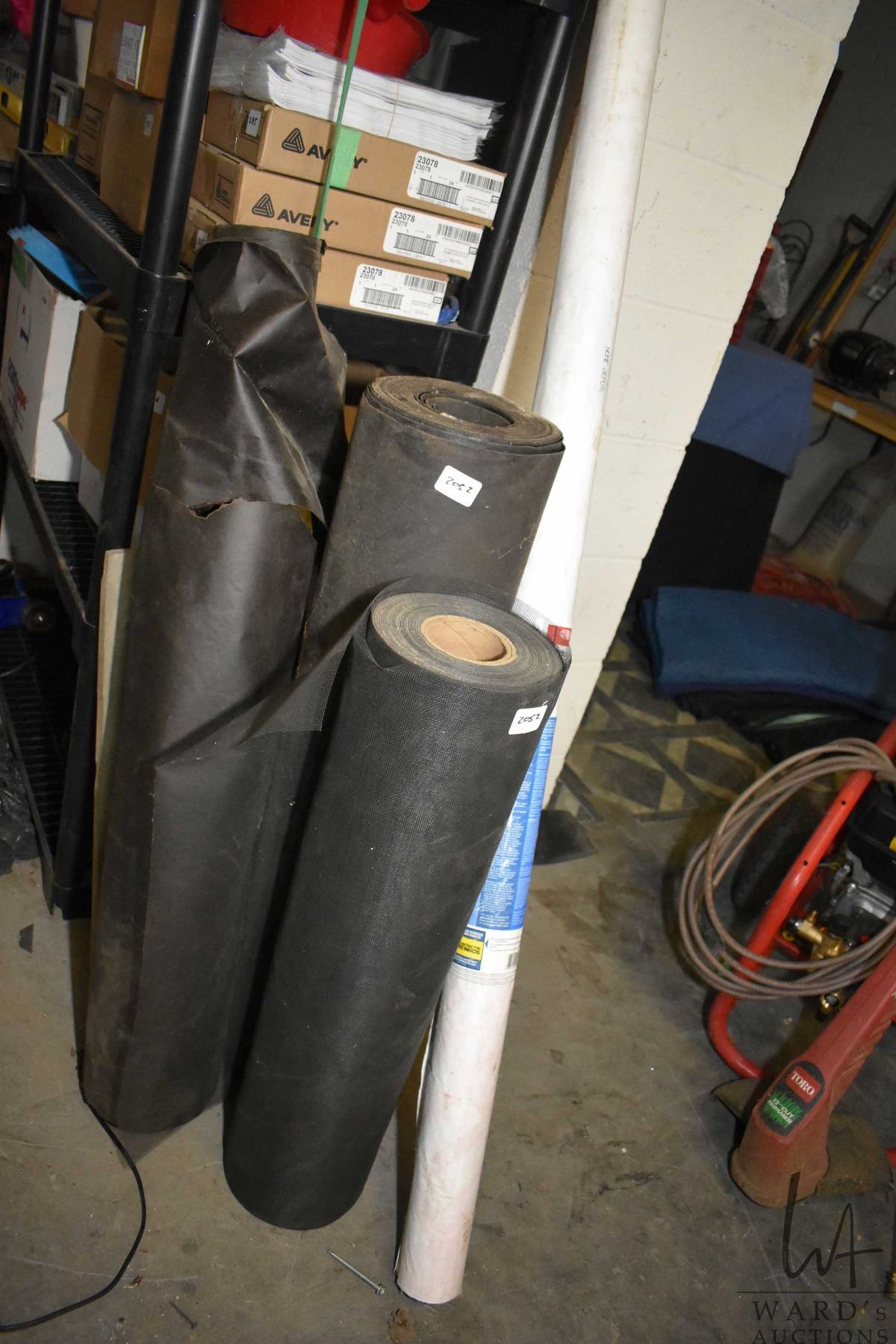 Roll of DuPoint Tyvek HomeWrap 9' x 10', 36" roll of roofing paper, appear near full plus a partial roll of 42" foundation paper and a 30" roll of fine mesh screen