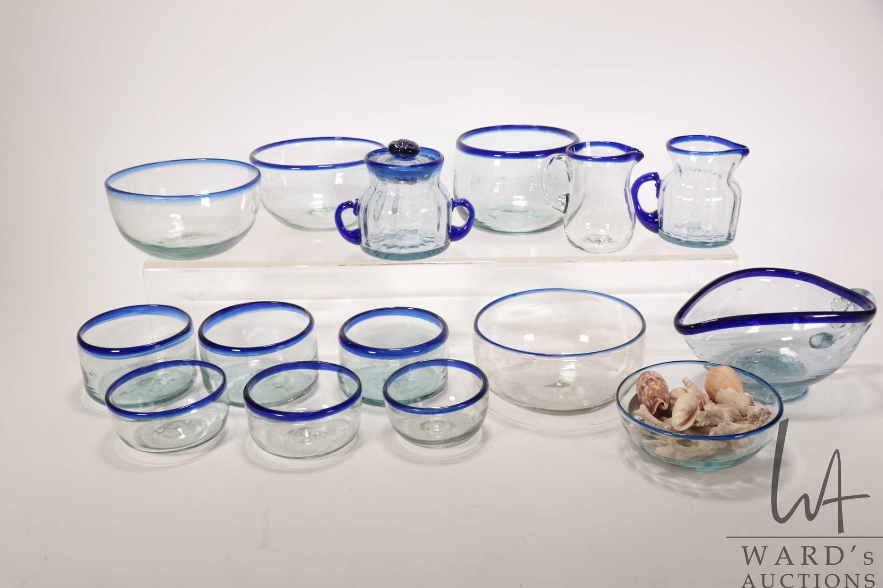 Roselift Height Dos Suenos Mexico glassware including eleven assorted small bowls, sauce boat, cream & sugar, etc. Plus selection of sea shells. Note: Not available for shipping. Local pickup only