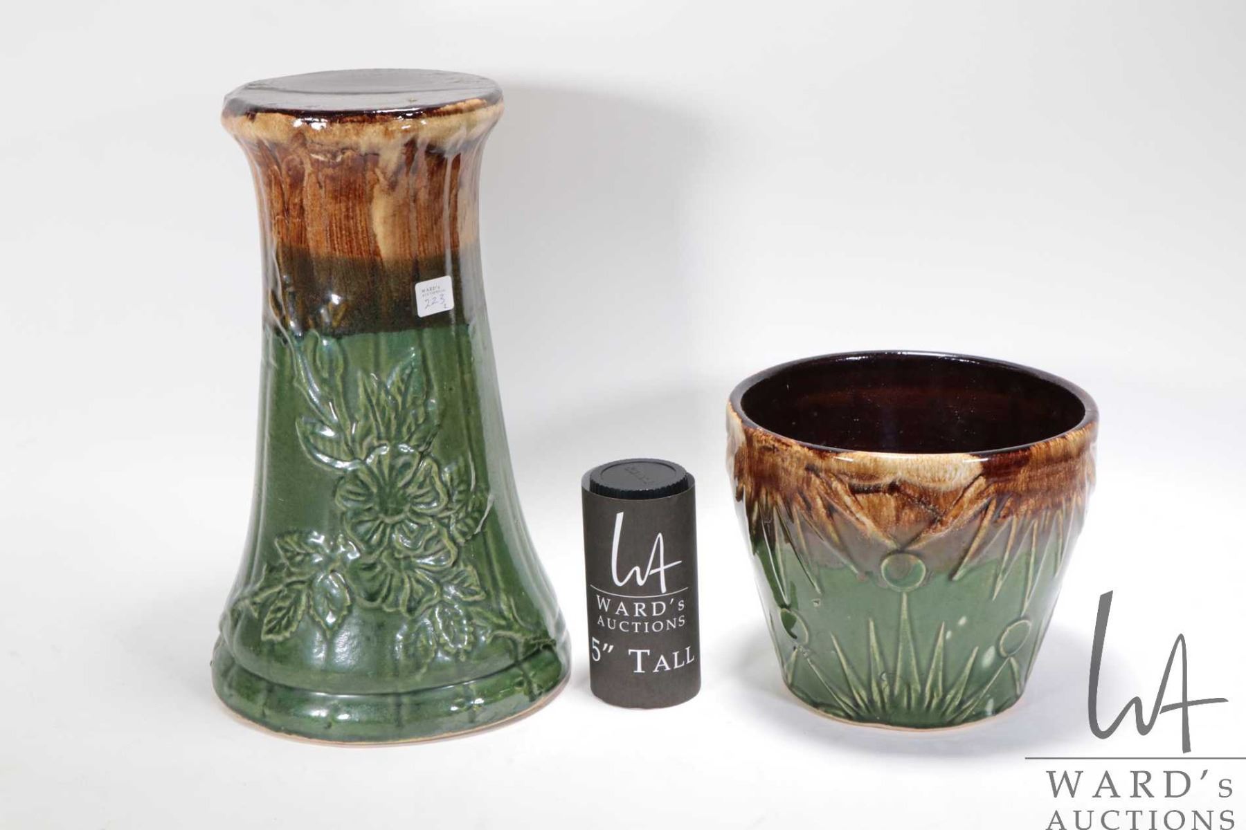 Roseville Pottery "Robinson Ramsbottom" 8" glazed pottery planter and a 14" "Dogwood" planter stand