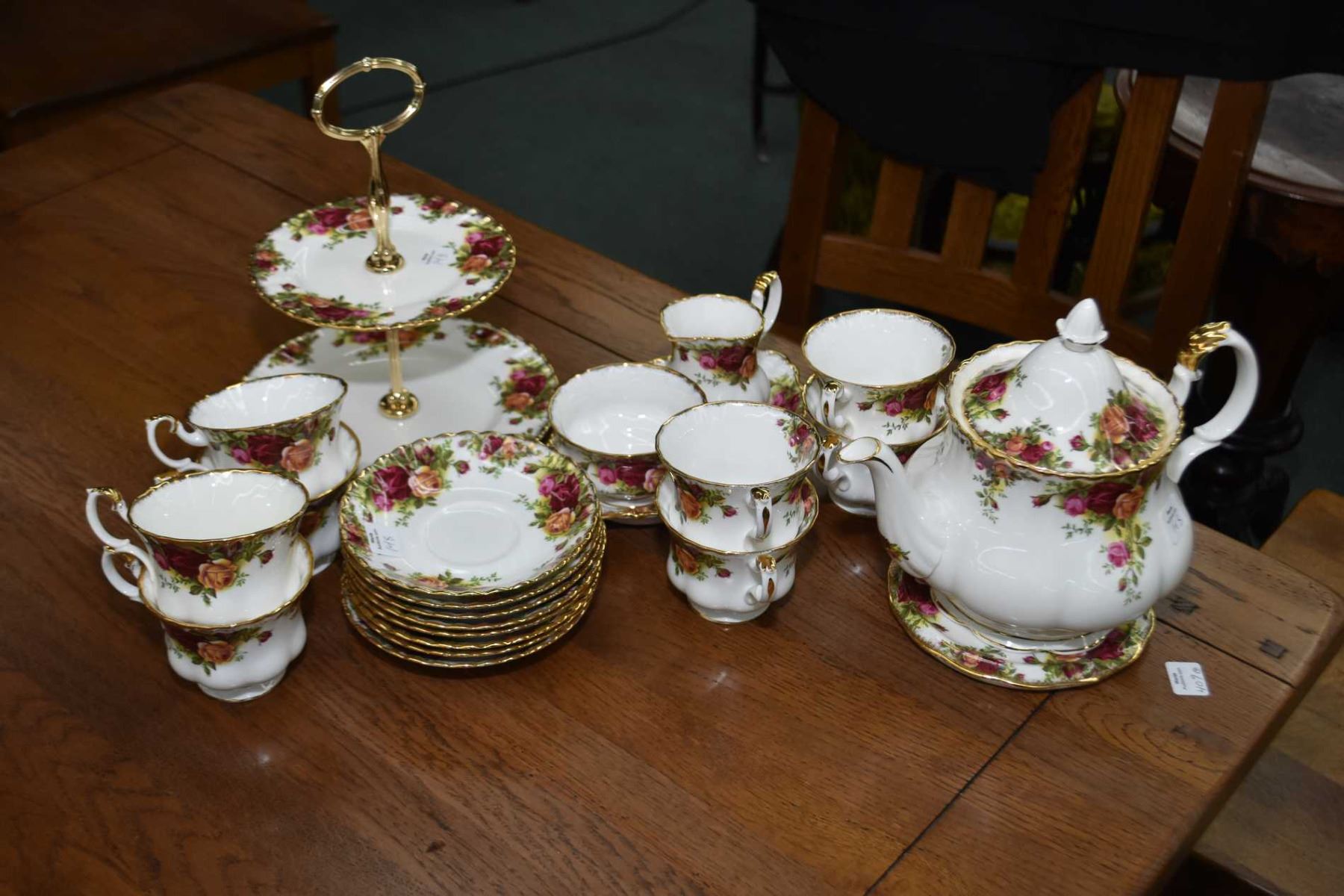 Royal Albert Old Country Roses china tea set including teapot, trivet, open cream, sugar with tray, two tier cake plate and eight cups and saucers