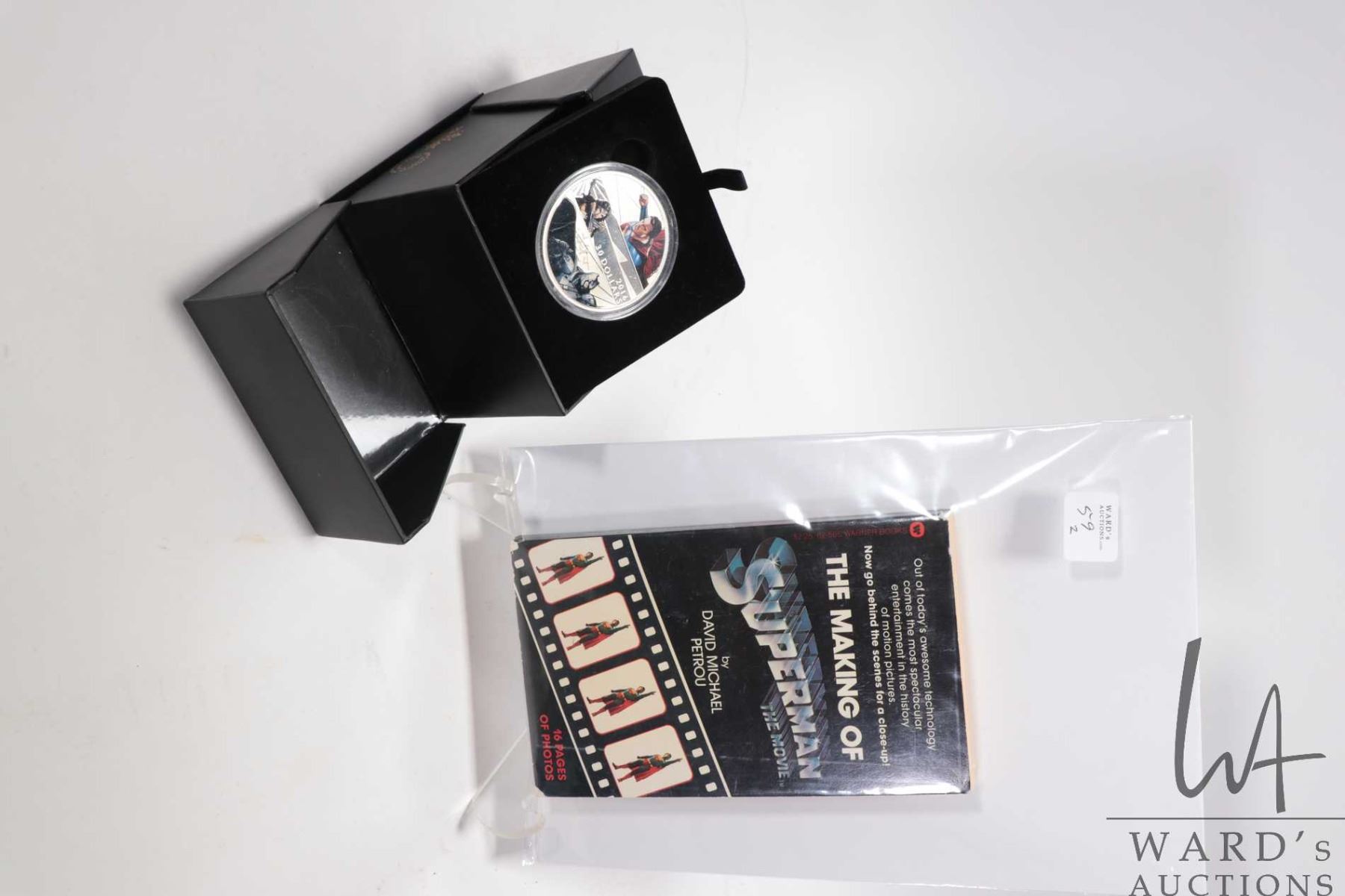 Royal Canadian Mint 2016 $30 Superman vs Batman coin and a paperback book titled "The Making of Superman The Movie"
