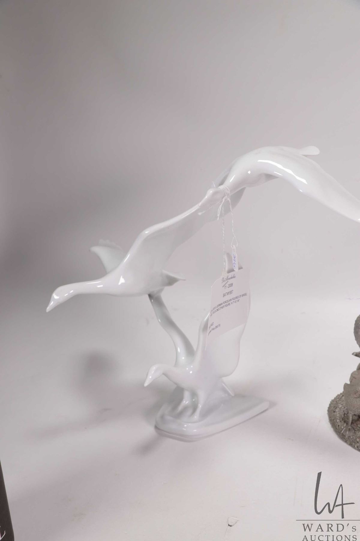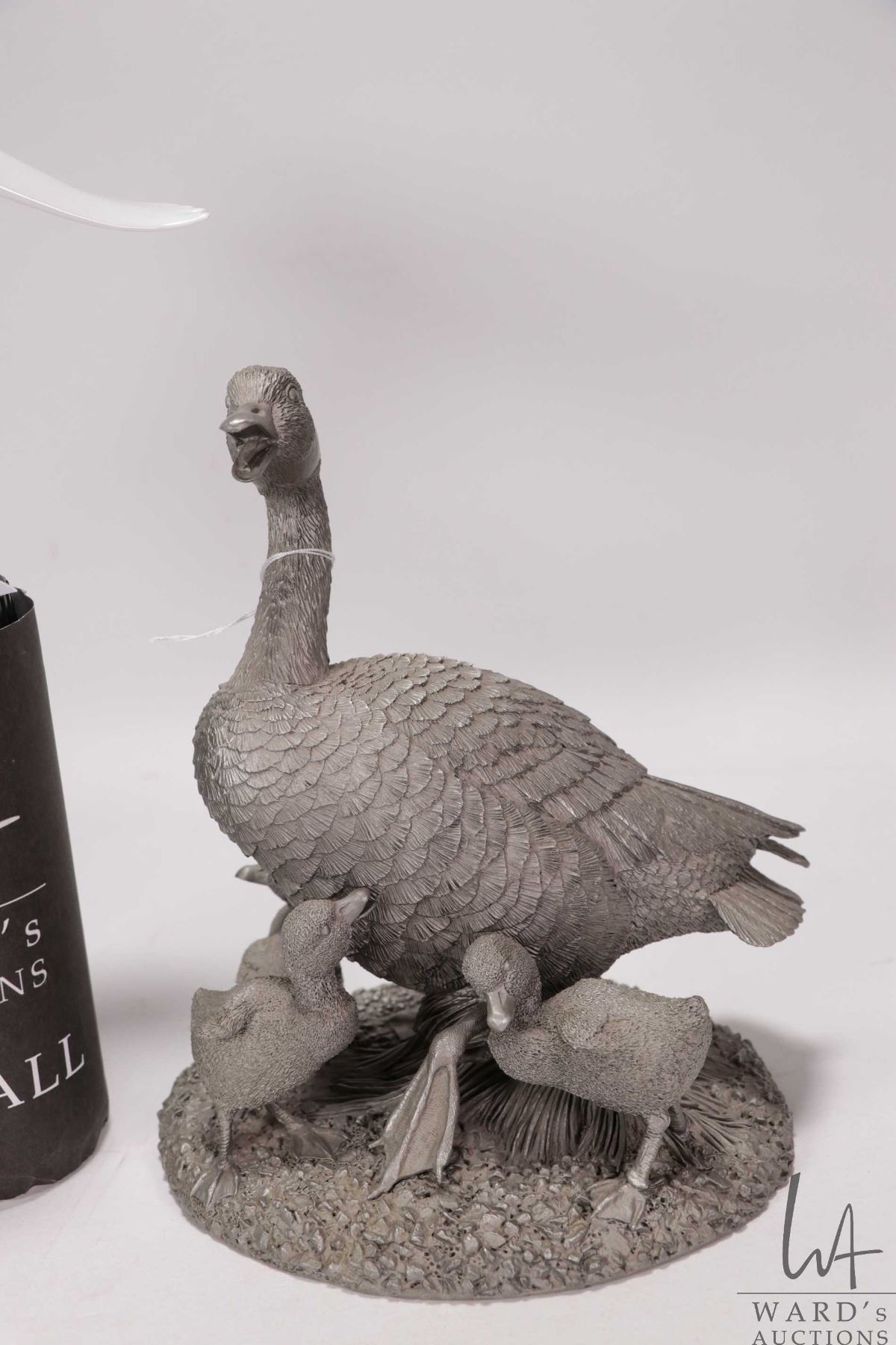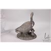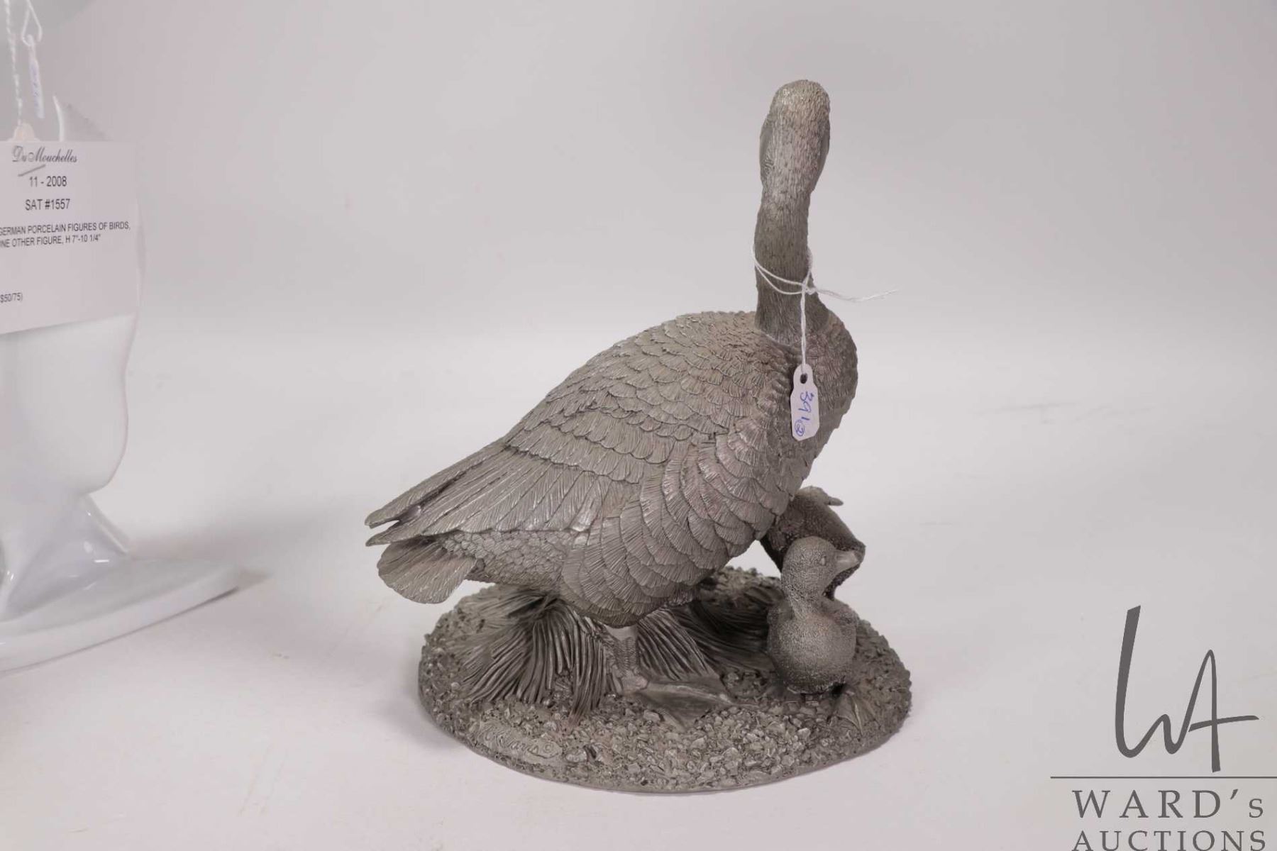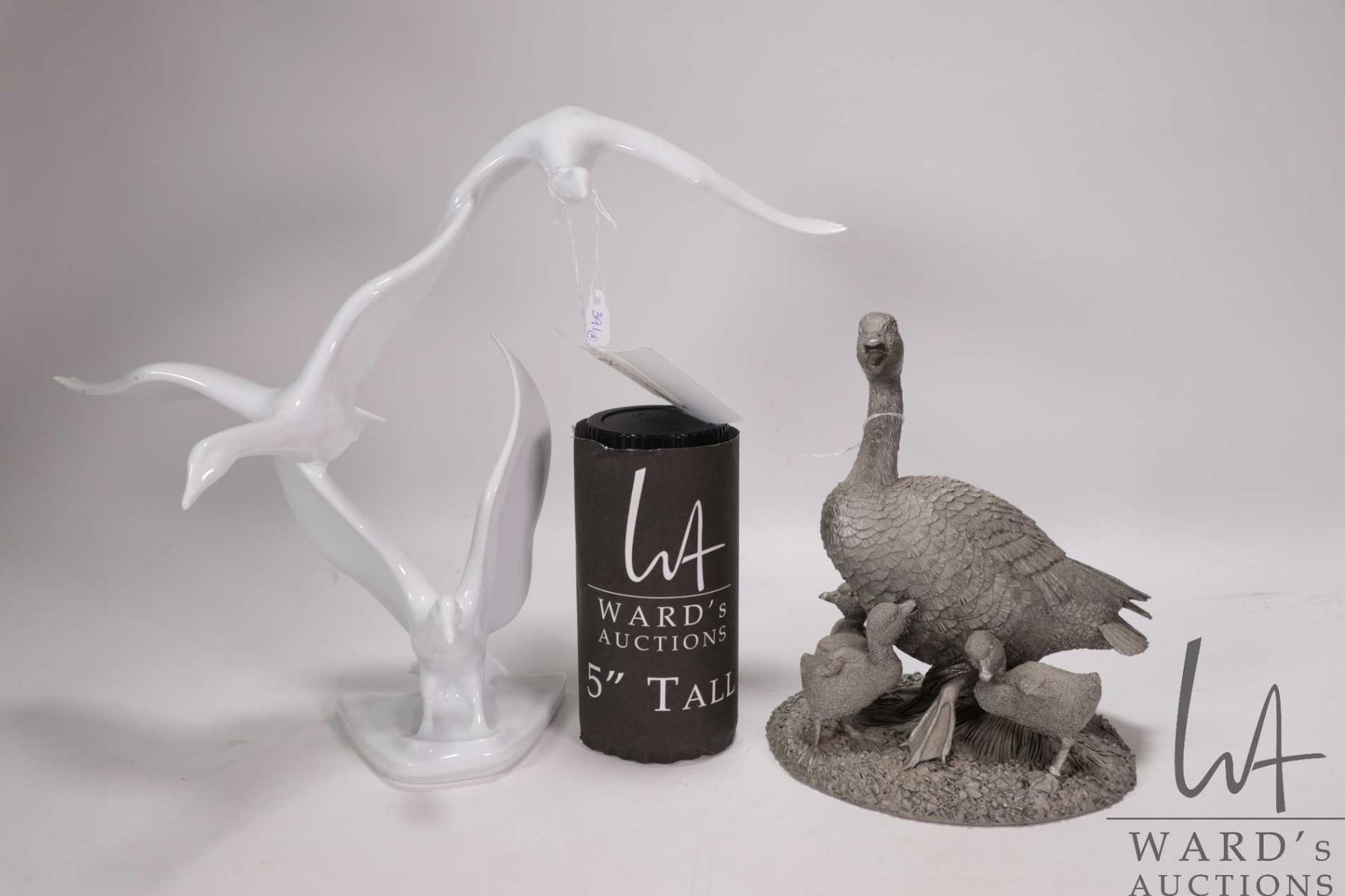 Royal Dux glazed porcelain birds in flight 10" in height and Franklin Mint "Gosling Time" pewter mother goose with babies