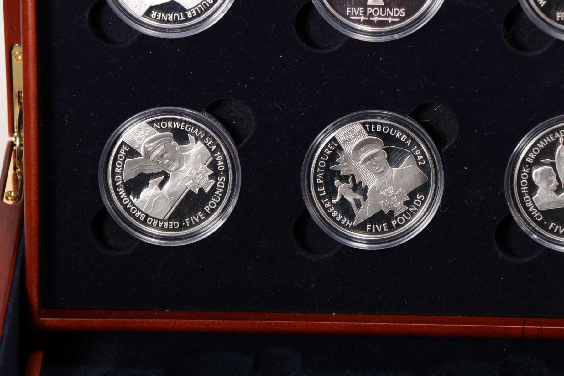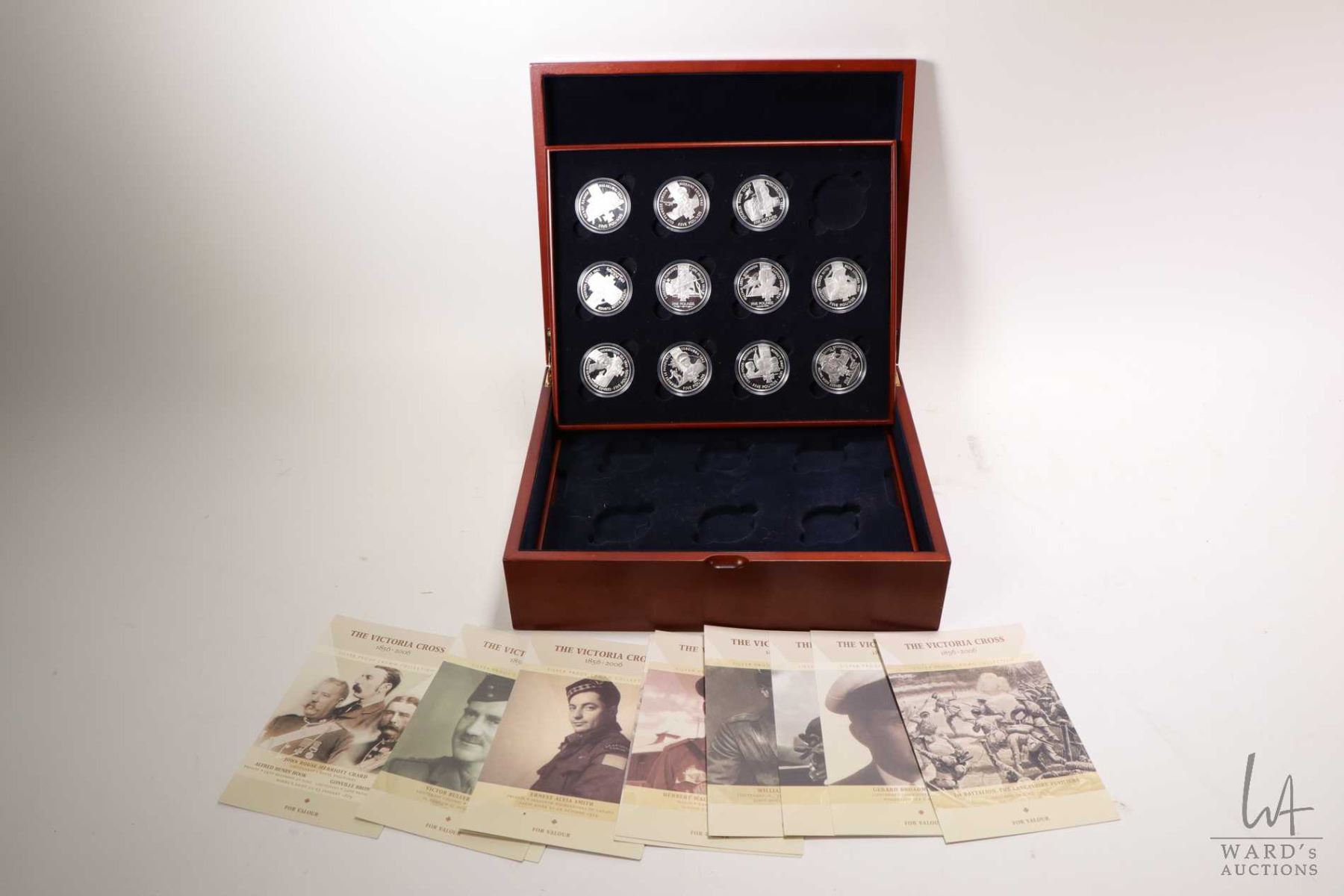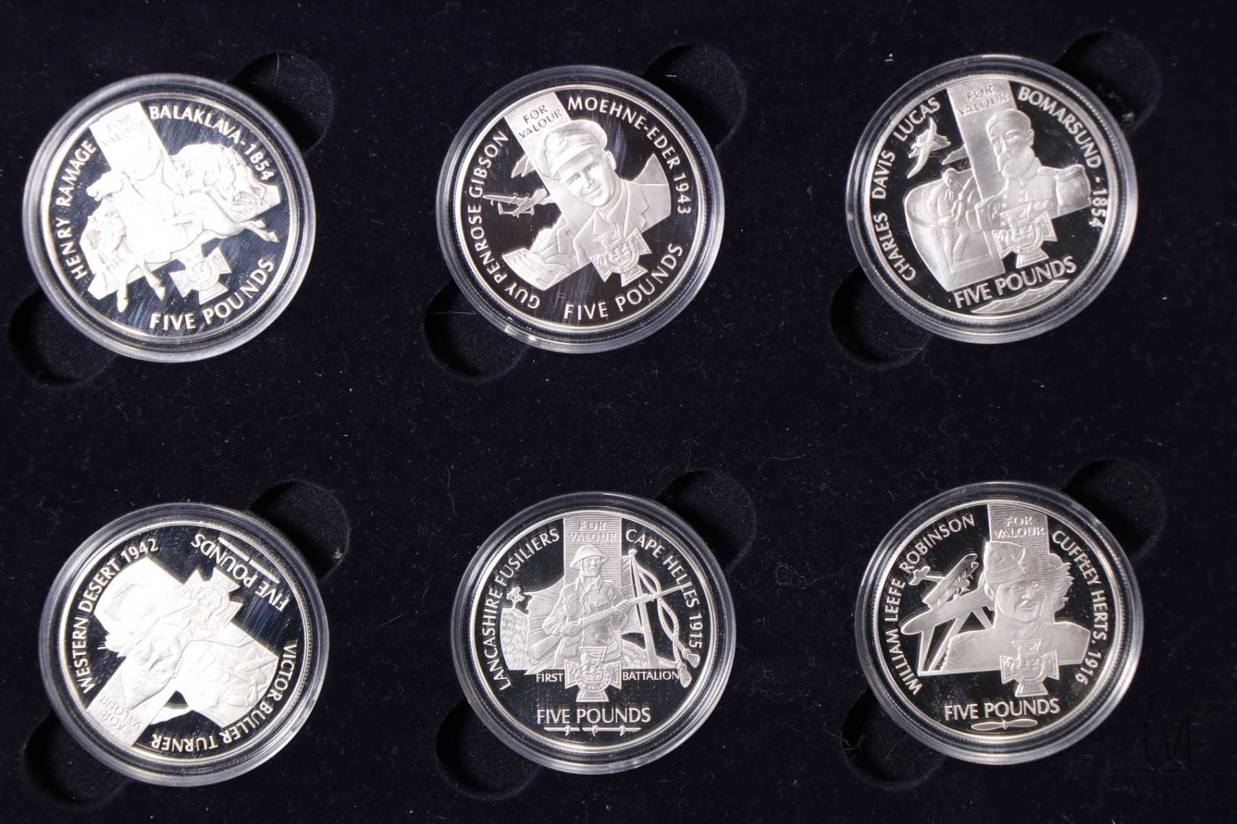 Royal Mint silver proof crown collection of "The Victoria Cross 1859-2006" coin set. Each coin representing a recipient giving a Victoria Cross for Valour. There are eleven coins, each weighing 28.28 grams of .925 sterling silver. Recipients include Henry Ramage,Victor Buller Turner, Geoffrey Charles Tasker Keyes, John Rouase Merriott Chard, Gerard Broadmead Roope, Guy Gibson, William Leefe Robinson, Herbert Wallace Le Patourel, Charles Davis Lucas and Ernest Alvia Smith and the 1st Battalion, The Lancashire Fuiliers. All in a wooden two tier presentation case and information cards for each recipient