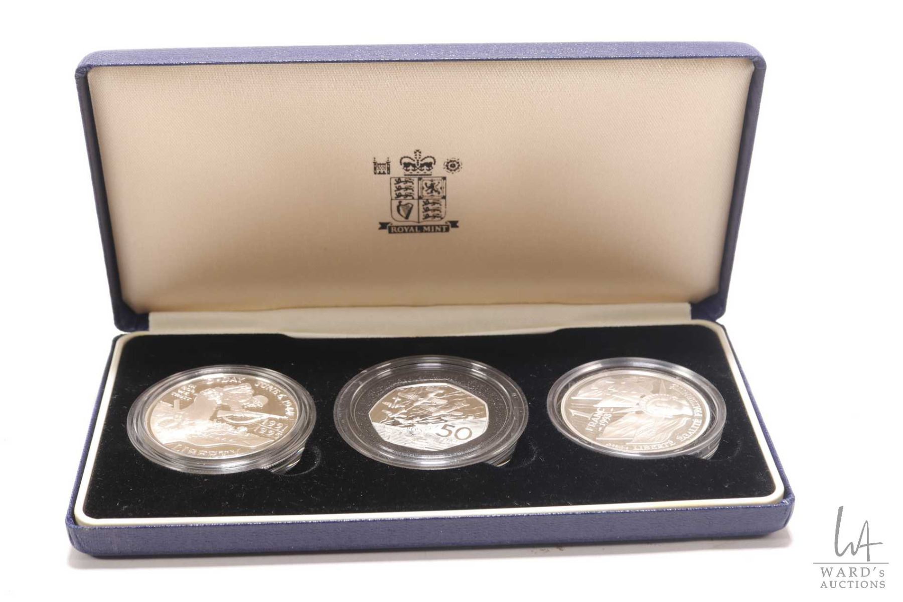 Royal Mint three coin Tri-country "50th Anniversary of D-Day" cased coin set including fine silver USA D-Day June 6, 1944 American Liberty dollar, a Briitsh fine silver 50 pence coin and a fine silver 1993 Liberte Eglaite Fraternite 1 French Franc coin