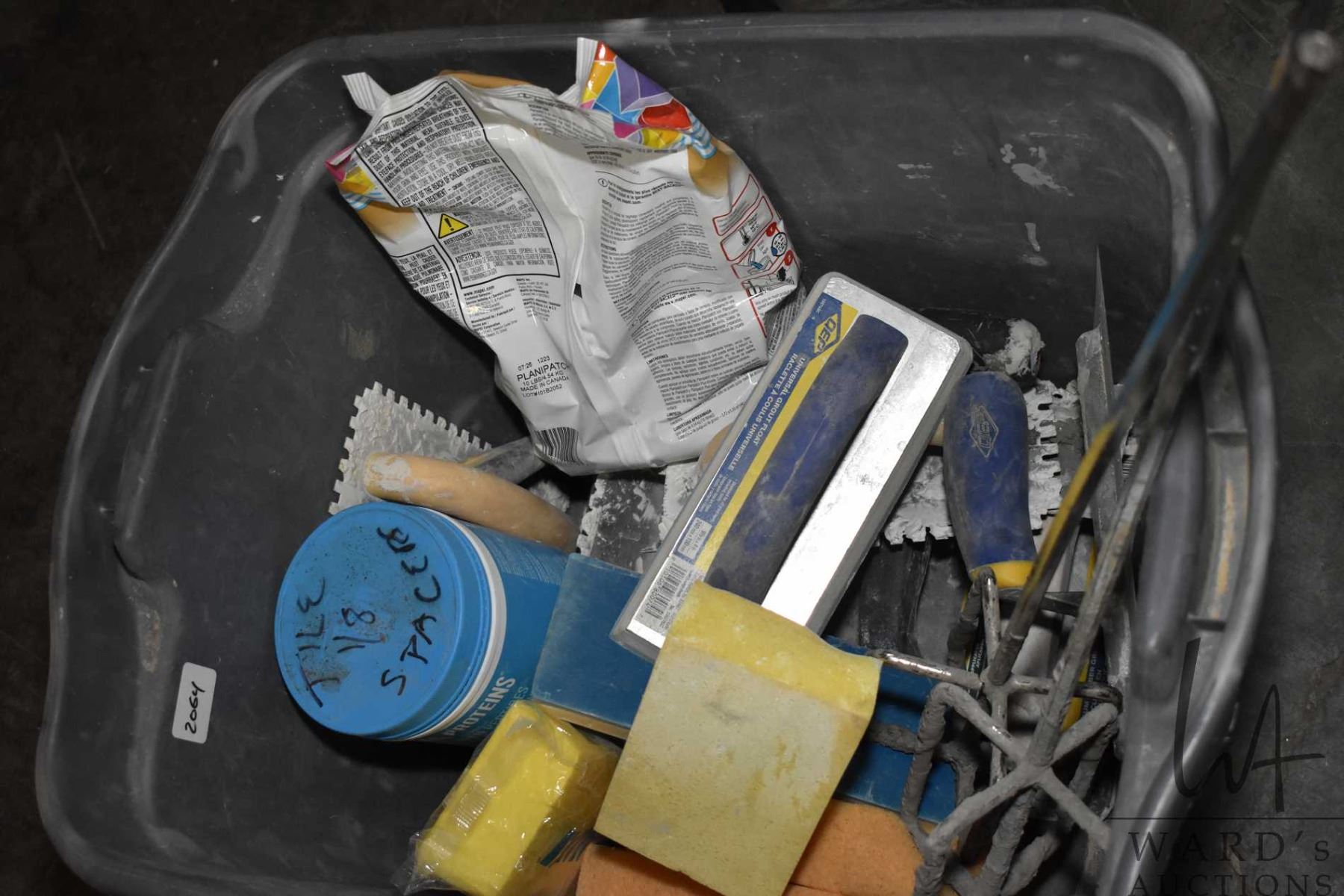 Rubbermaid tuby containing tiling tools including trowels, floats, mixers, sponges,spacers etc.