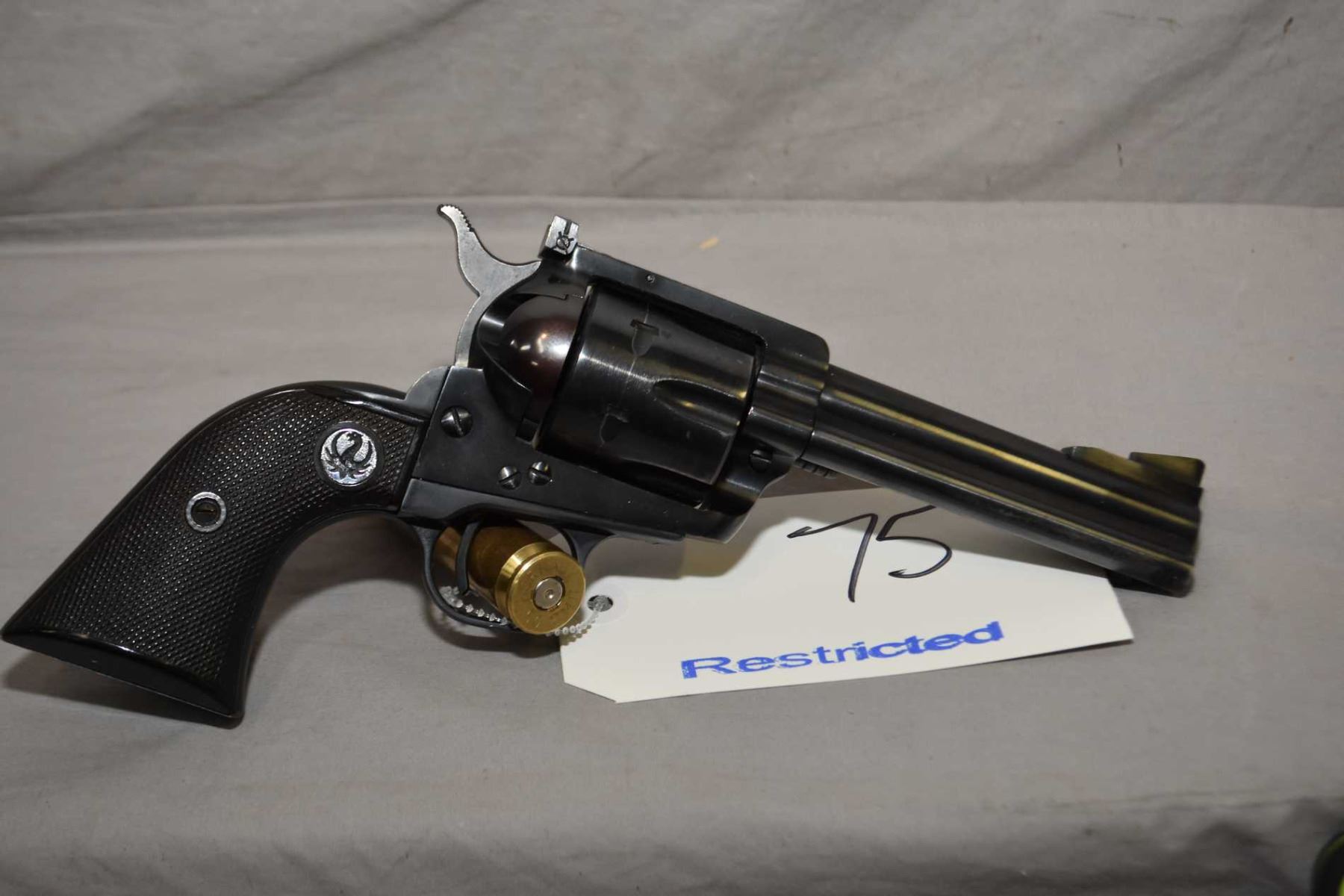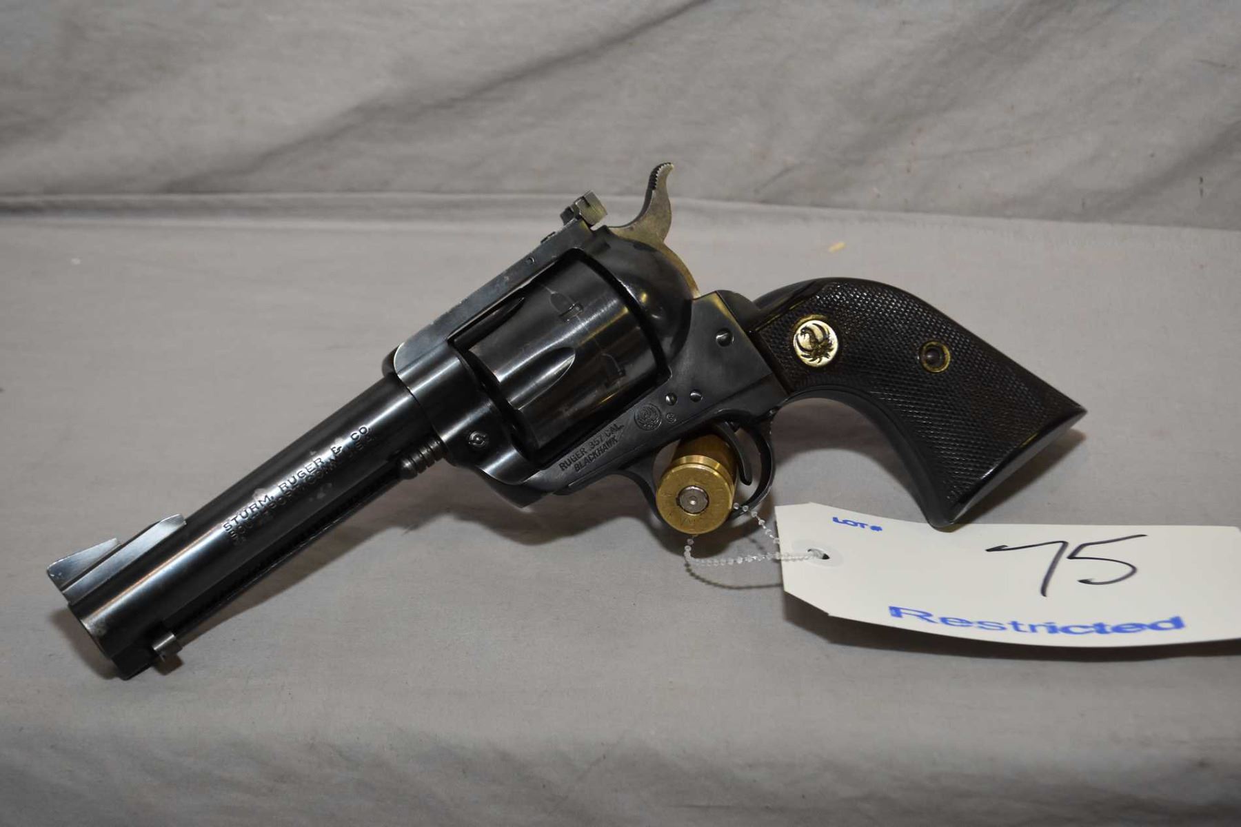 Ruger Model Blackhawk ( Early Three Screw Flat Top ) .357 Mag Cal 6 Shot Revolver w/ 117 mm bbl [ blued finish, few slight marks including cylinder ring, black checkered Ruger insignia grips, Manufactured late 1959, approx. 80 % blue remaining, blackhawk composite grips, very early serial number ] Ser # 20374 Restricted Handgun Cert # 12876820 FRT # 22462 - 11