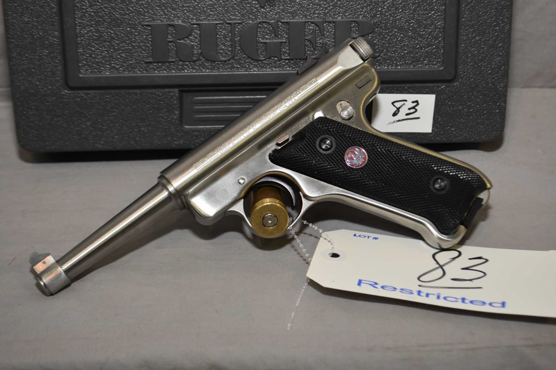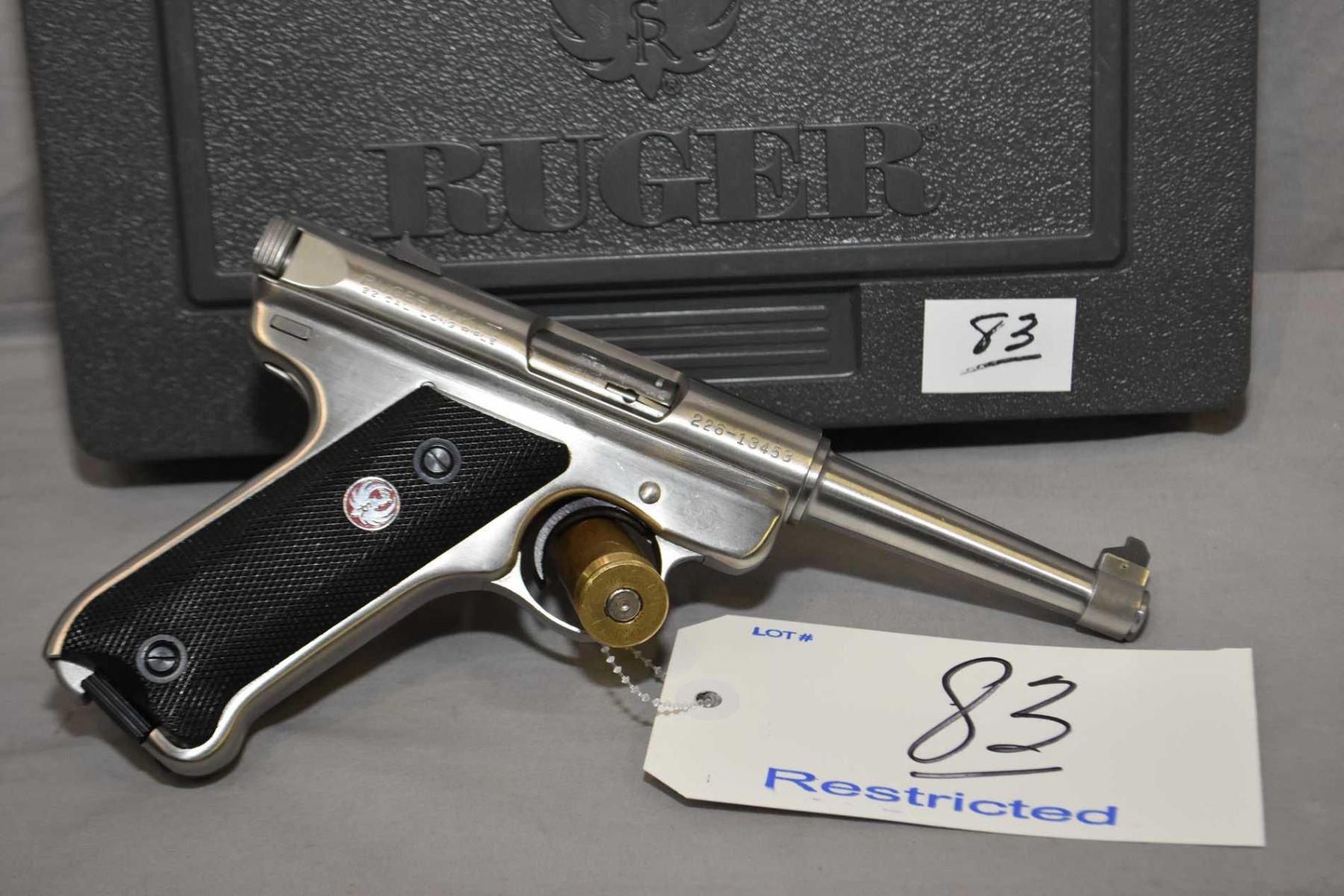 Ruger Model Mark II Standard .22 LR Cal 10 Shot Semi Auto Pistol w/ 10 Shot w/ 121 mm bbl [ appears excellent, stainless finish, in original plastic case, w/extra mag, black checkered Redhawk colored insignia grips, and both mags ] Ser # 22613453 Restricted Handgun Cert # 11133066 FRT # 22438 - 2