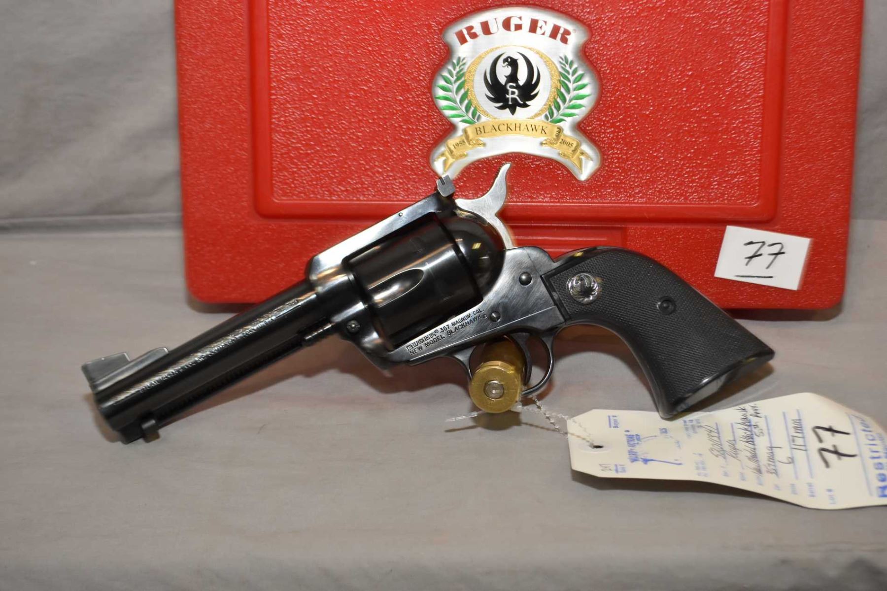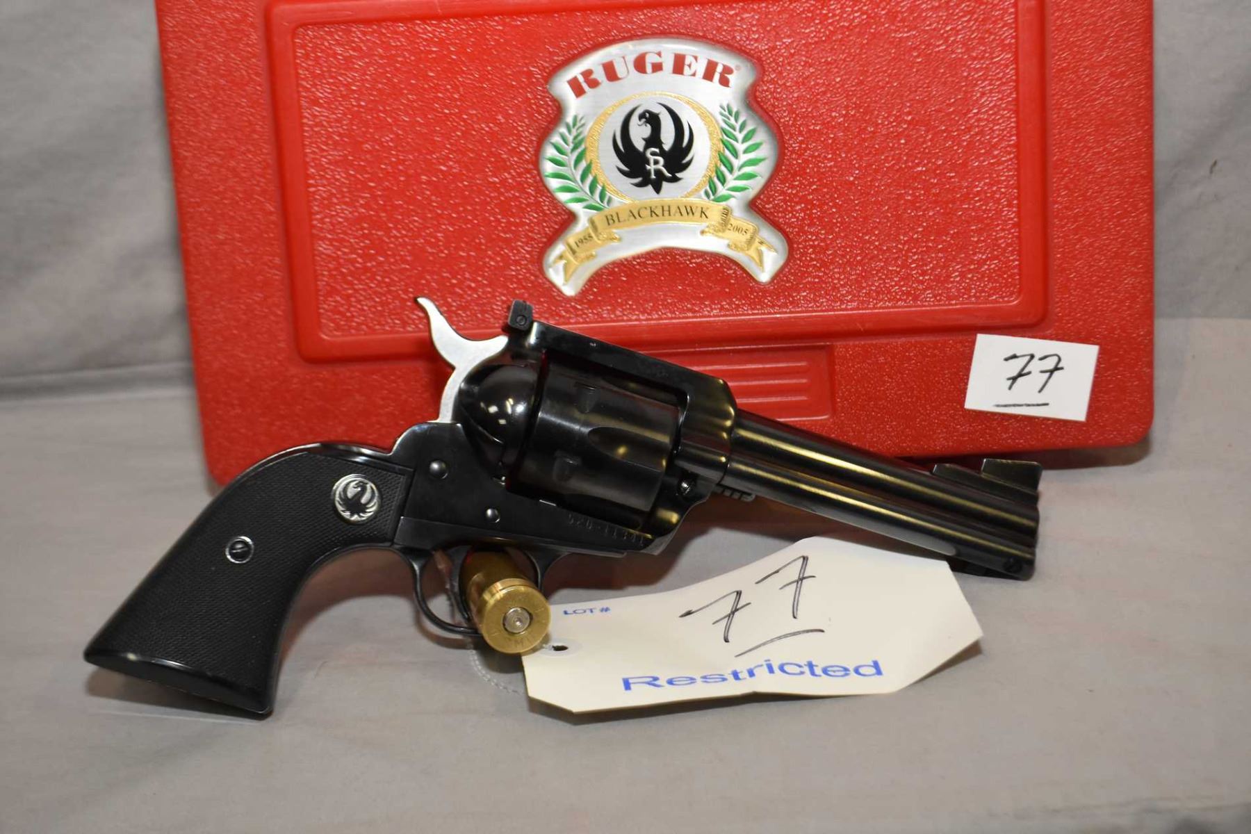 Ruger Model New Model Blackhawk 50 Th Anniversary Flat Top .357 Mag Cal 6 Shot Revolver w/ 117 mm bbl [ appears as new, unfired, c/w original booklet, in 50 Th Anniv Ruger red case, inscribed on top of barrel "1955 - 2005", blued finish, black checkered Ruger Blackhawk grips ] Ser # 52011341 Restricted Handgun Cert # 12727086 FRT # 123172 - 1