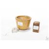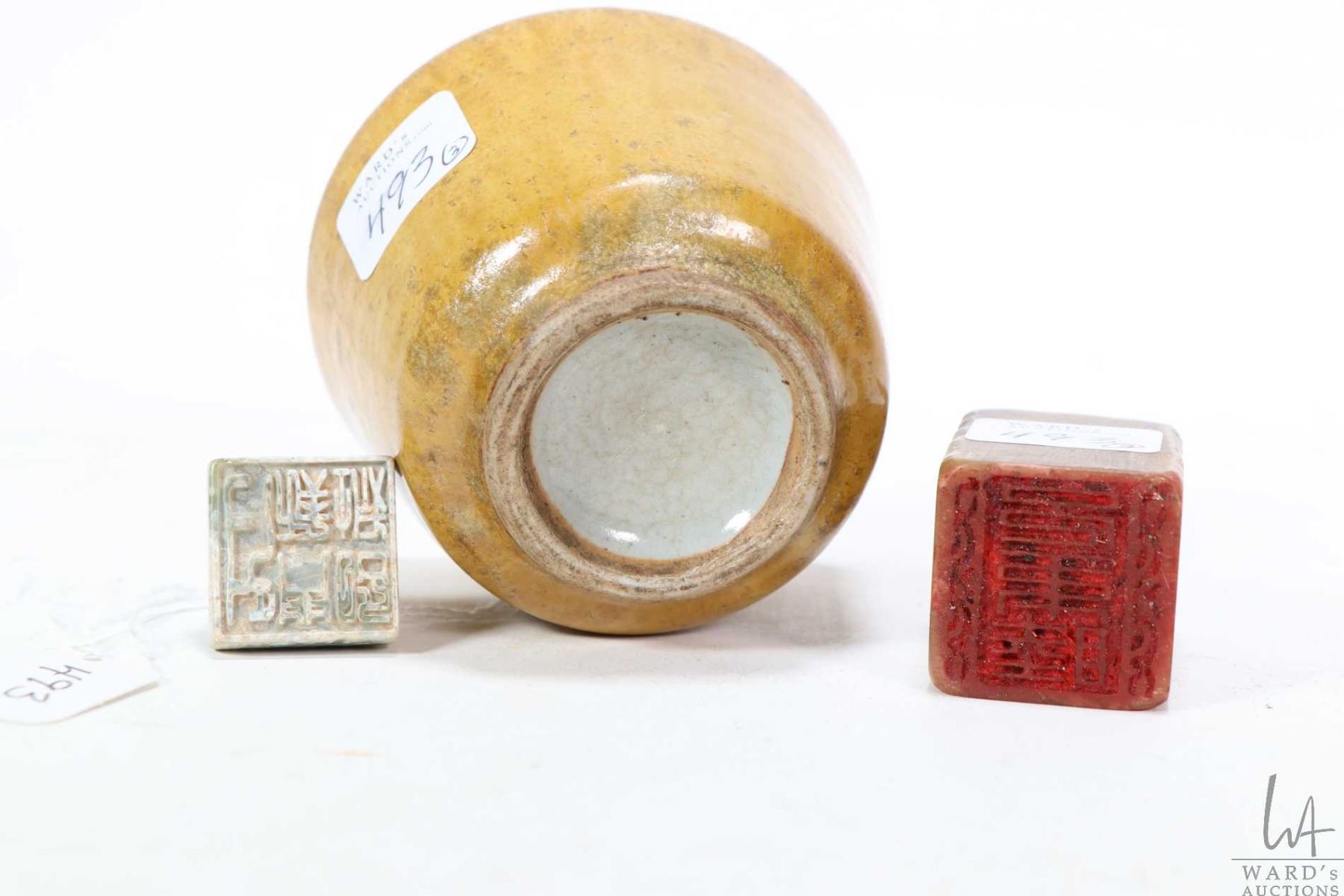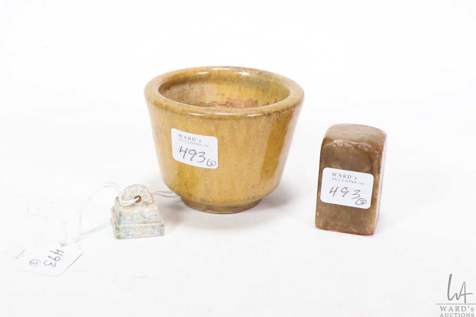 Russet glazed ritual jar 2 1/2" in height plus two small scholar leisure stamps