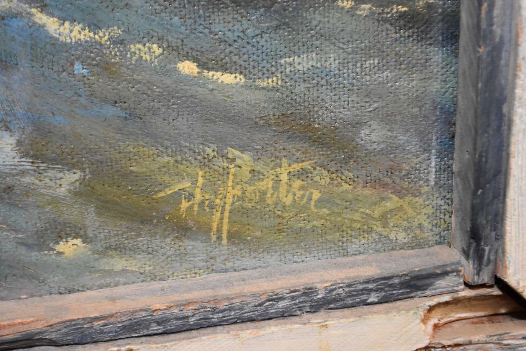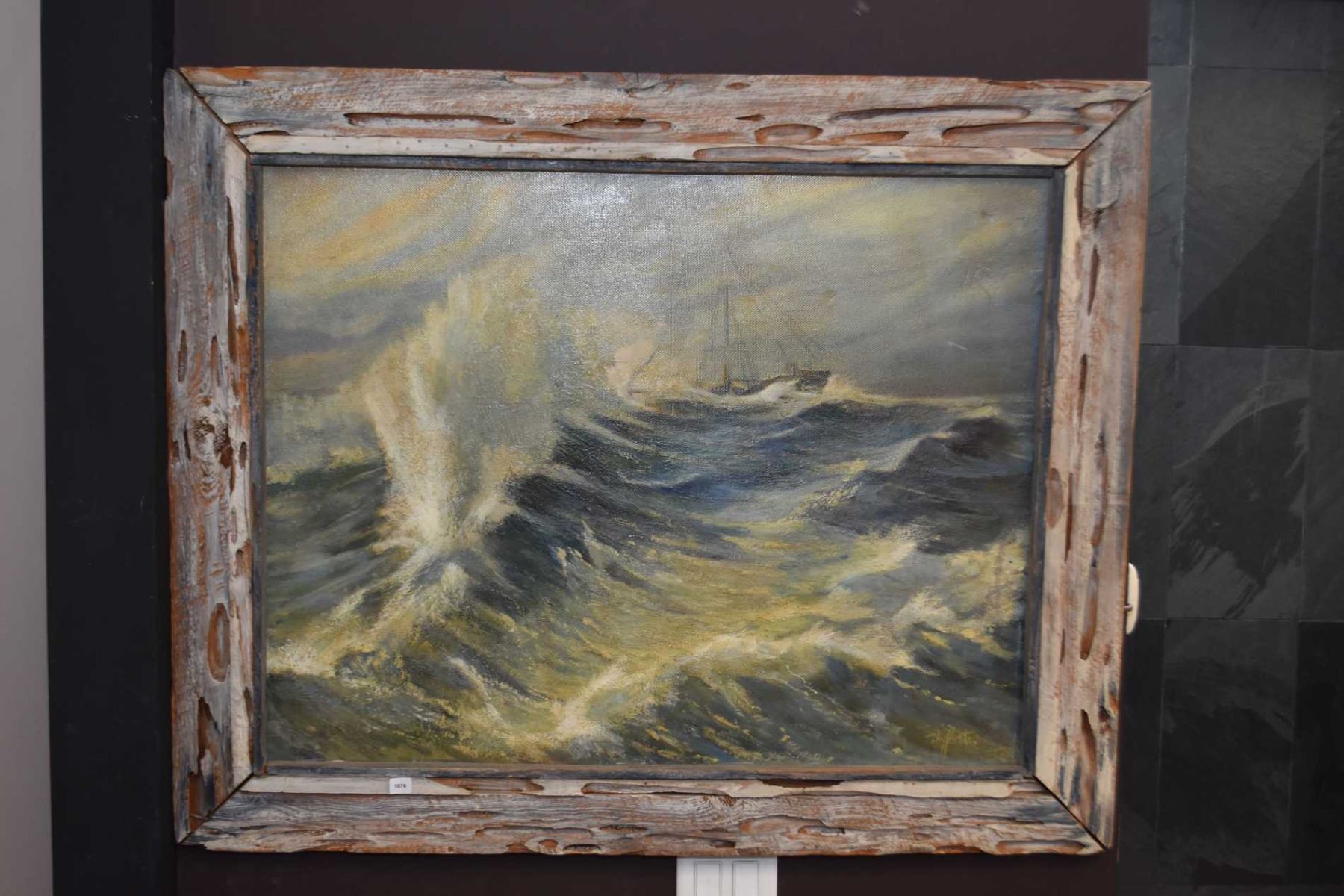 Rustic framed oil on canvas painting of a ship in a storm signed by artist Hy Porter 28" X 36"
