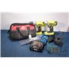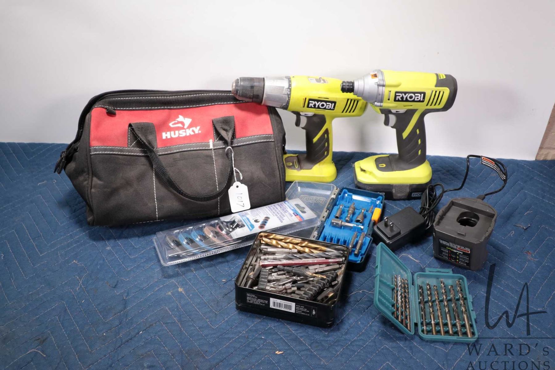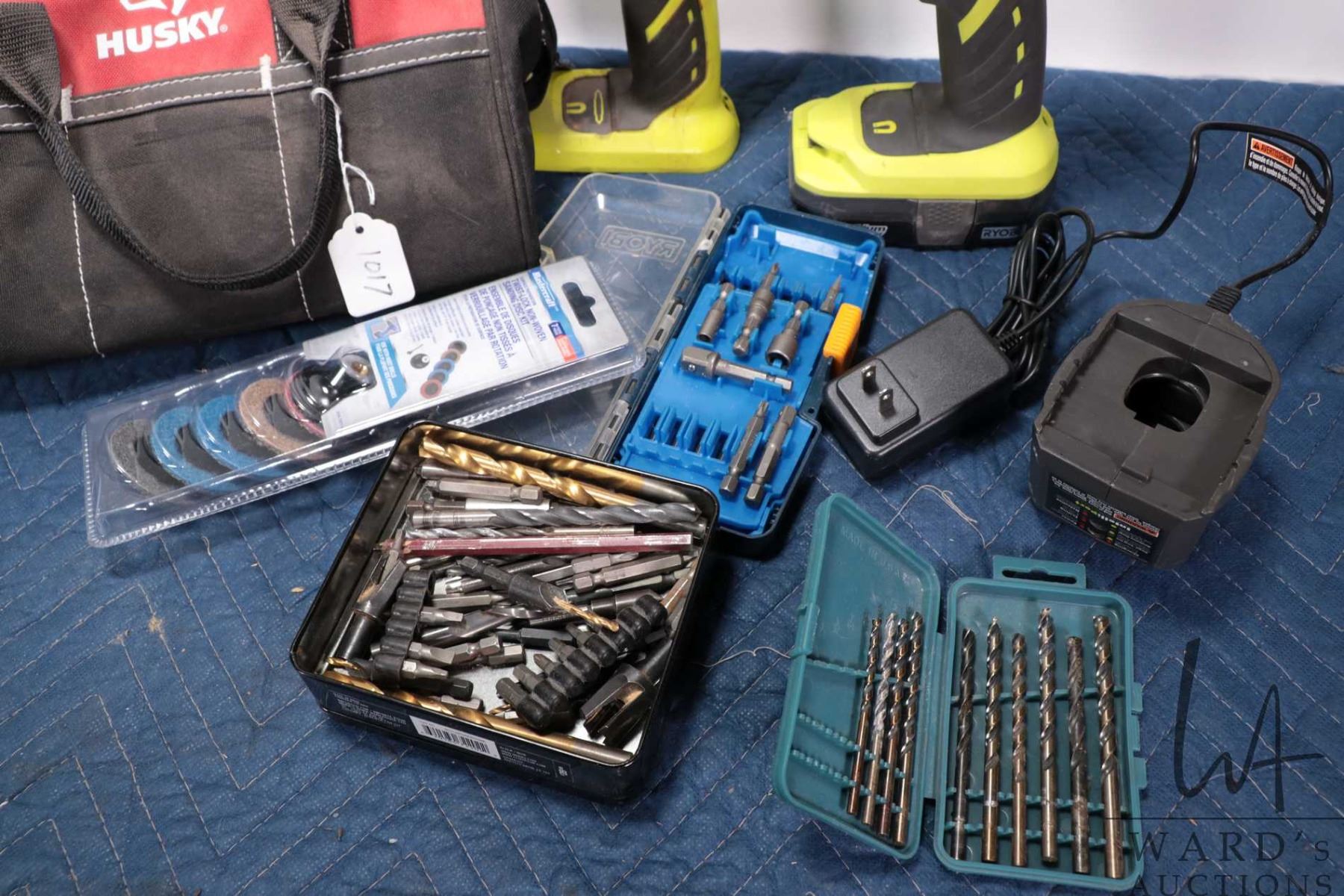 Ryobi rechargeable drill and impact gun, both working at time of cataloguing, includes one battery and chargers plus drill bits and a twist lock sanding disc kit, all in Husky tool bag