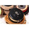 STH cassette reel in leather pouch with six extra spools and a canvas shoulder bag