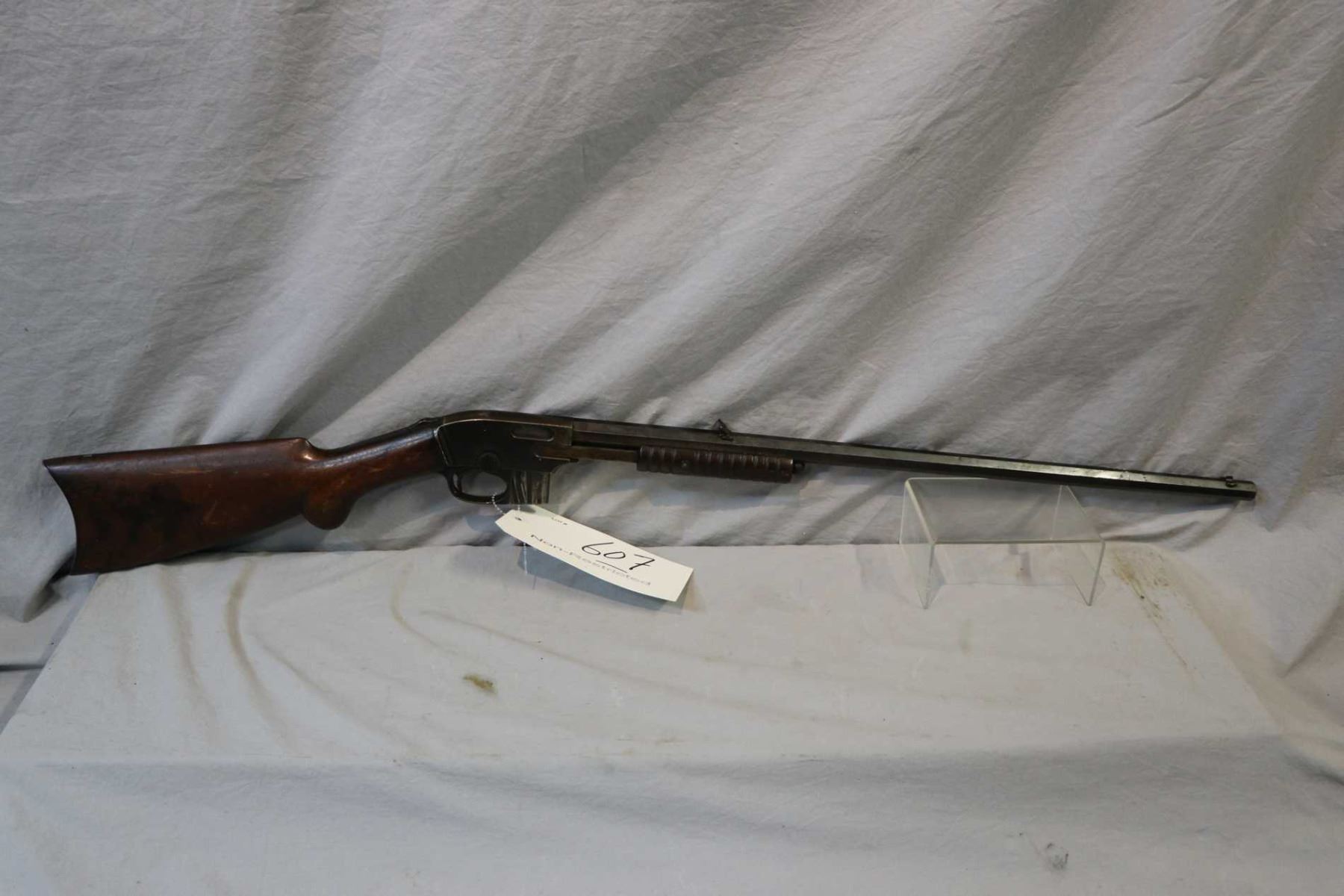 Savage Model 1903 .22 LR Cal Mag Fed Pump Action Rifle w/ 24" octagon bbl [ blued finish, starting to fade, turning brown in some areas, barrel sights, small grooved forewood, plain rounded pistol grip stock, with metal crescent style butt plate, , various marks and scratches to wood and metal ] Ser # 73867