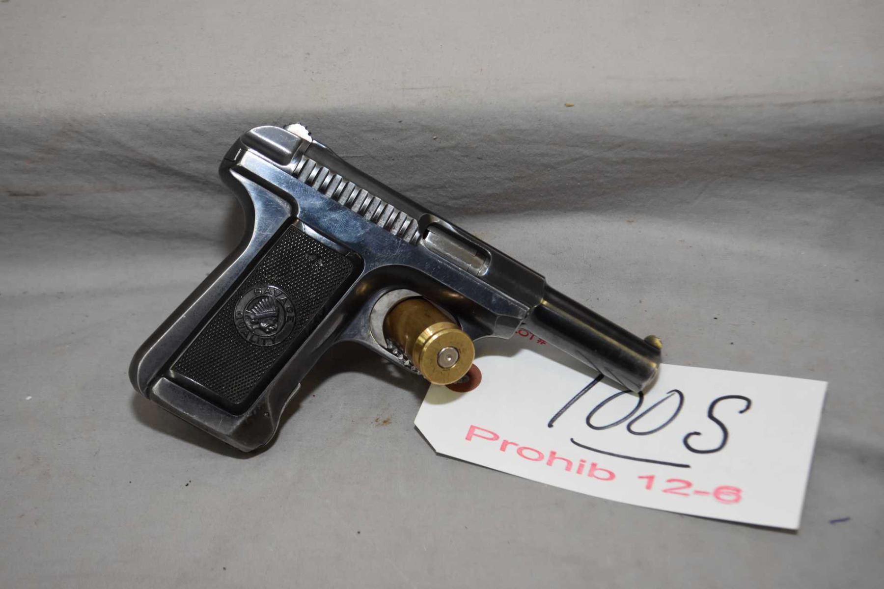 Savage Model 1907 7.65 MM Cal 10 Shot Semi Auto Pistol w/ 95 mm bbl [ blued finish with some slight wear, few marks, black checkered Savage quality insignia grips, note : right side cracked and glued, Manufactured in the U.S.A. for sidearm, many carried by Military and Police Forces, although manufactured as a Civilian pocket pistol. Military and Police Officers of the day were required to private purchase their pistols and the Savage was a robust reliable example ] Ser # 173622 Prohib 12 - 6 Cert # 11009495 FRT # 21747 - 3 EXPECT DELAYS IN TRANSFER