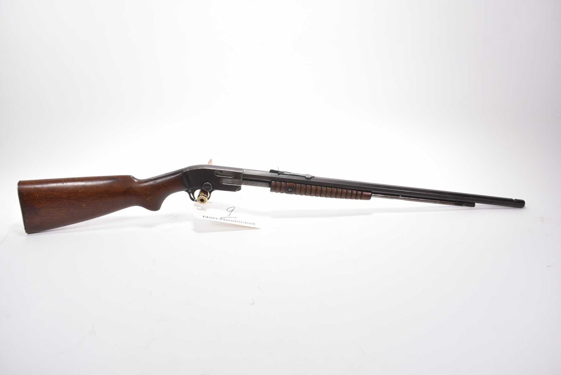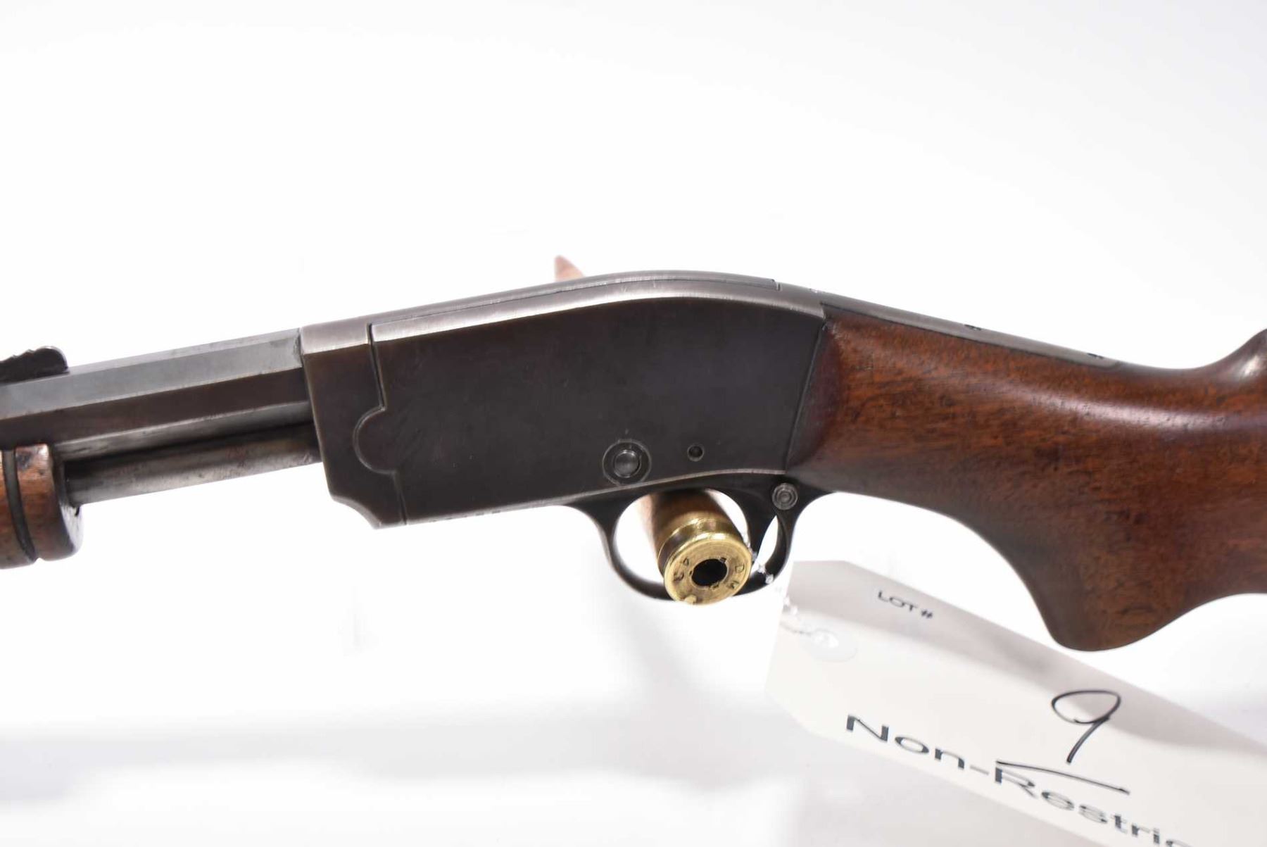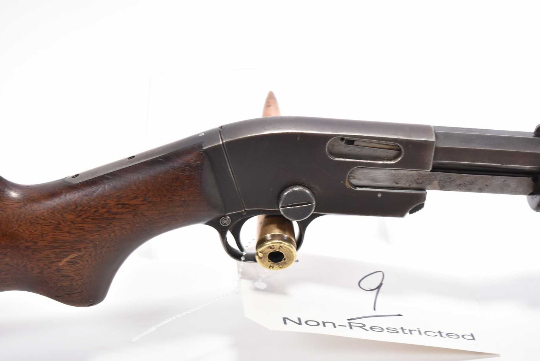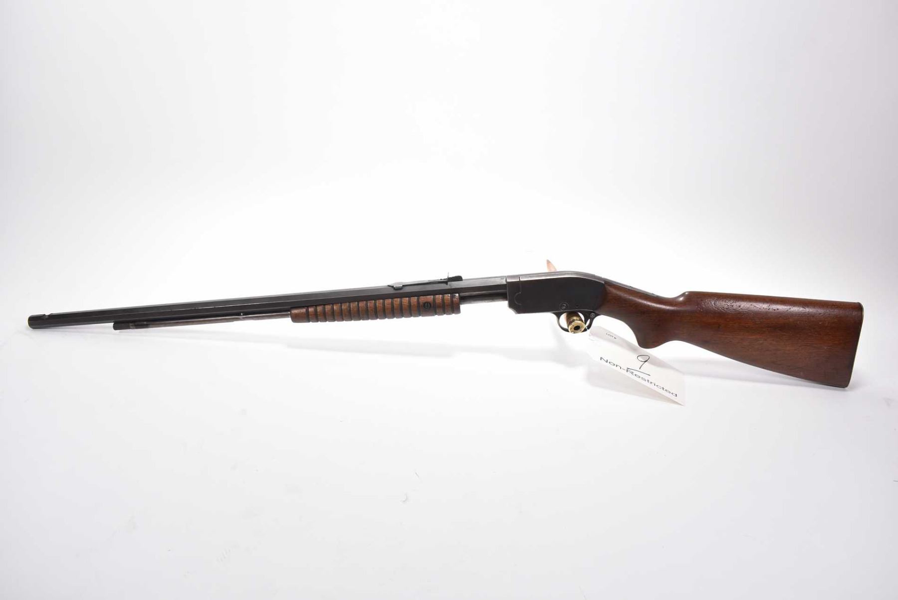 Savage Model 25 .22 LR Cal Tube Fed Pump Action Rifle w/ 24" octagon bbl [ fading blue finish turning brown in some areas, missing front sight, plain pistol grip stock w/ grooved forewood, Savage metal butt plate, age crack on right side behind receiver upper tang, various marks and scratches to wood and metal ] Ser # 14188