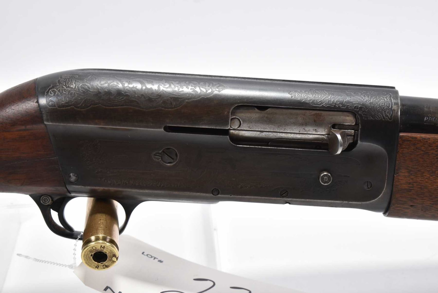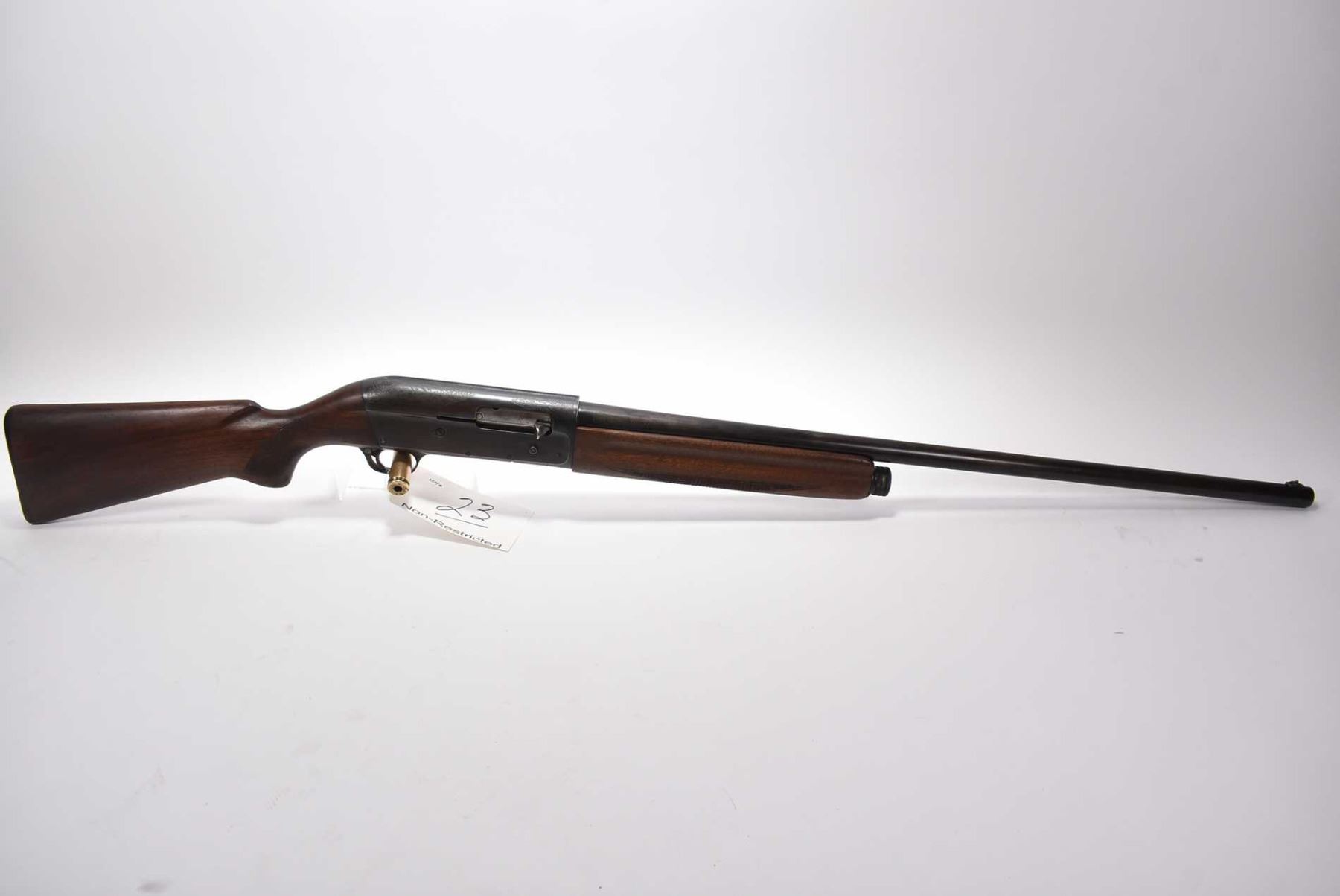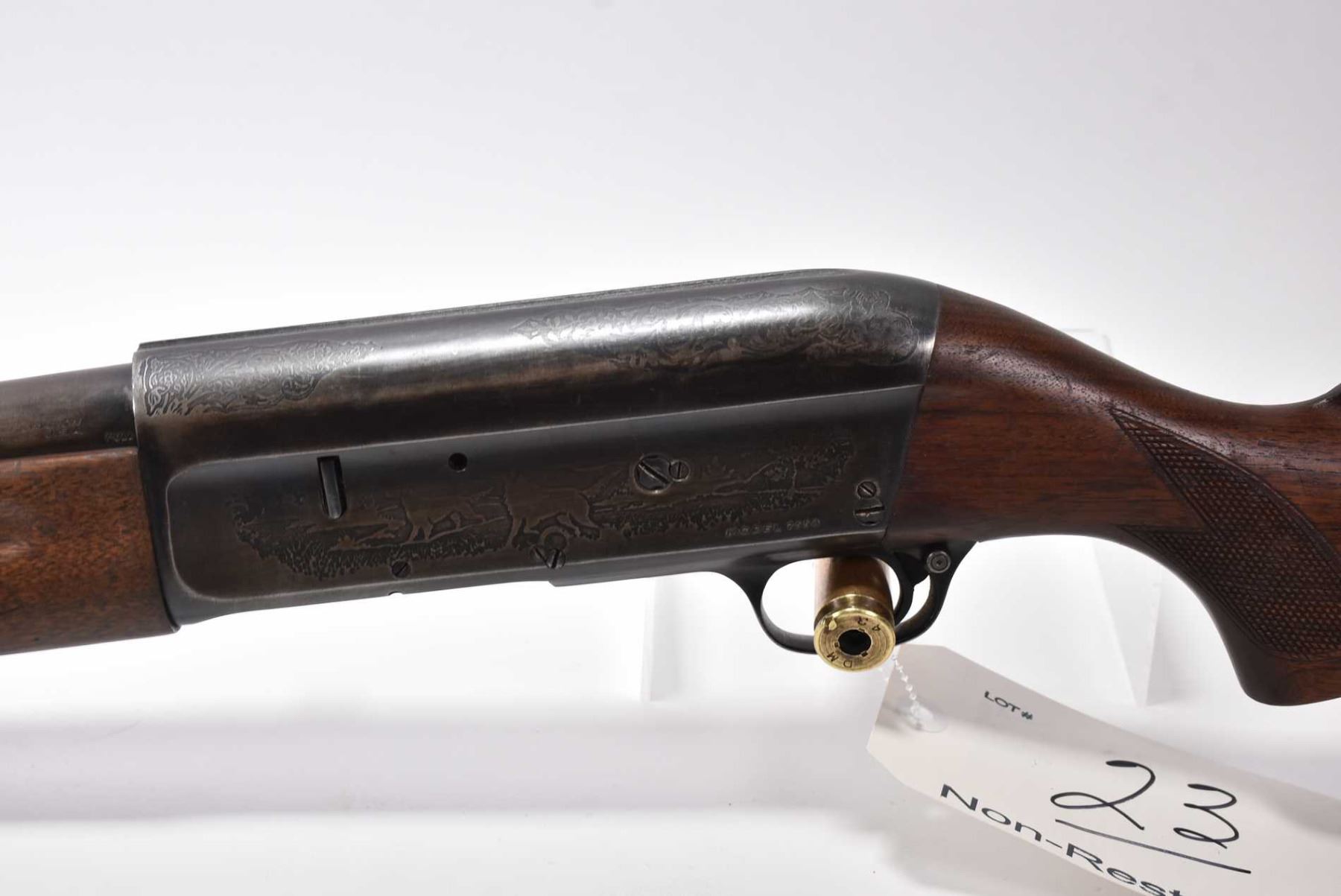 Savage Model 755 A .12 Ga 2 3/4" Semi Auto Shotgun w/ 30" bbl [ fading blue finish, bird scene and dog scene on receiver, checkered pistol grip stock and forend, various marks and scratches to wood and metal , small chip and cracks behind receiver ] Ser # 603581