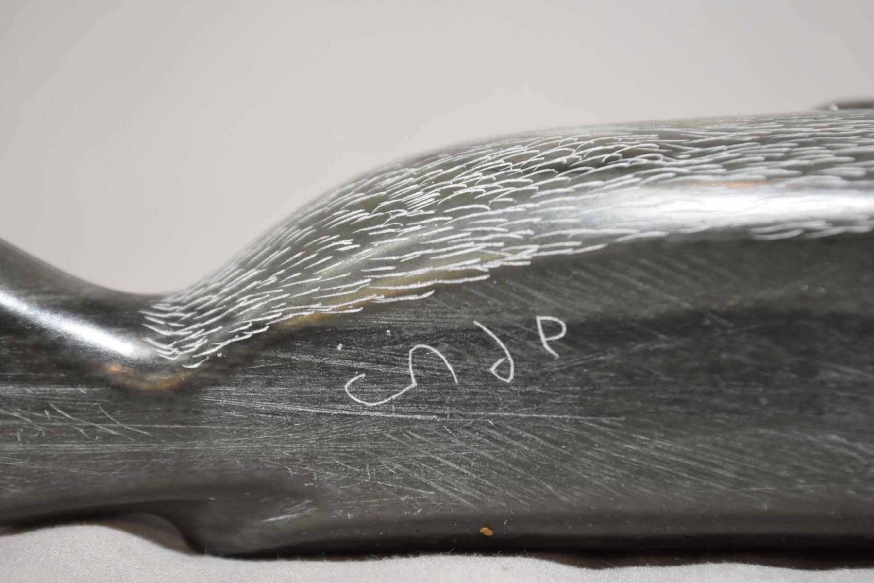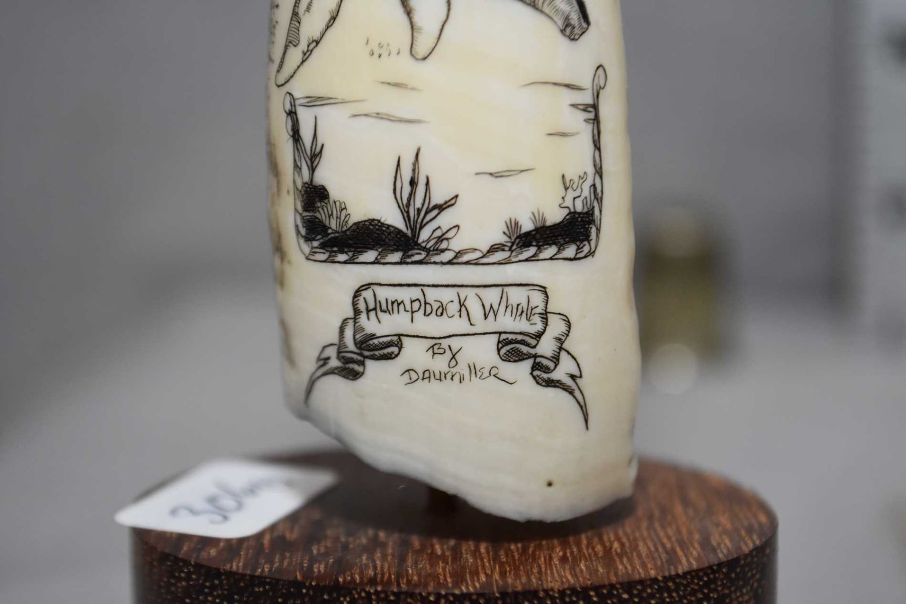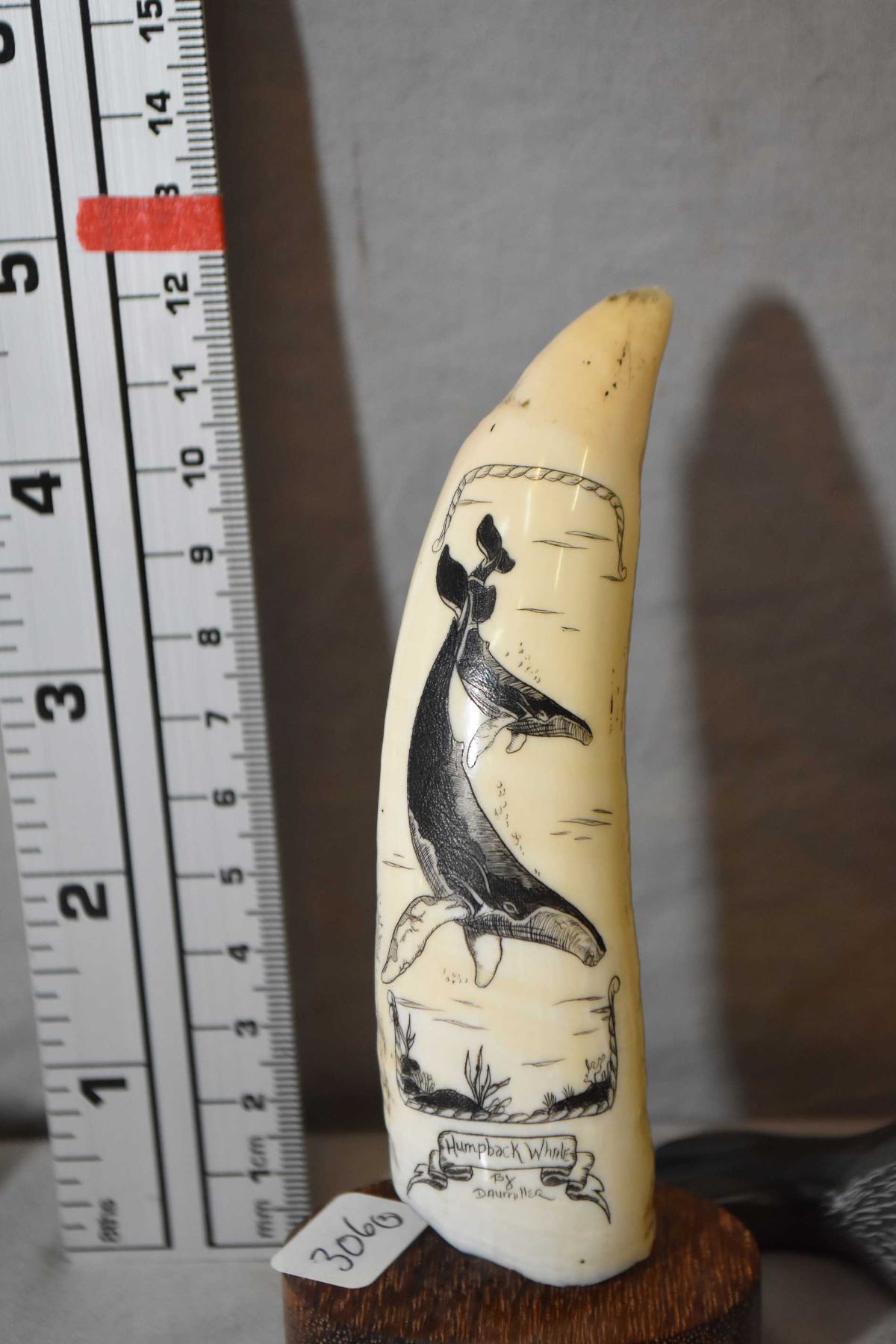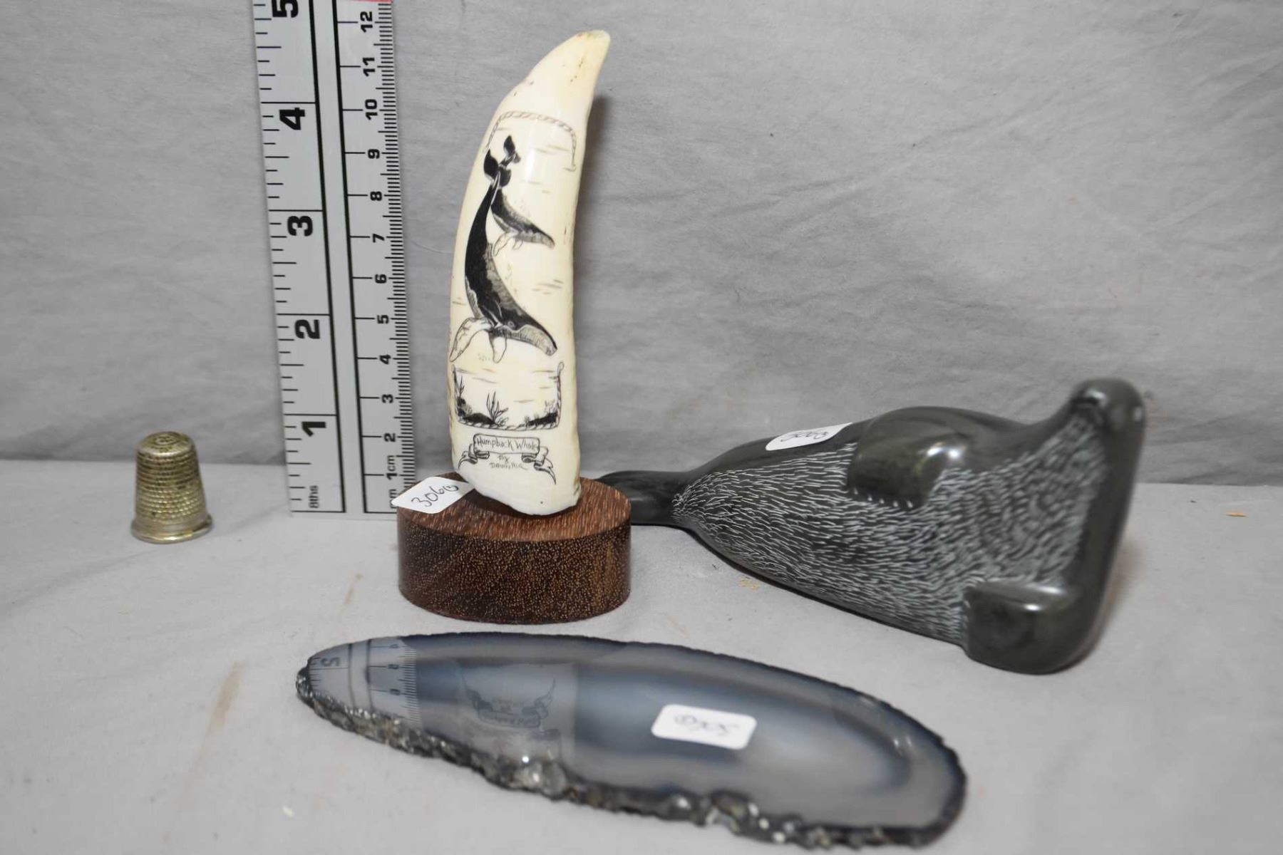 Scrimshaw whale tooth "Humpback Whale" signed by artist Daurniller, plus a carved soapstone 6" in length and a slivered geode