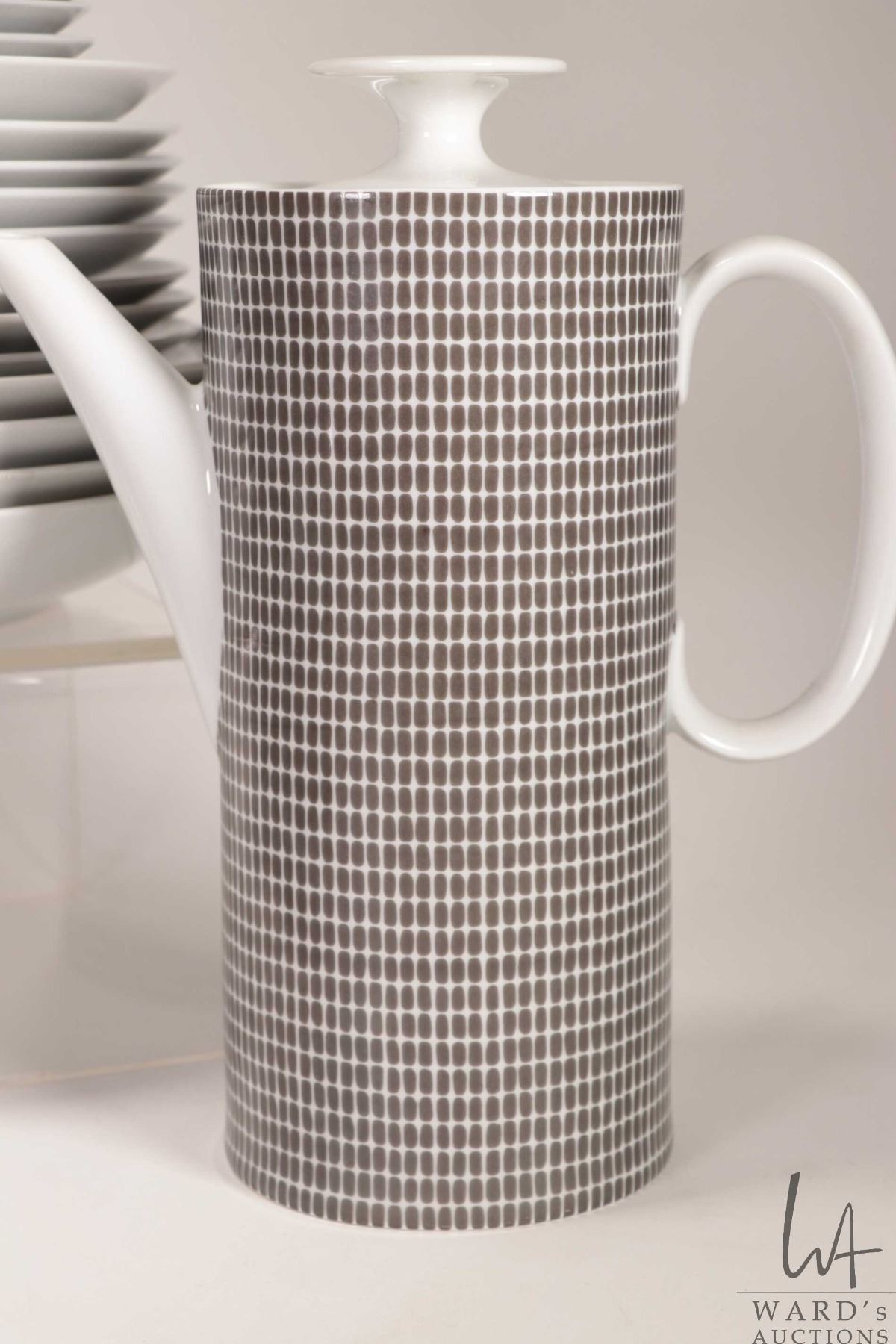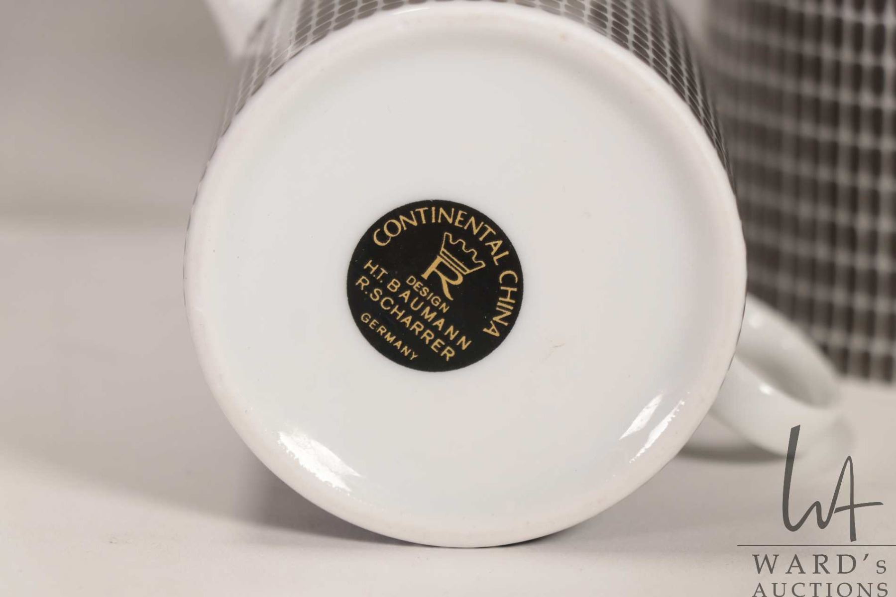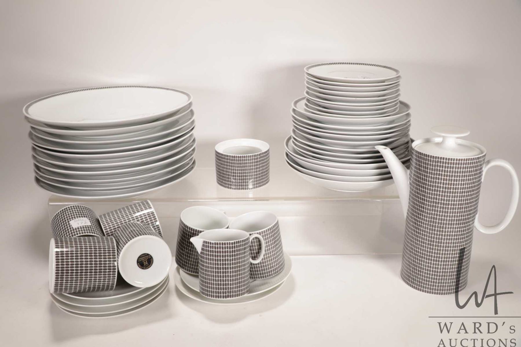 Selectin of Continental China German dinnerware including ten 10 1/2" plates, nine 7 1/2" plates and 6" plates, six teacups and saucers, four soup bowls, teapot, note: small chip on inside of teapot lid, cream and sugar bowl