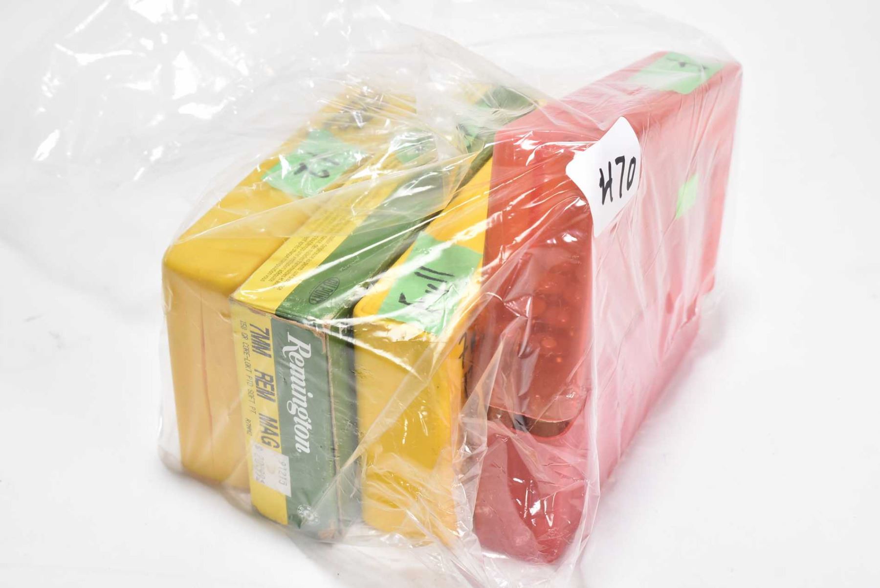 Selection 7mm Rem mag ammunition including a 20 count box of Remington, two full 20 count boxes of reloads plus one box containing 12 reloads