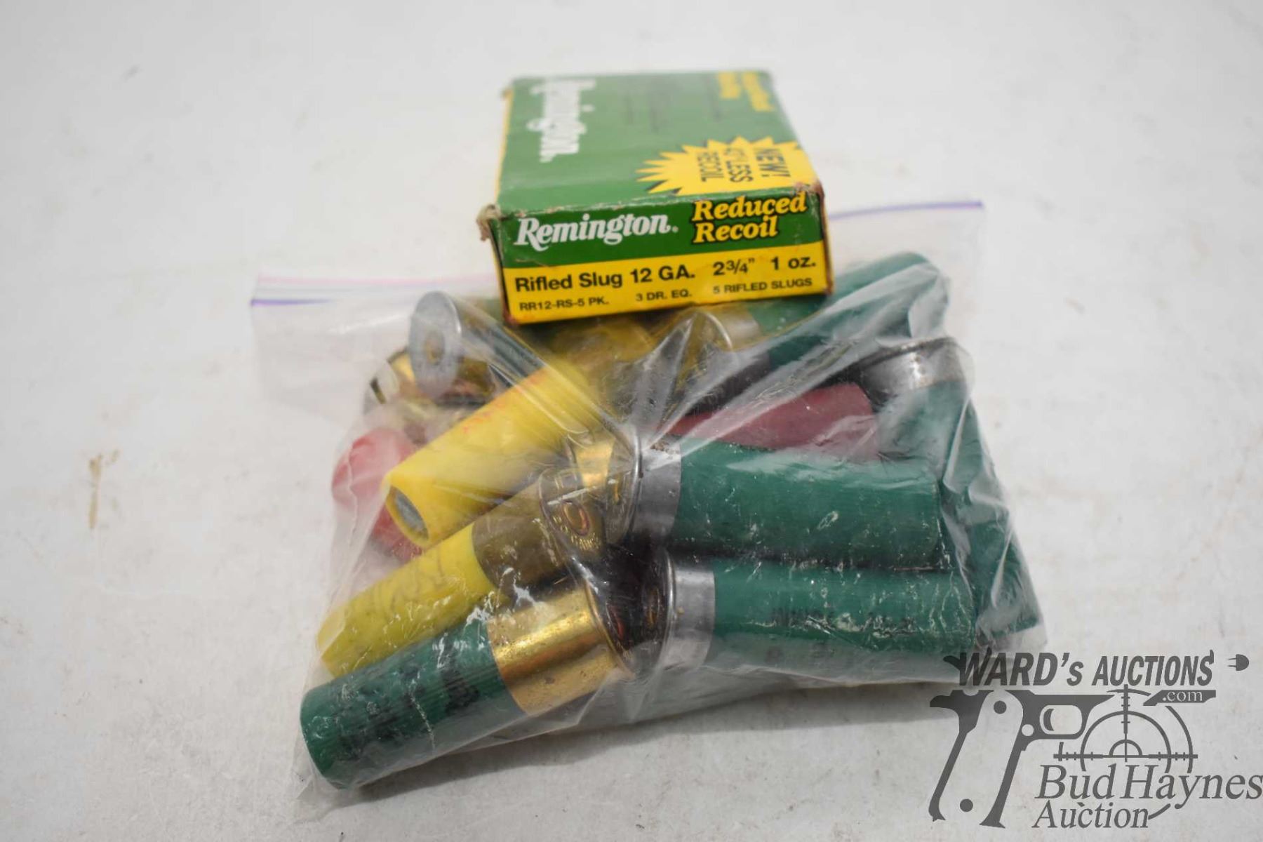Selection of 12 GA ammo including full 5 count box Remington 2 3/4" rifled slugs and a bag w/ 13 ass