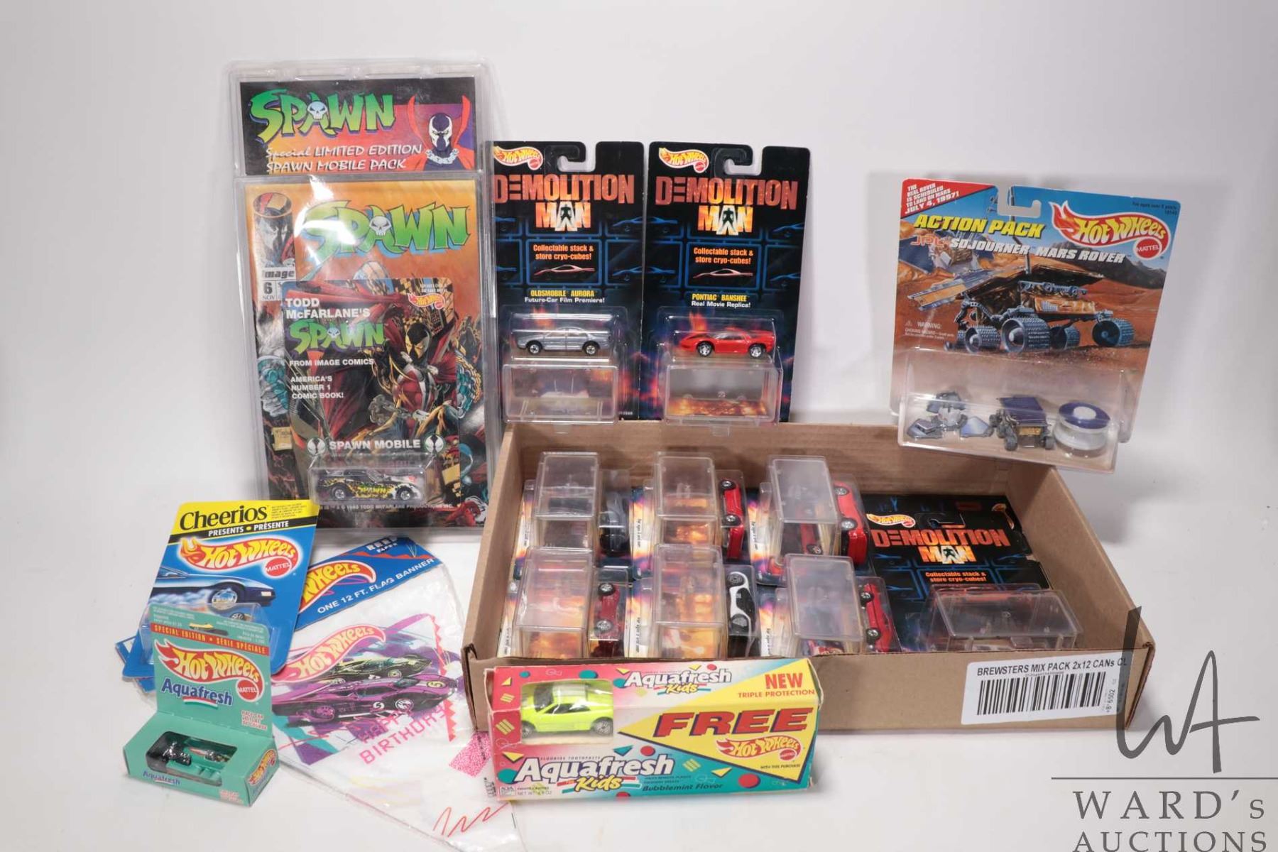Selection of 14 Hot Wheels including 8 Demolition Man, 2 Aquafresh, a Mars Rover, Cheerios, Spawn w/ comic book and birthday banner