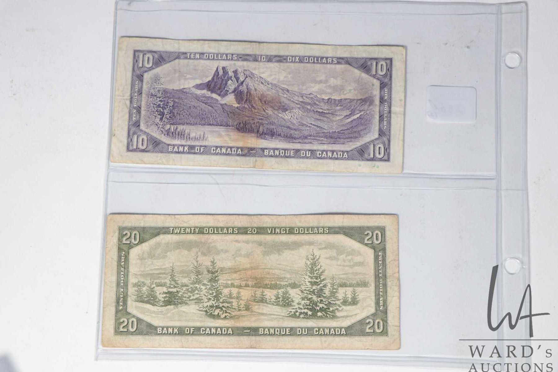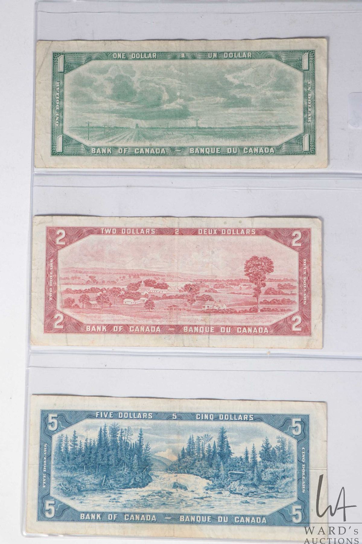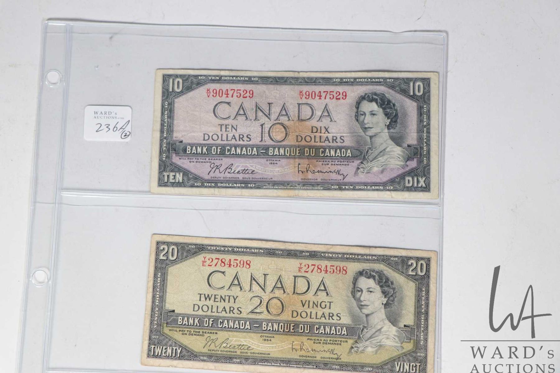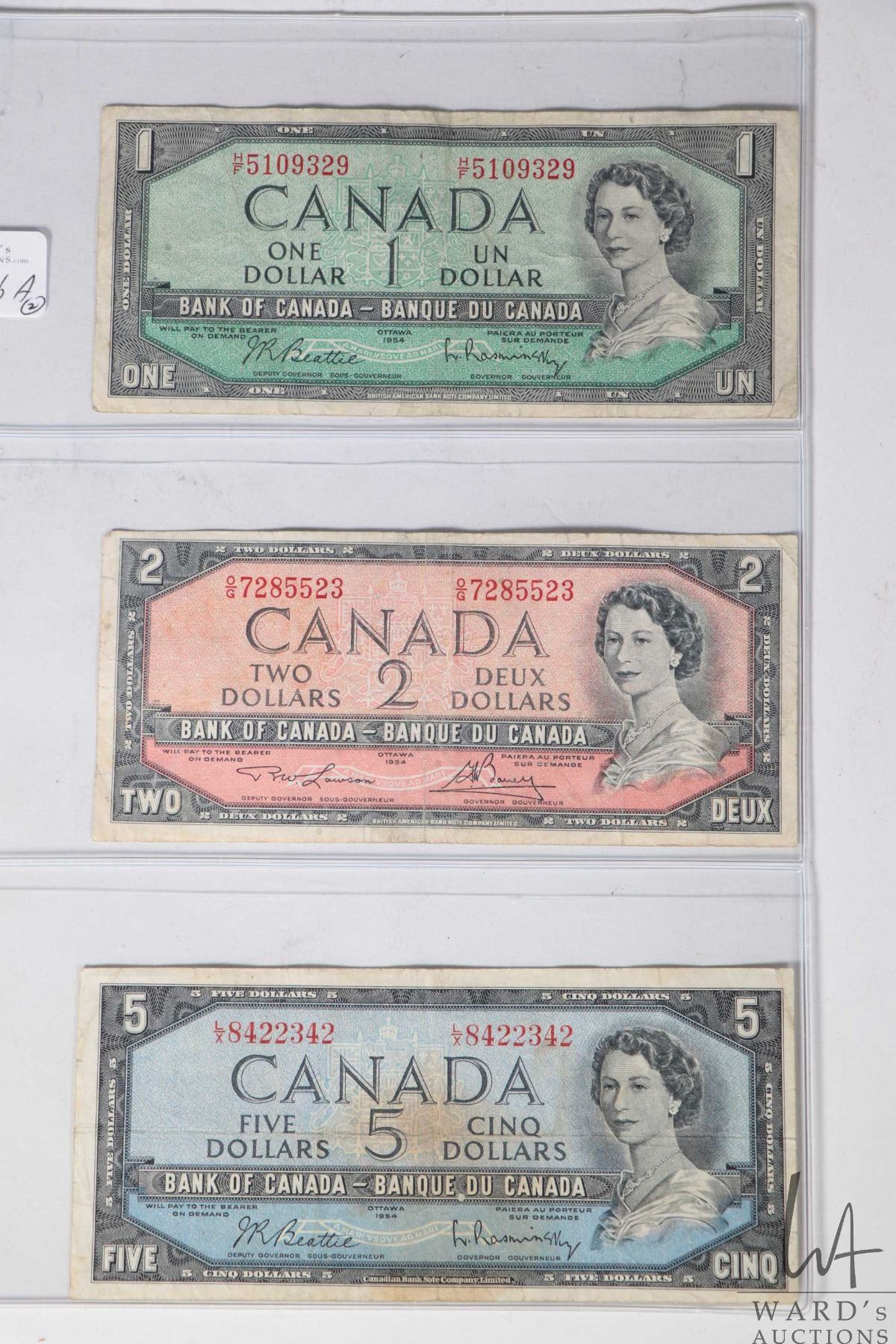 Selection of 1954 Canadian bank notes including one, two, five and twenty dollar denominations, in used condition