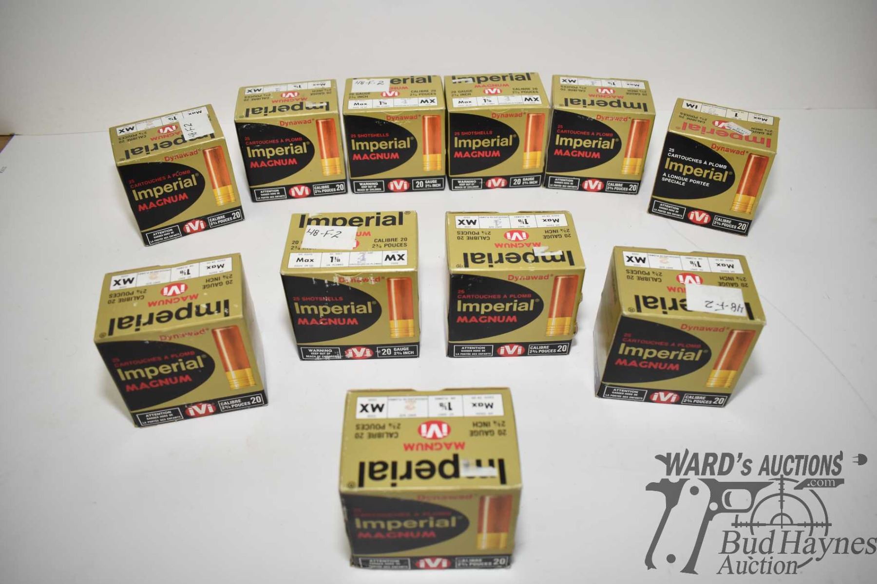 Selection of 20 gauge ammo including six 20 count boxes of 2 3/4" #4, four 20 count boxes of 2 3/4" #2 and one 22 count box of 2 3/4" #5