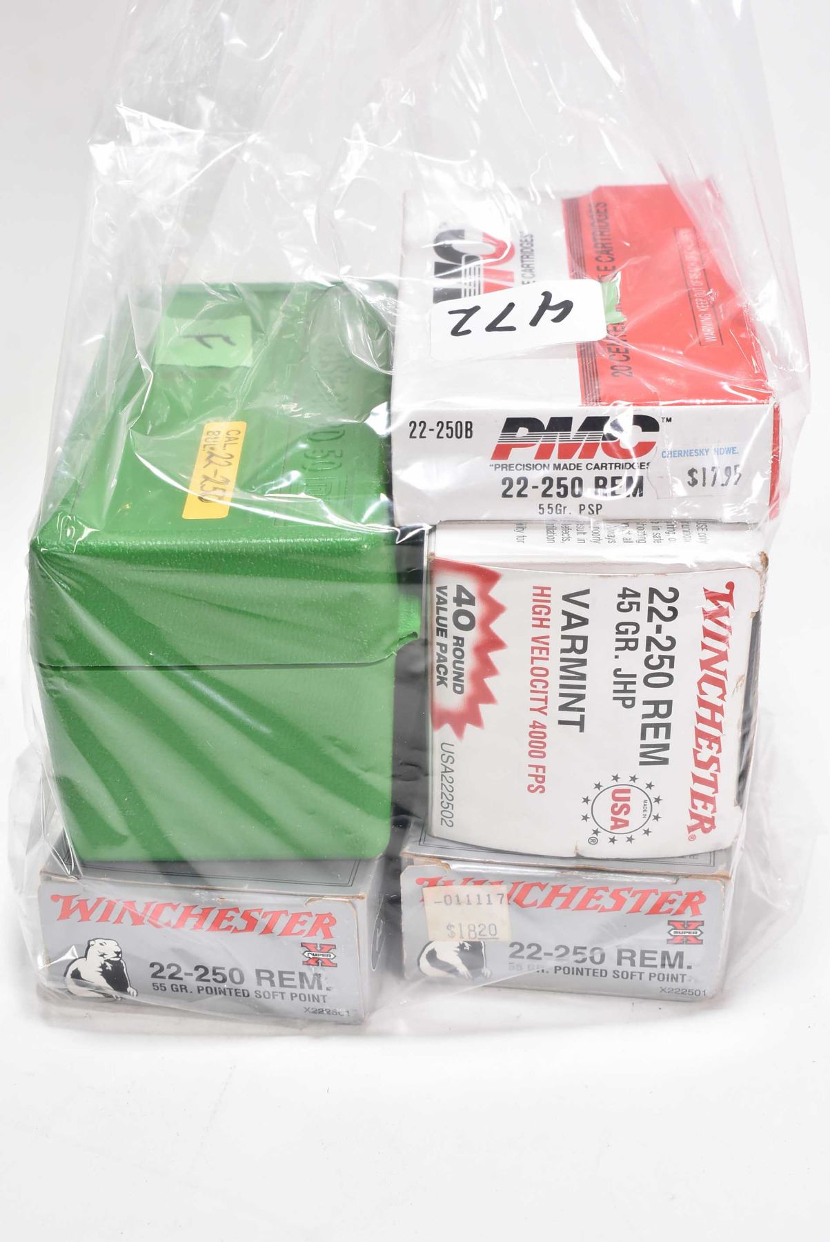 Selection of .22-250 Rem ammunition including two 20 count boxes of 55 grain, a box of 40 count of Winchester 45 grain ( includes 9 reloads), a full 20 count box of PMC 55 grain, a 50 count green ammunition box of reloads