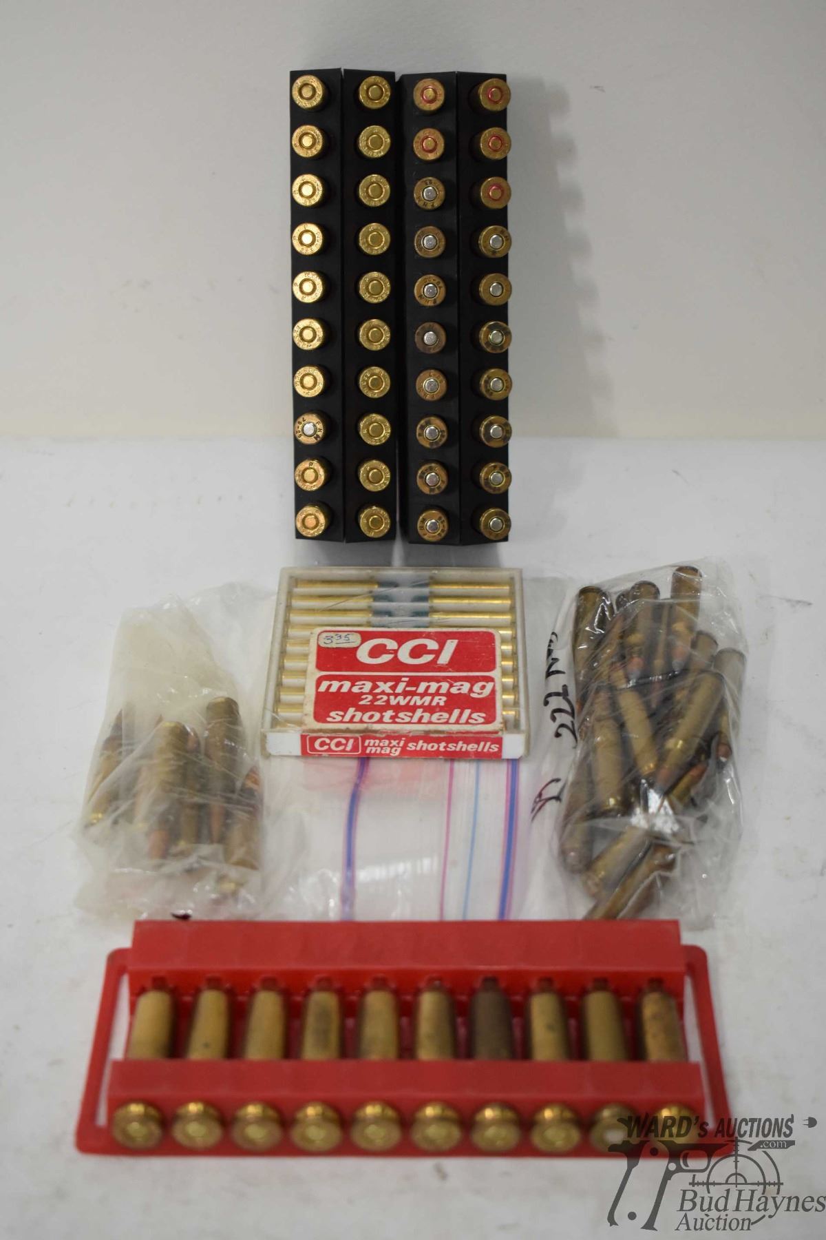 Selection of .22 cal ammo including 20 count pack of CCI maxi-mag .22 WMR shot shells, 19 .222 rem, 21 5.56, 25 .223 rem and 10 .22-250. Note: Some are reloads