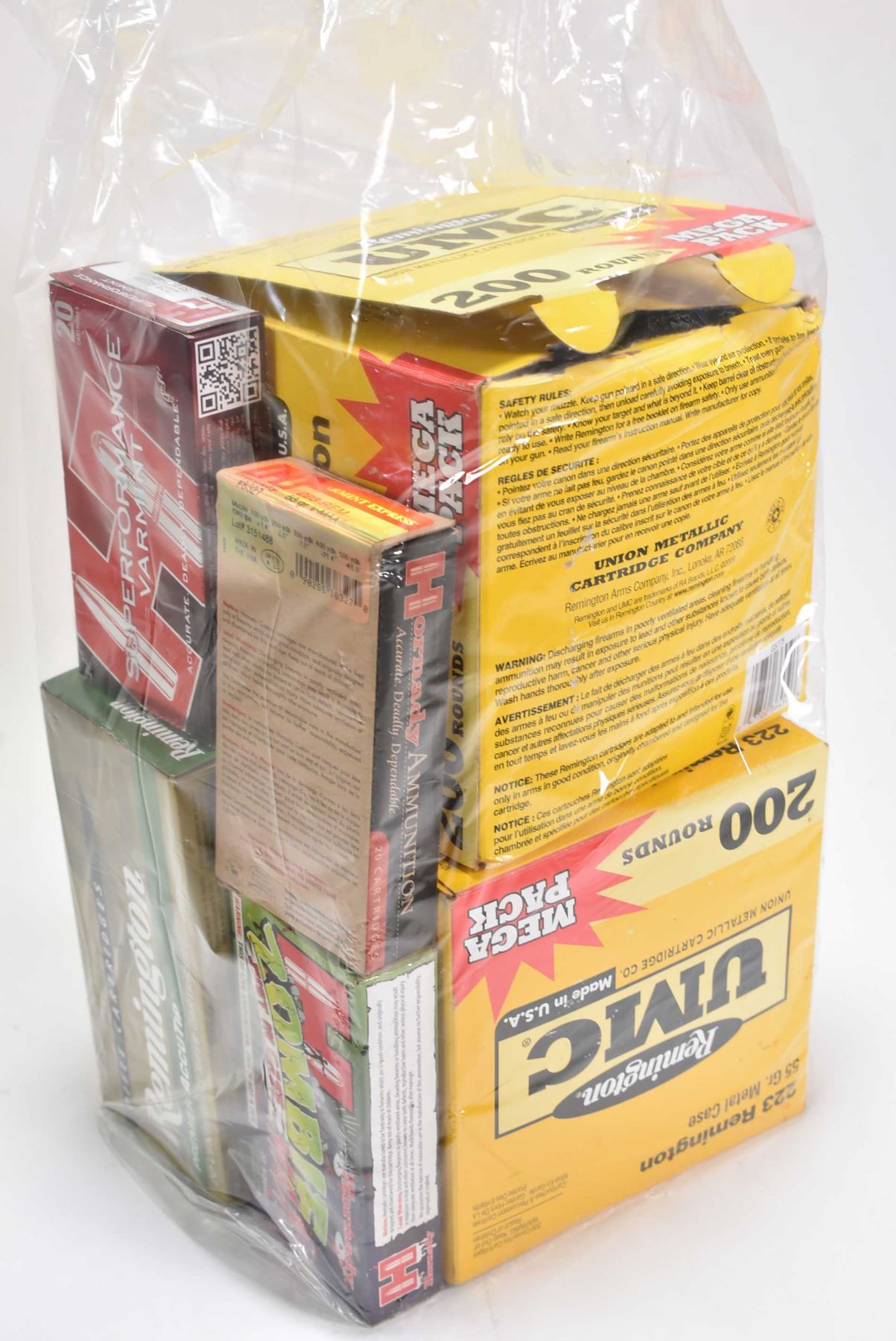 Selection of 223 ammunition including full 200 round box of Remington 55 grain and approximately 150 count of Remington 45 grain, plus a full 20 count box of Remington 50 grain, a full 20 count box of Hornady 55 grain, a full 20 count box of Hornady 53 grain and full 20 count box of Hornady Zombie Max 55 grain