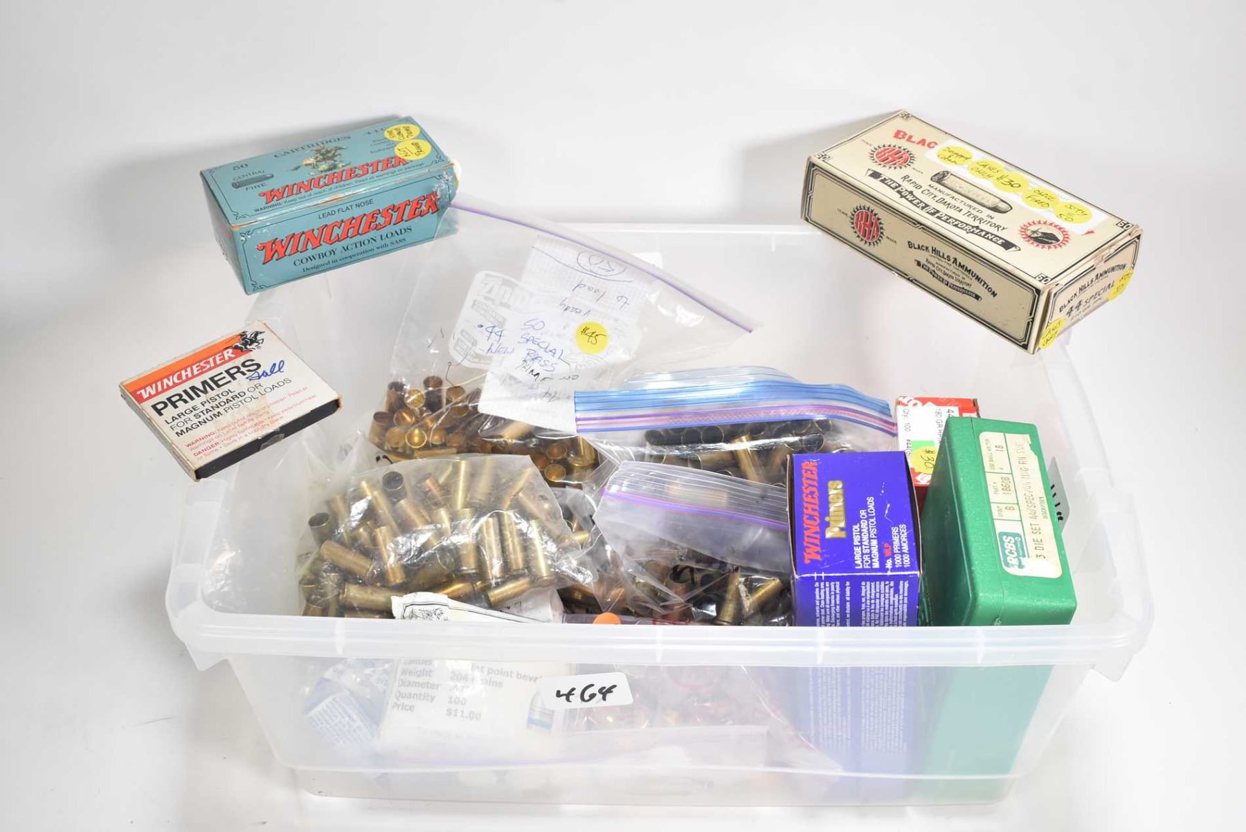 Selection of .44 cal reloading supplies including brass, lead, primers and dies
