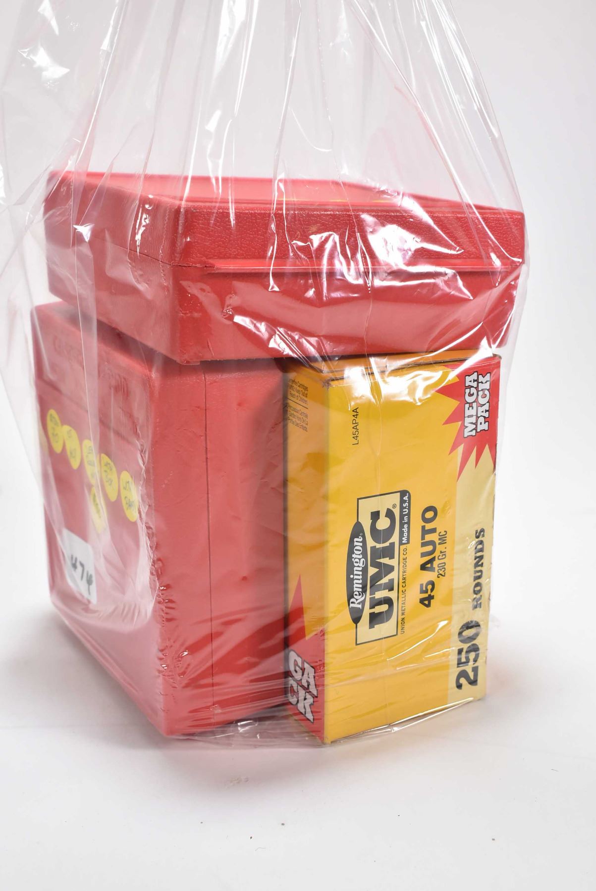 Selection of 45 auto ammunition including a 250 count box of Remington 230 grain, a two plastic ammo. boxes containing approximately 190 reloads