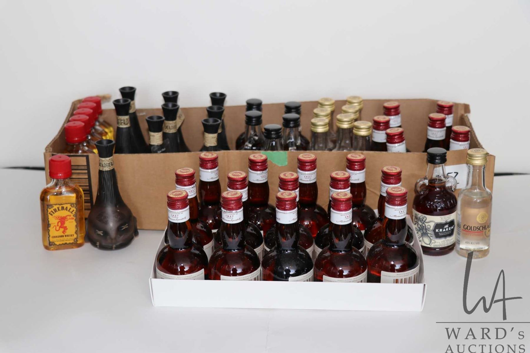 Selection of 50ml bottles including 20 Grand Marnier / 40% ABV, 8 Goldschlager / 40% ABV, 6 The Kraken / 47% ABV, 9 Dead Head Rum / 40% ABV and 6 Fireball Whisky / 33% ABV Note: Alcohol cannot be insured by any courier in Canada. Local pick up is recommended. Canadian bidders only