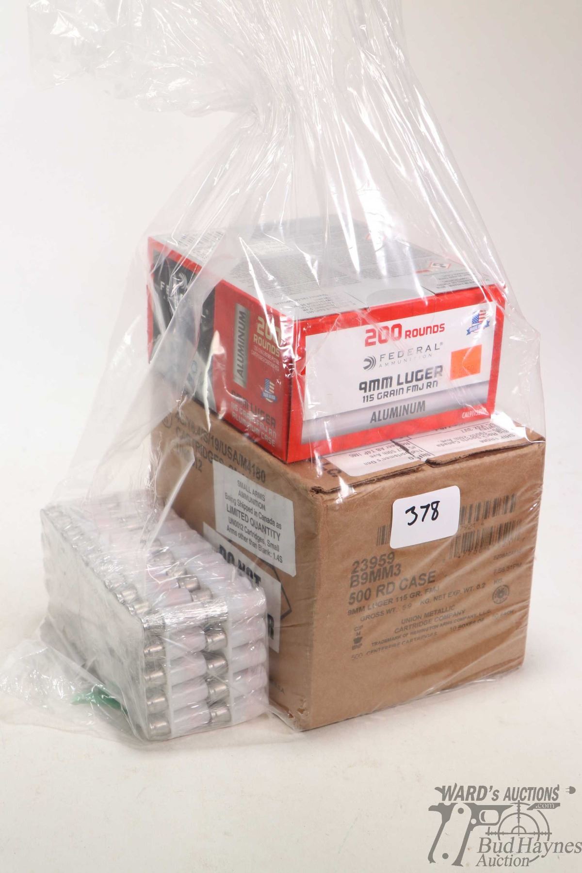 Selection of 9mm ammo including ten 50 count boxes of Remington Military Law Enforcement Division Training ammunition 9mm Luger 115 grain FMJ, 200 count box of Federal 9mm Luger 115 grain FMJ round nose aluminum case, plus a 100 rounds of 9mm reloads