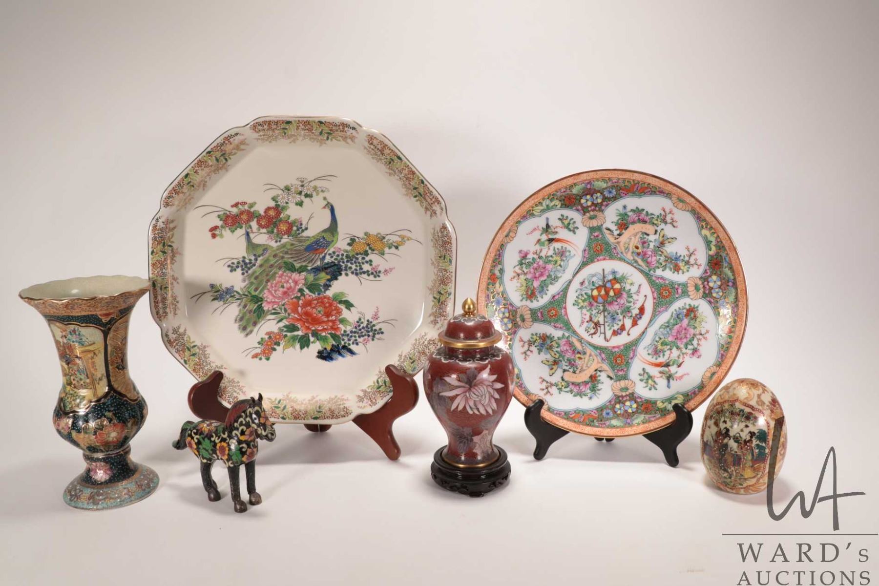 Selection of Asian collectibles including Cloissone ginger jar and horse, Peacock motif plate and famille verte charger, Satsuma style egg and 8" vase