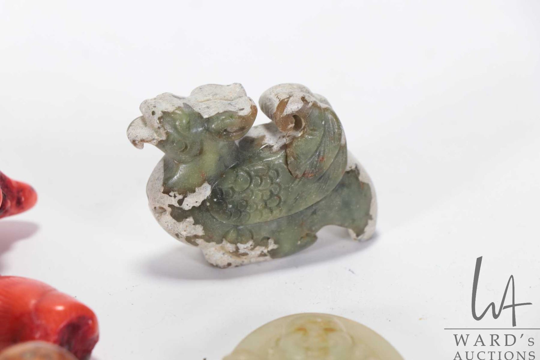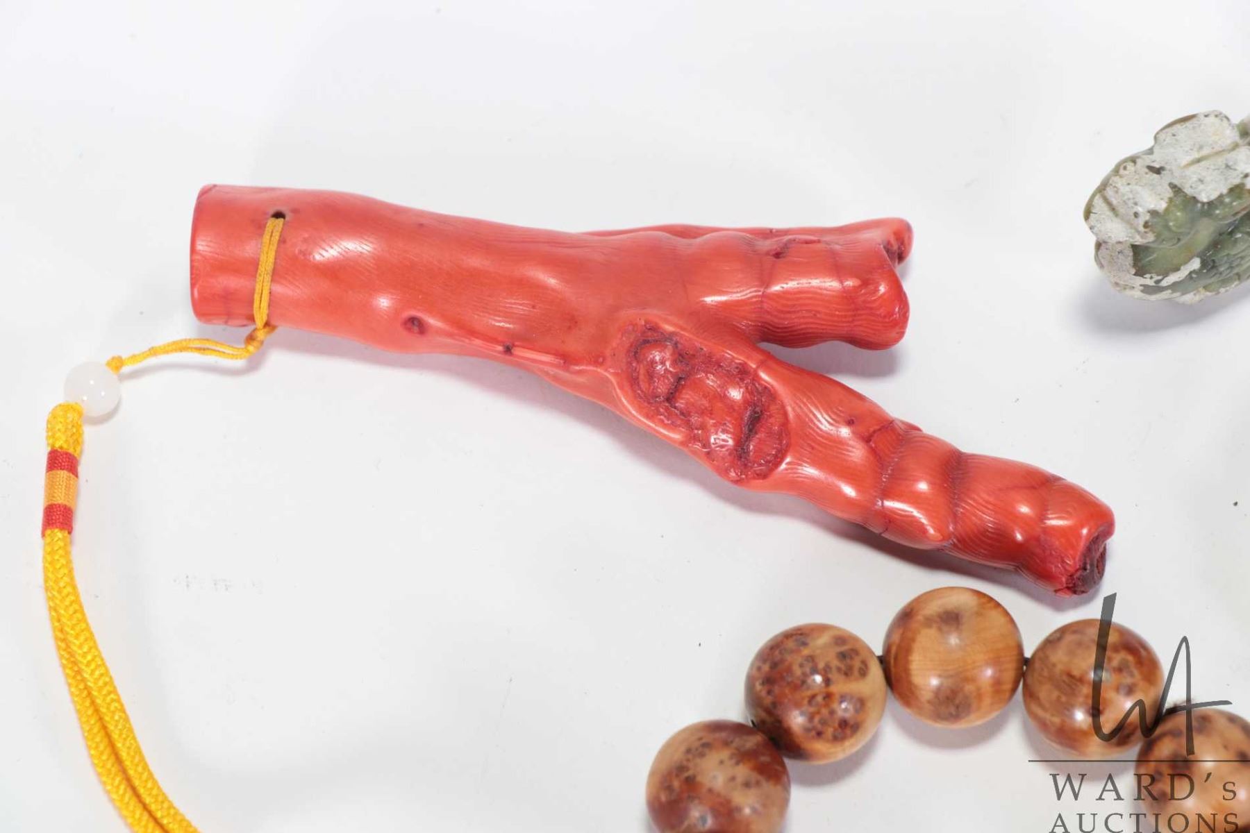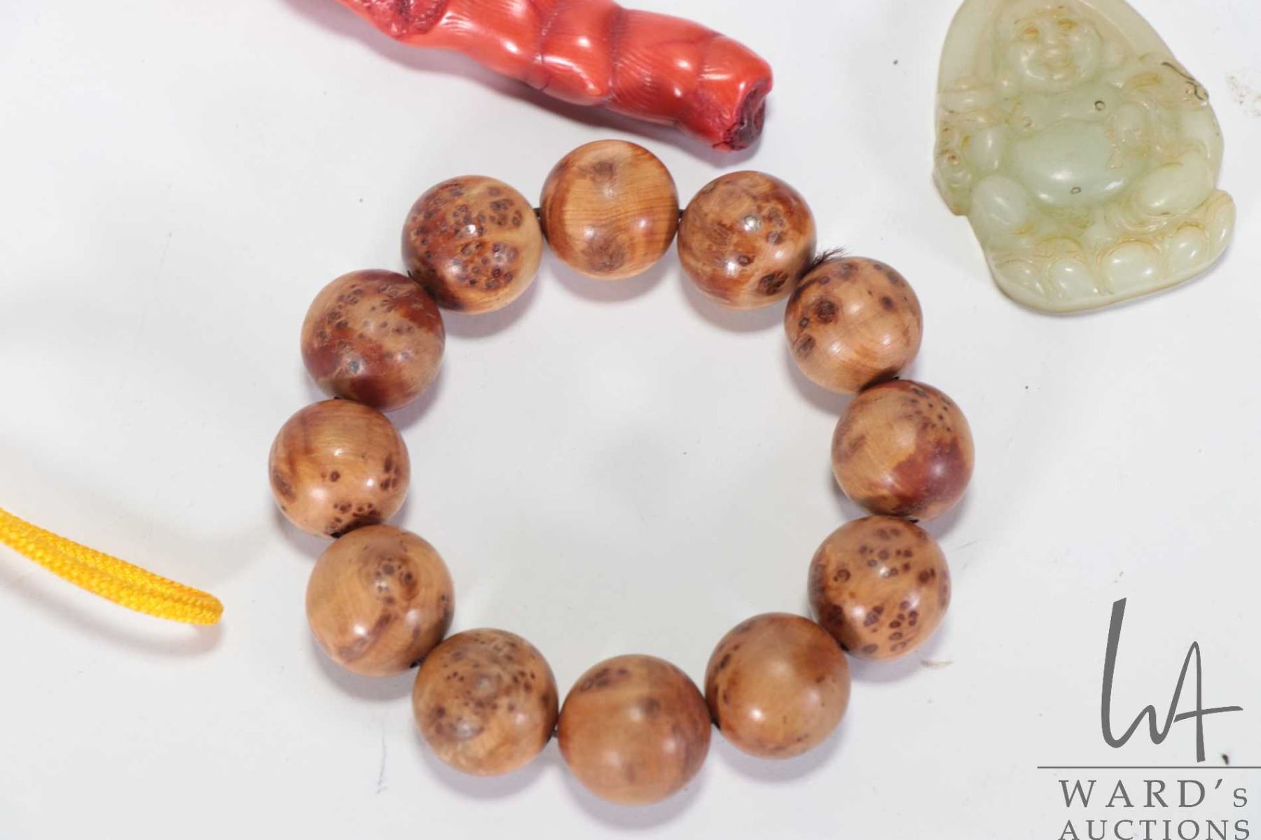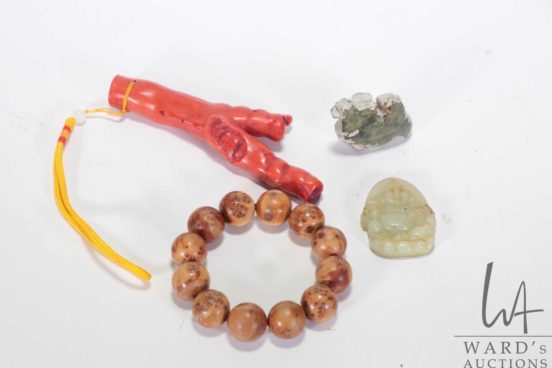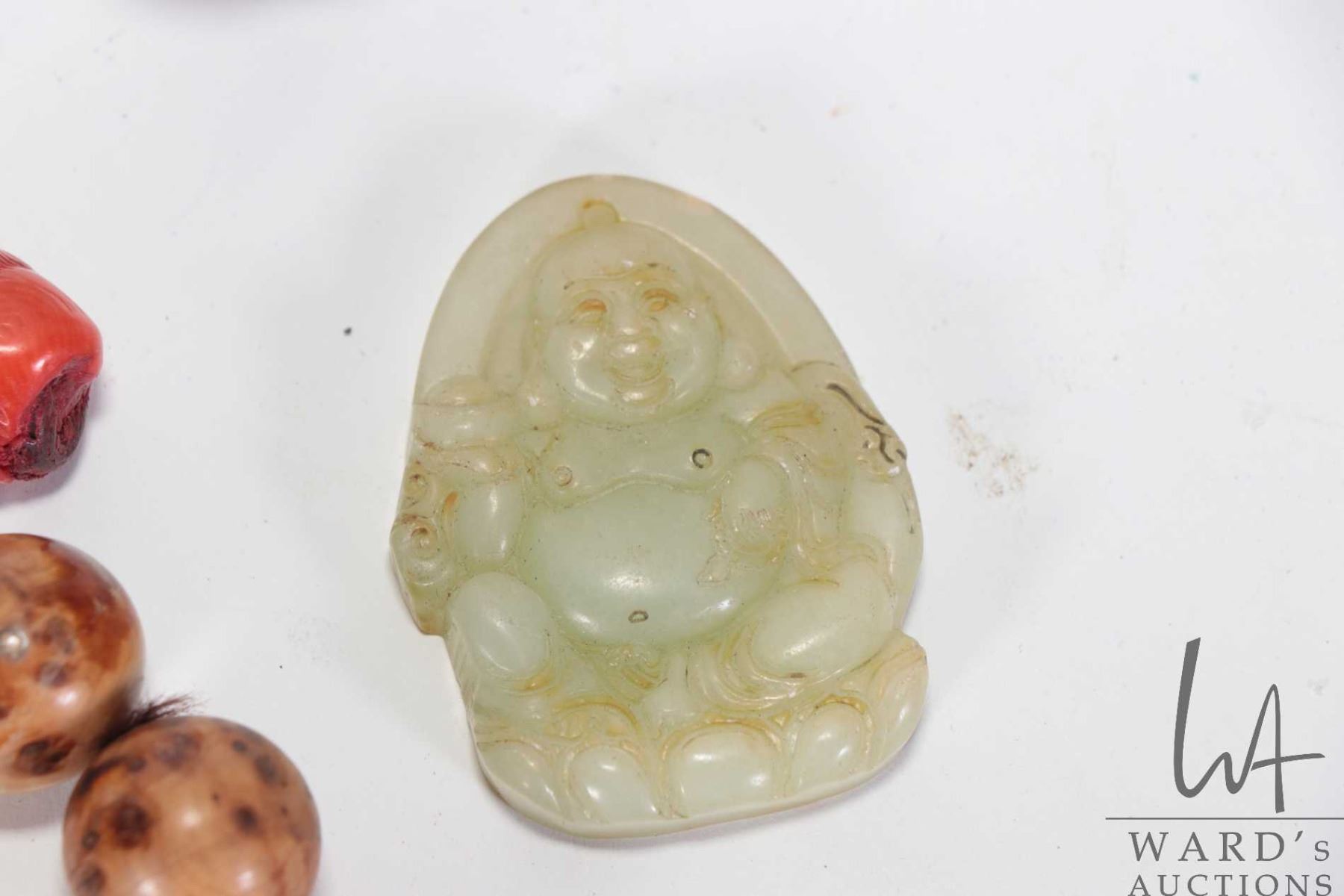 Selection of Asian collectibles including Sino-Japanese red coral style pendant 5 1/4", two mottled jade/ jadeite pendants and a sandalwood beaded bracelet